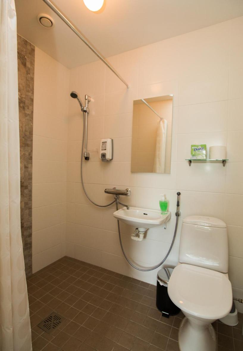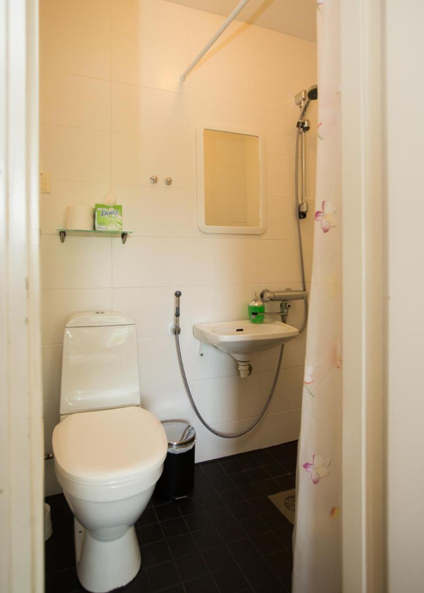 WC lavuaarin ja hanan sijoittelu on ahdas, toteutettu samalla vesihanalla kuin suihku. Hankala pestä edes käsiä tai ainakaan kasvoja tms. laajemmin lavuaarin äärellä.