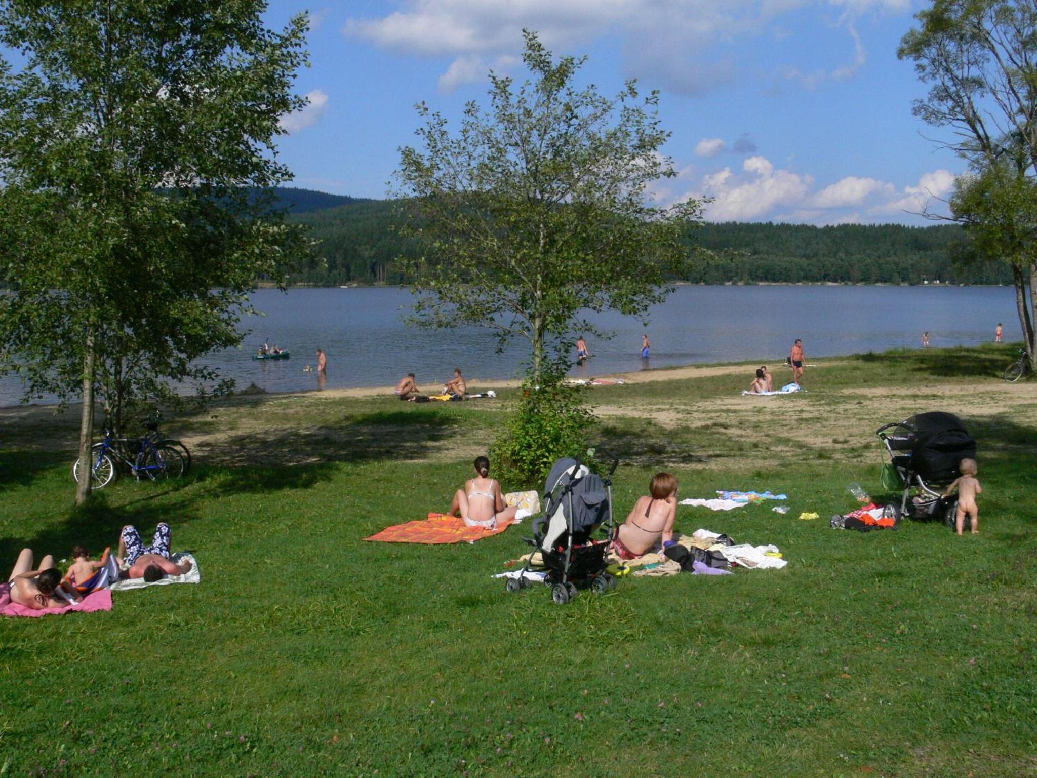 Bei niedrigem Wasserstand muss man im See sehr weit hinausgehen, um schwimmen zu können. tw. schlammig.