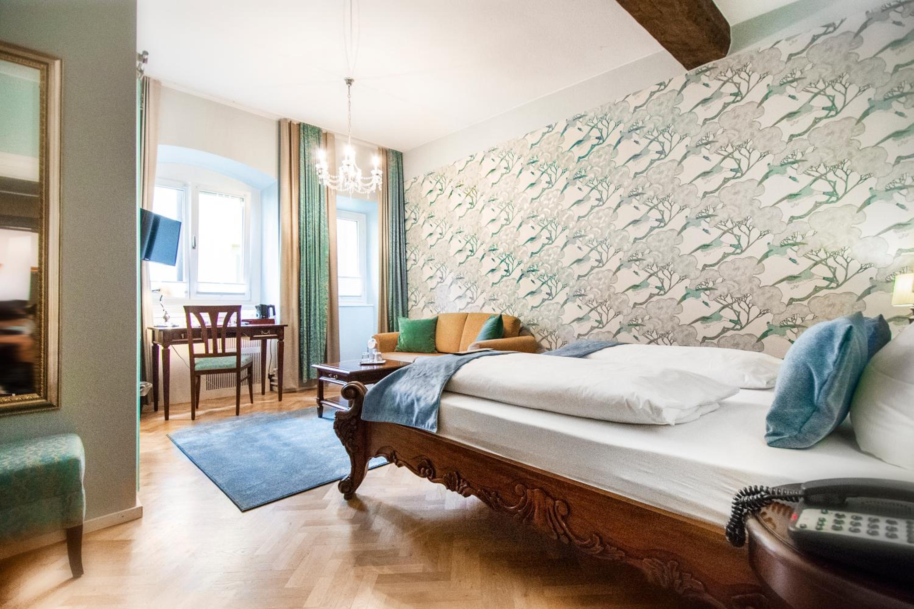 Das Zimmer fühlte sich an wie ein Fürstenzimmer. Es war sehr geräumig und vermittelte eine Burg-Atmosphäre. Unser Sohn hatte ein Bett mit Matratze (statt eines bezogenen Sofas). Das haben wir sehr als Service geschätzt. Das Zimmer (Suite) war sehr geräumig und ruhig. Beim Frühstück waren die angebotenen Sachen gut (z.B. Bircher-Müsli, Cappuccino, Croissants, Rühreier, weiches Ei ...) und wir hatten einen angenehmen Tisch. Das hat gut gepasst. Für uns ist dieses Hotel mit seinem eigenen Charme hervorstechend ... und die Lage - inmitten der Altstadt - war toll!