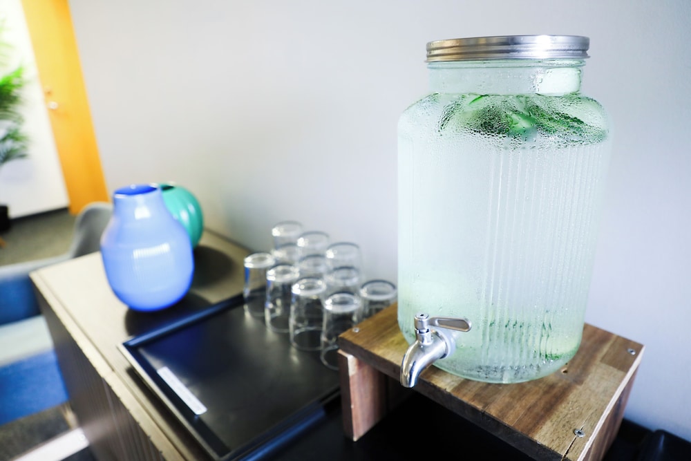 Free lemon water & nice seating area in the hallway..