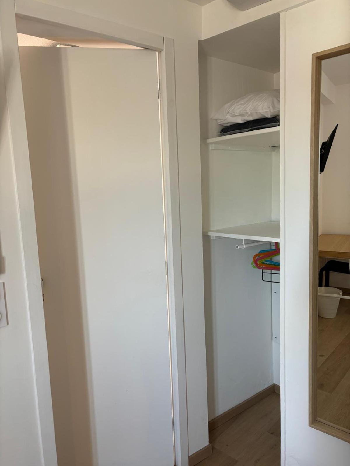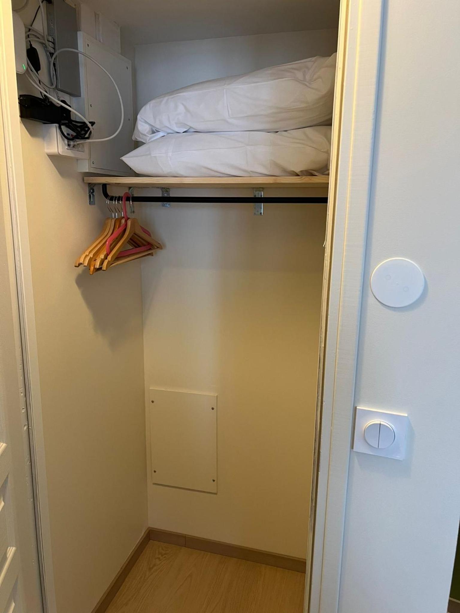 Chambre un peu petite et manque de rangements. La moquette au sol.