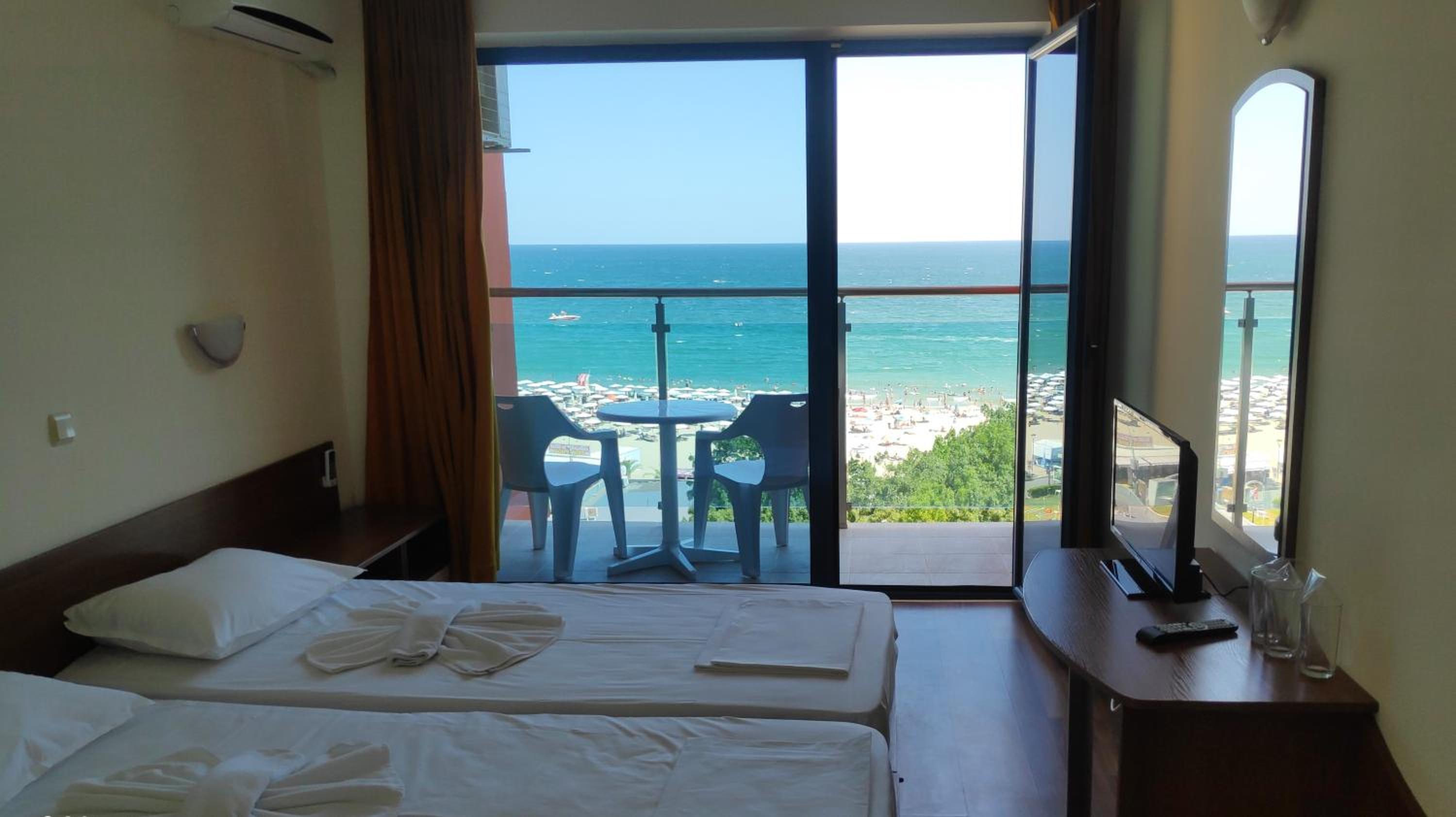 Luxurious Accommodations: Each room at Shipka Beach Hotel offers stunning sea views from a private balcony, along with modern amenities like air conditioning and free toiletries.