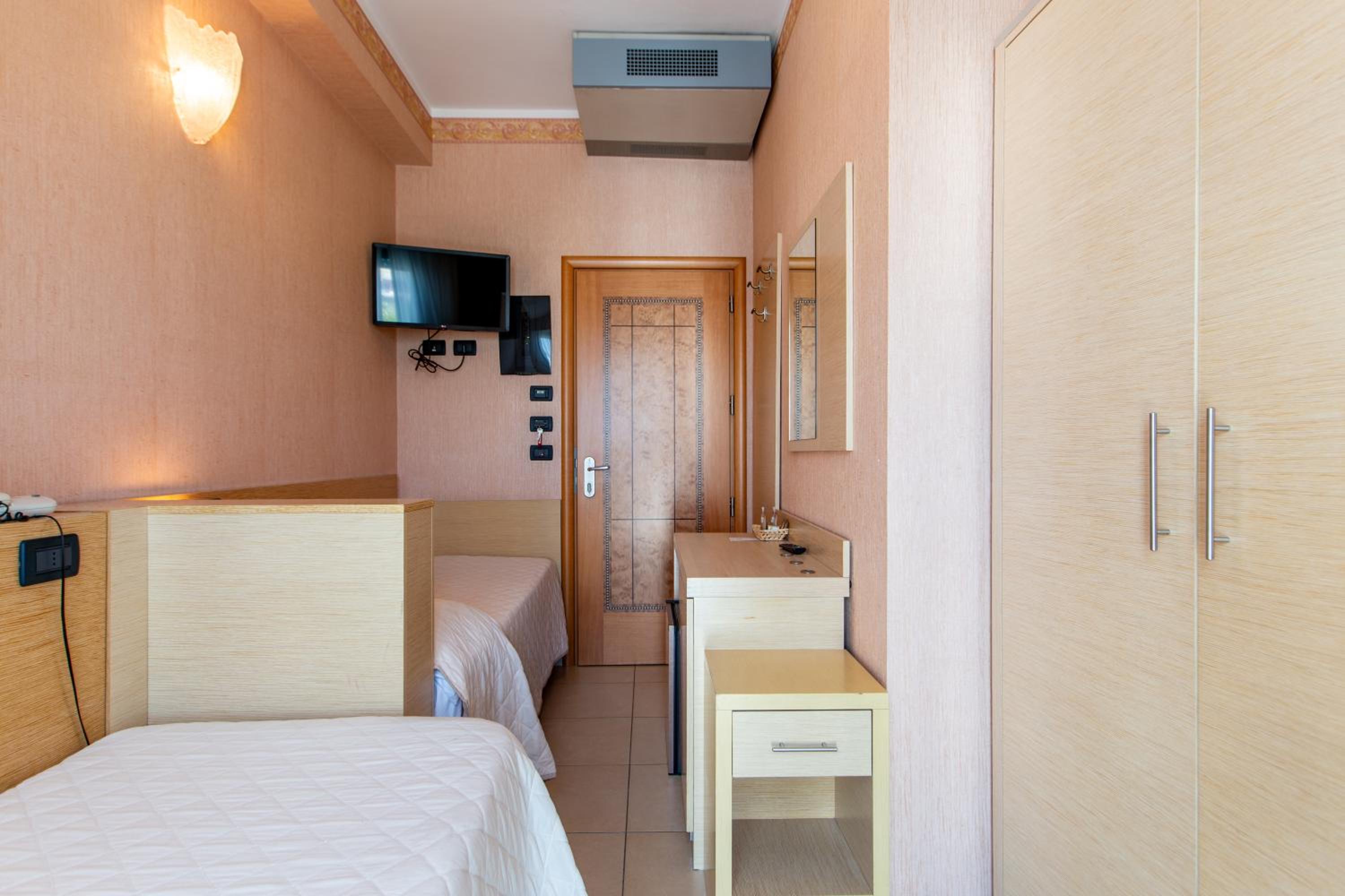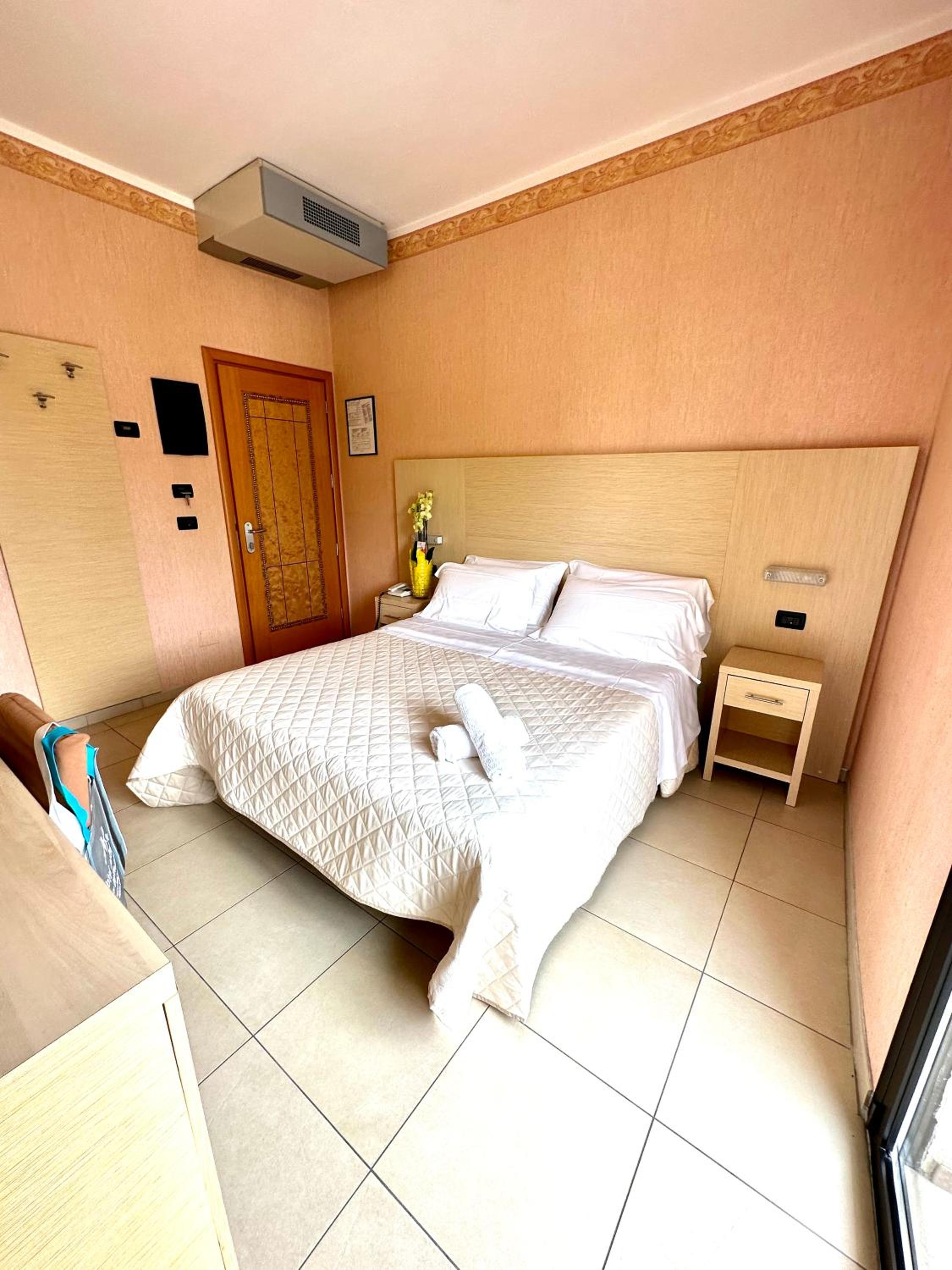 The hotel's rooms are elegantly decorated with wood furniture and light colors, providing a cozy atmosphere for guests. Each room is equipped with modern amenities including air conditioning, a TV, and a balcony, with some rooms offering stunning views of the Adriatic Sea.