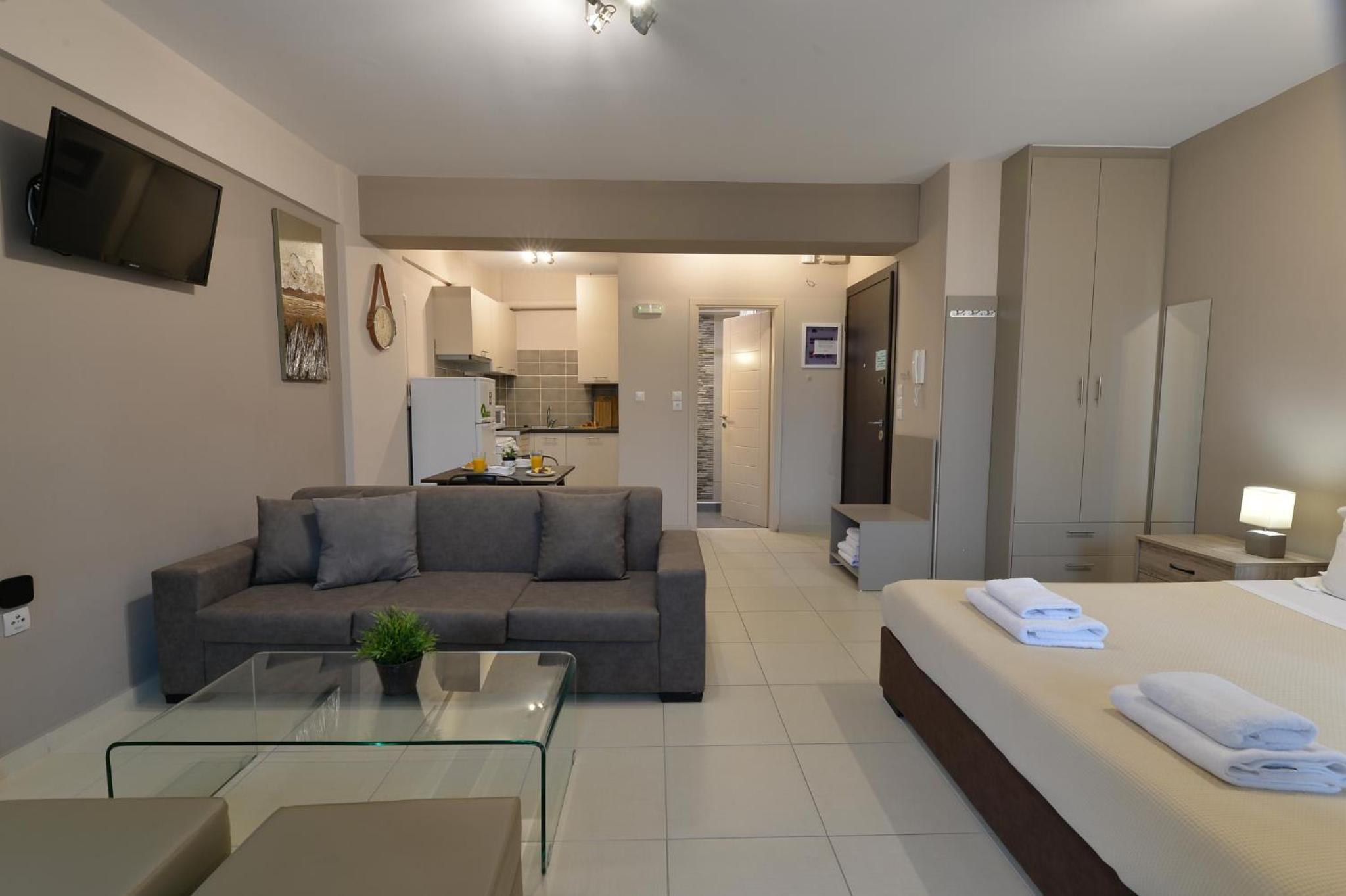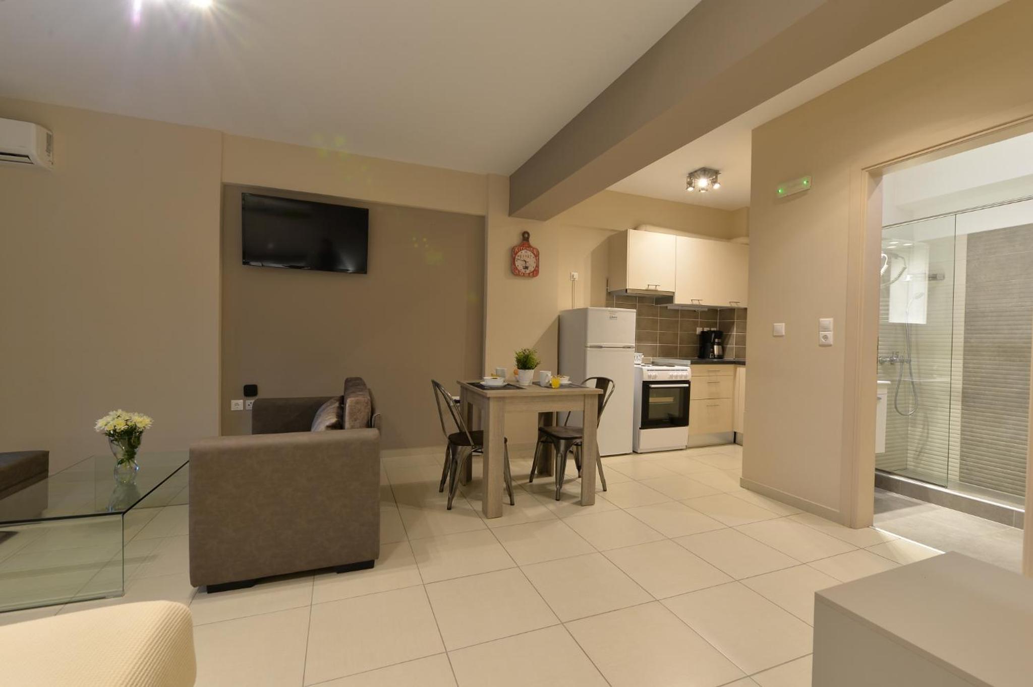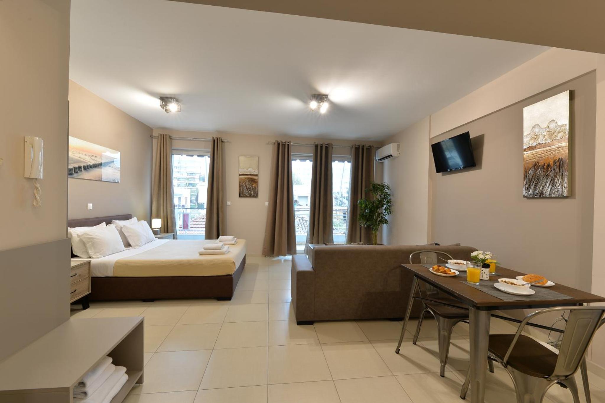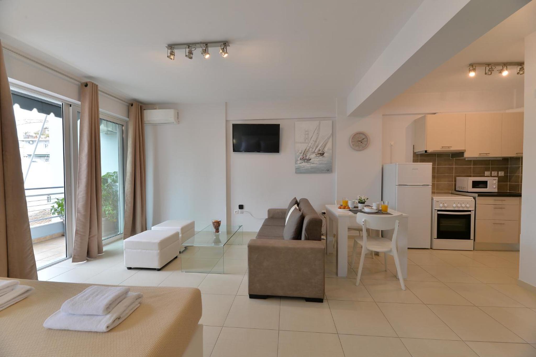 Modern Amenities: Alekos Apartments -Netflix- offers free bikes and free WiFi, ensuring you stay connected and explore the city with ease. The air-conditioned units feature balconies, fully equipped kitchens, and cozy living spaces with flat-screen TVs.