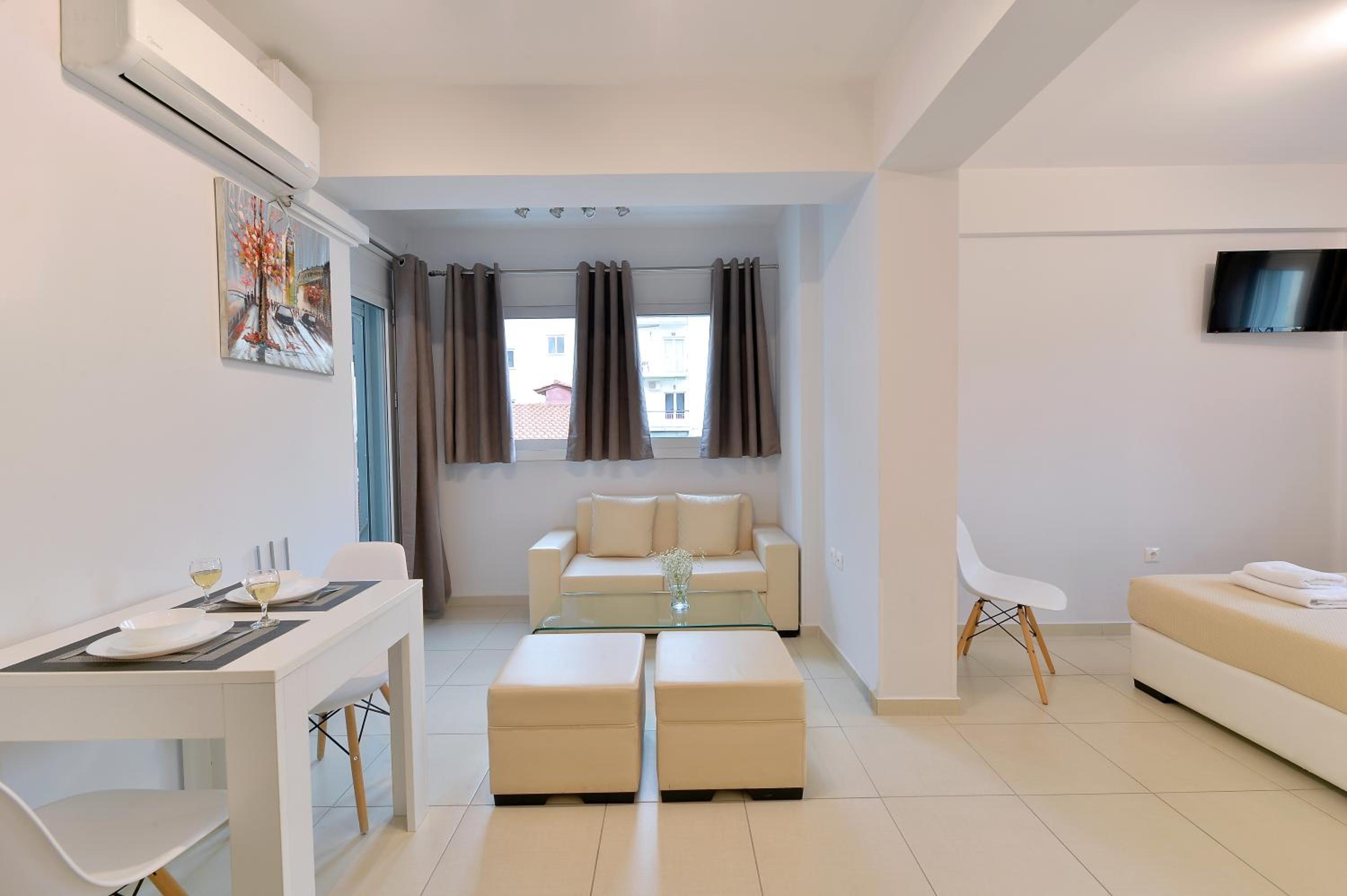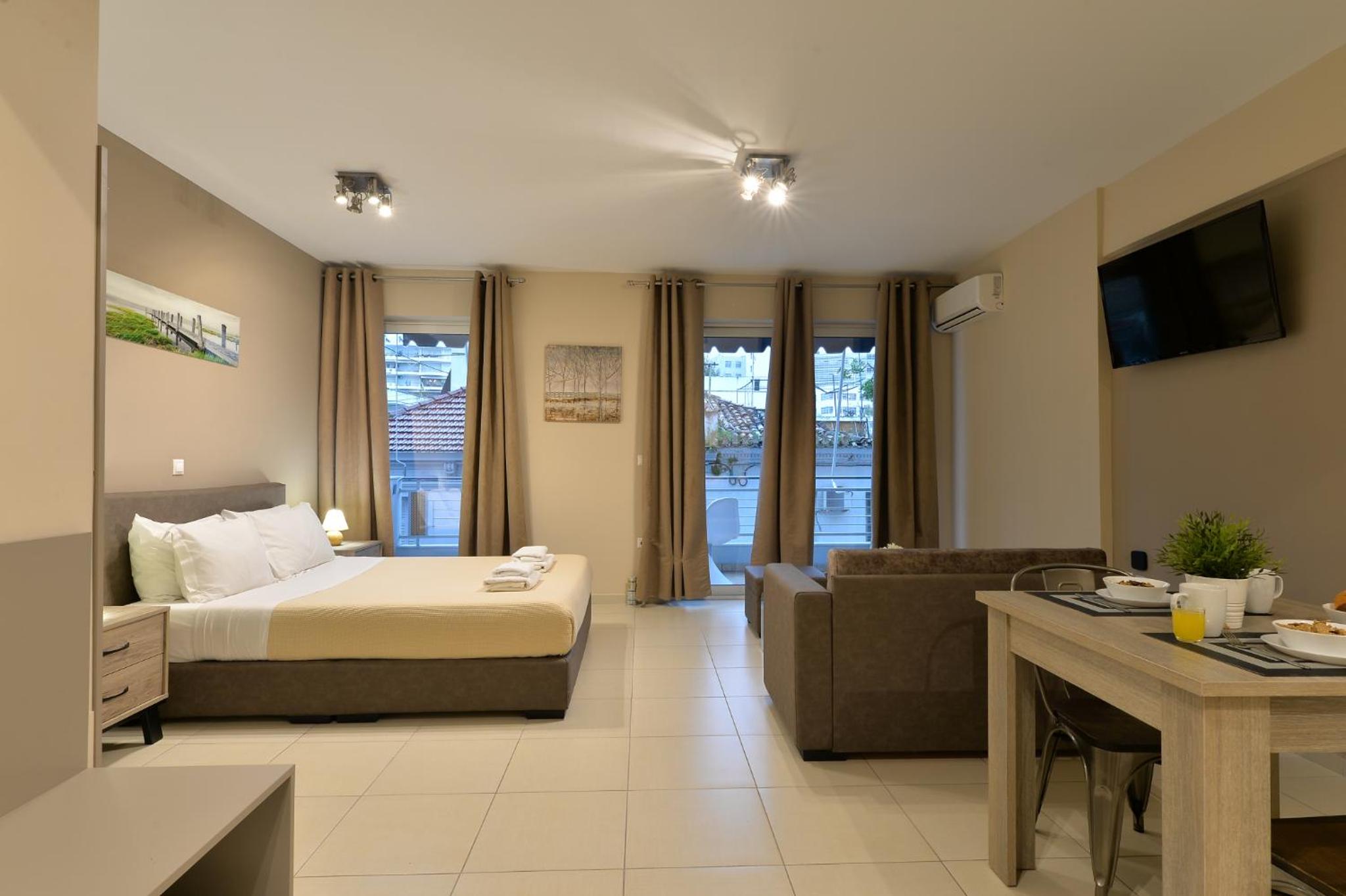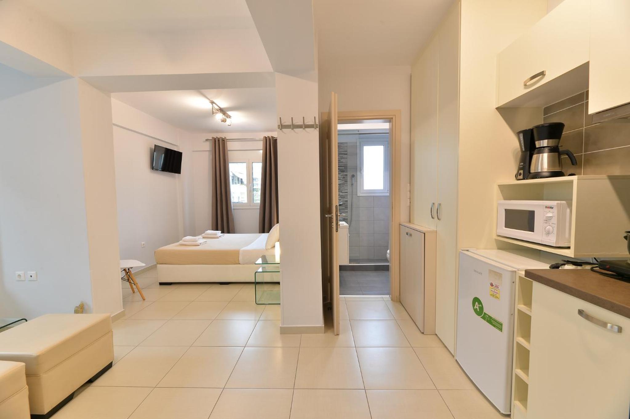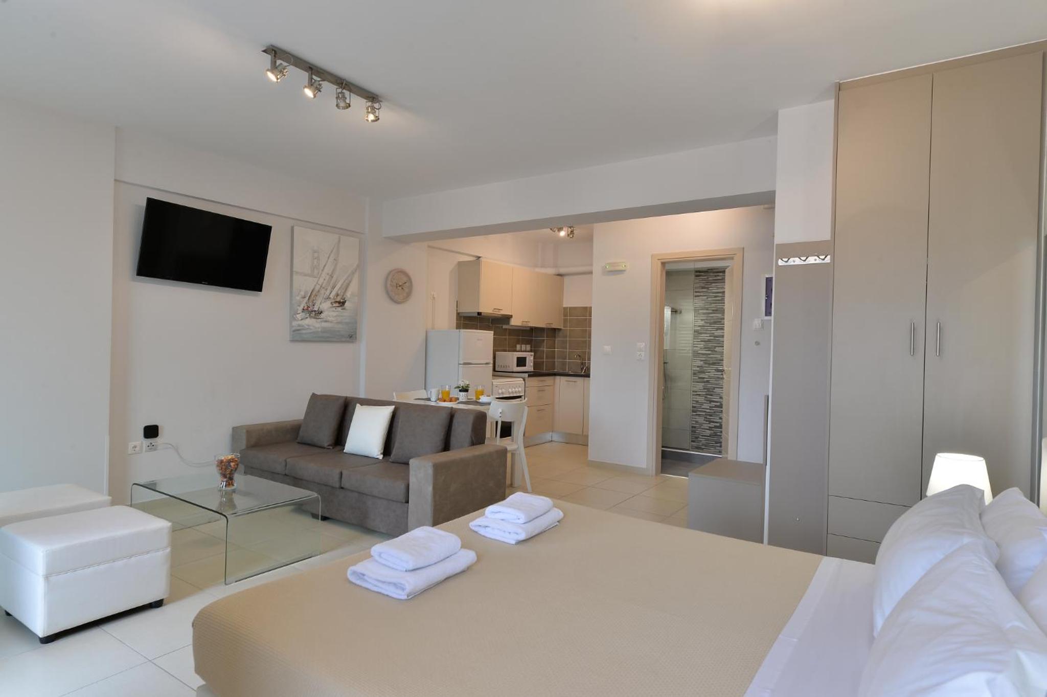 Modern Amenities: Alekos Apartments -Netflix- offers free bikes and free WiFi, ensuring you stay connected and explore the city with ease. The air-conditioned units feature balconies, fully equipped kitchens, and cozy living spaces with flat-screen TVs.