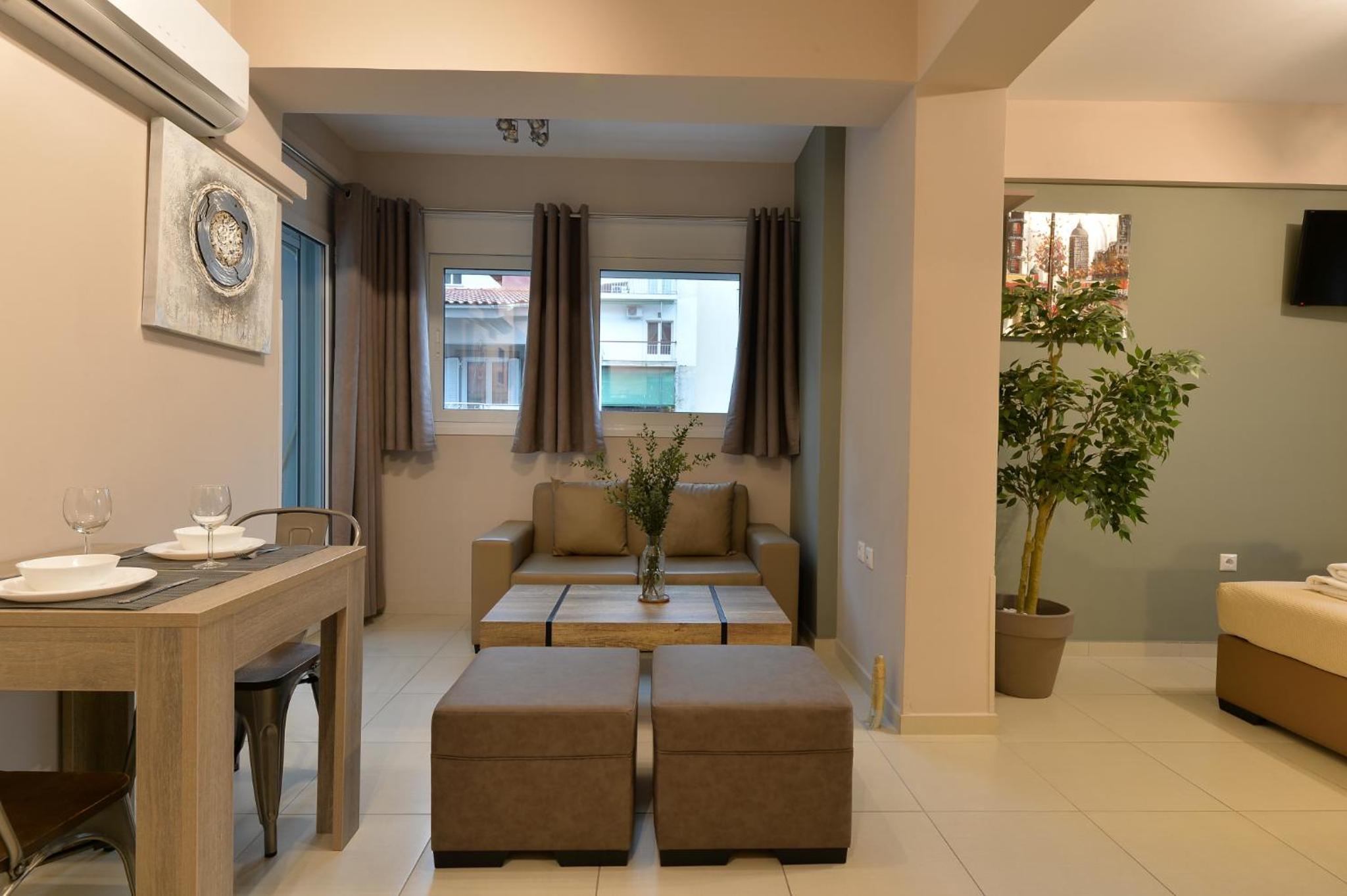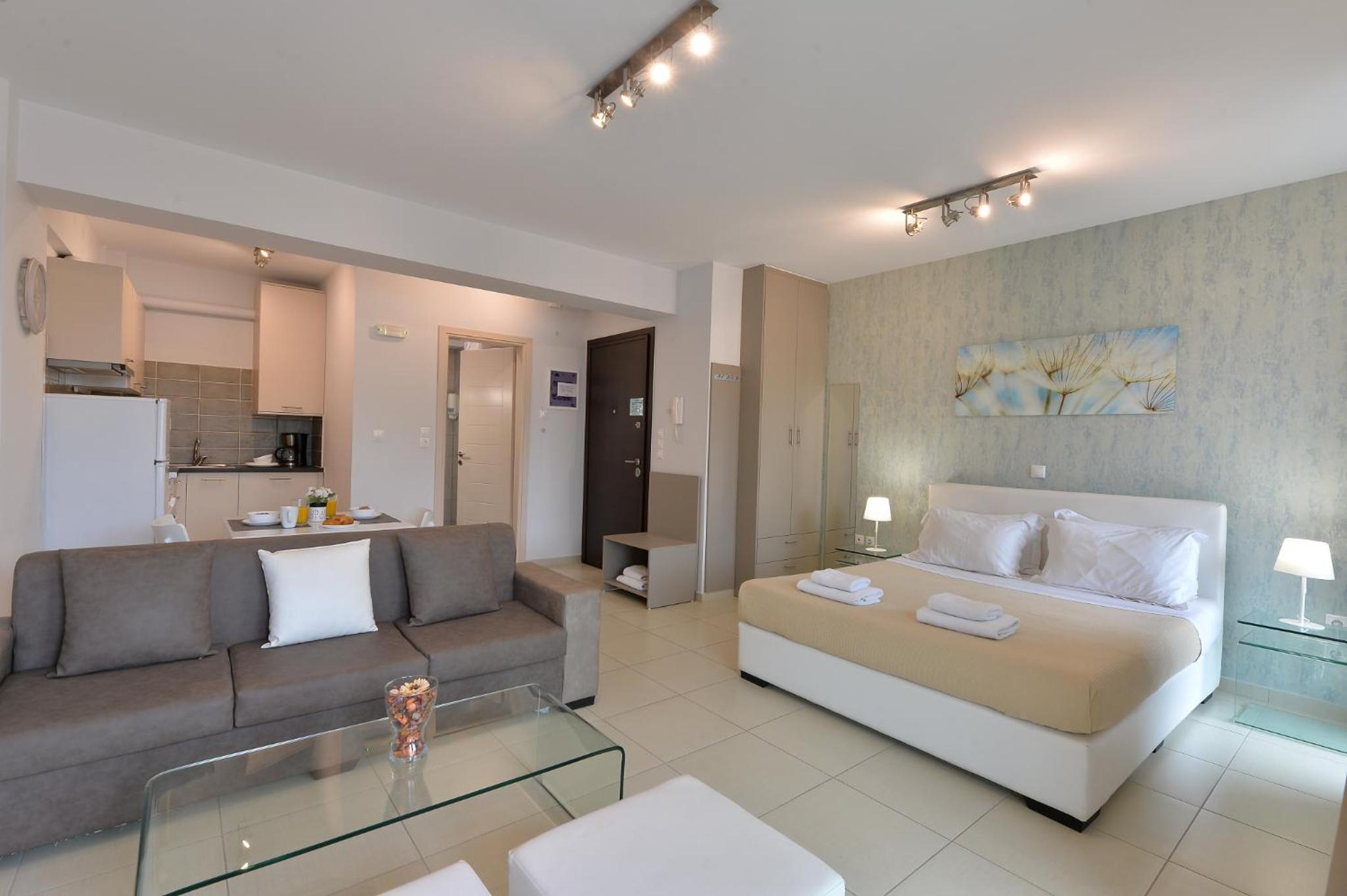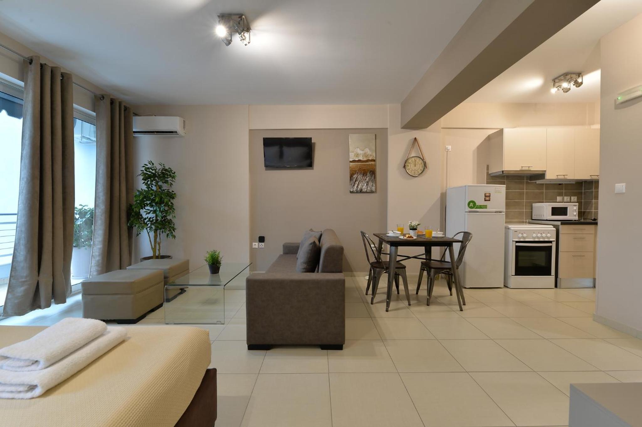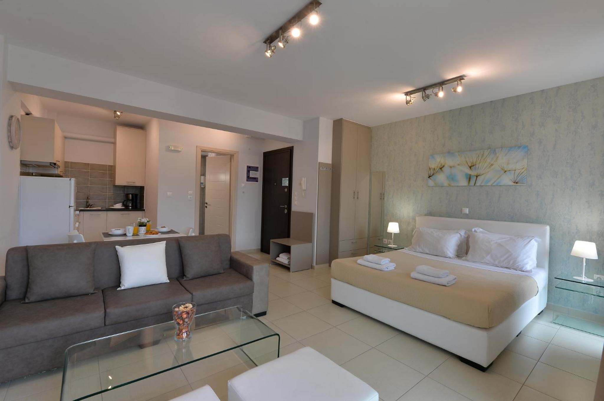 Modern Amenities: Alekos Apartments -Netflix- offers free bikes and free WiFi, ensuring you stay connected and explore the city with ease. The air-conditioned units feature balconies, fully equipped kitchens, and cozy living spaces with flat-screen TVs.