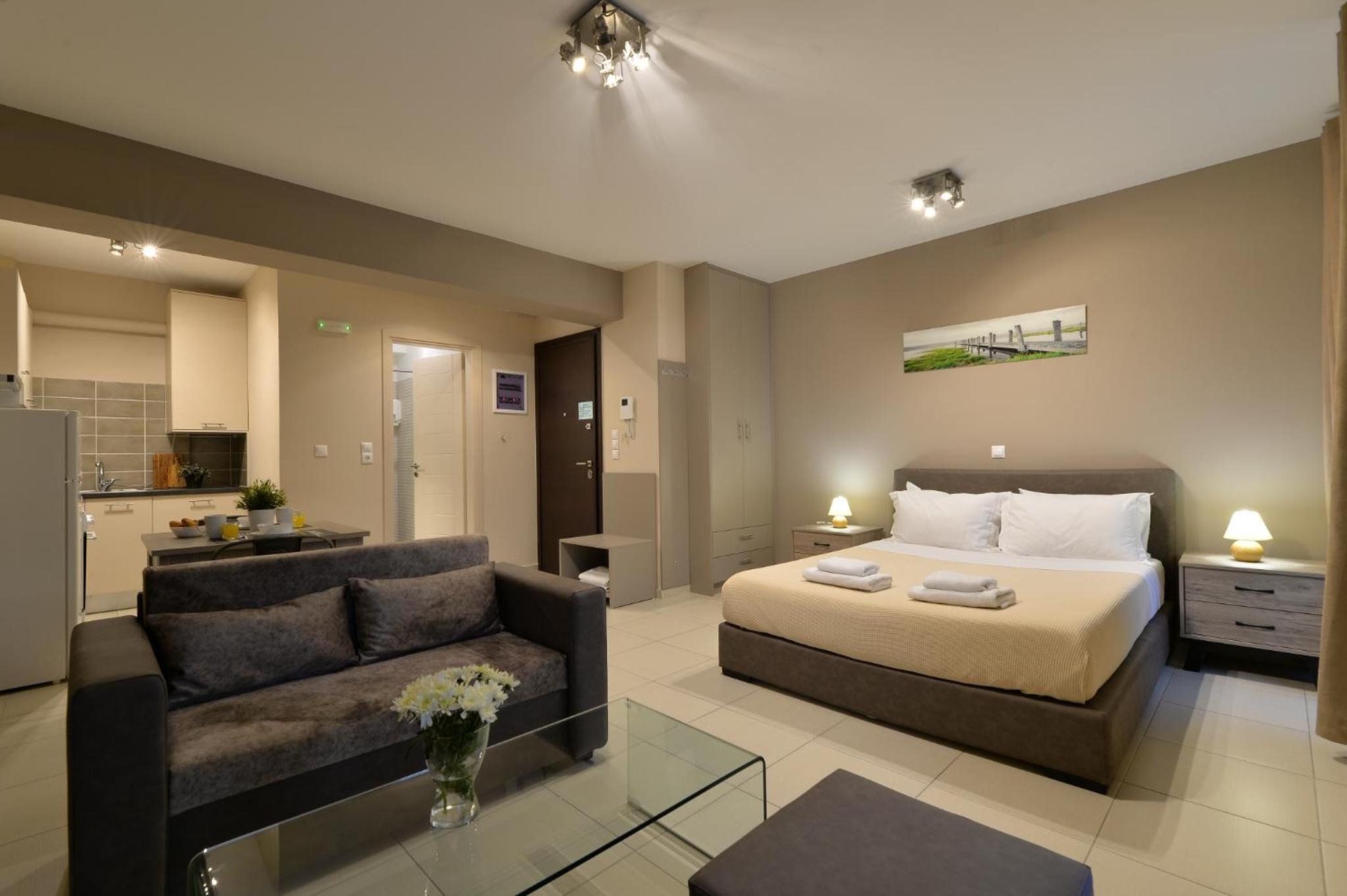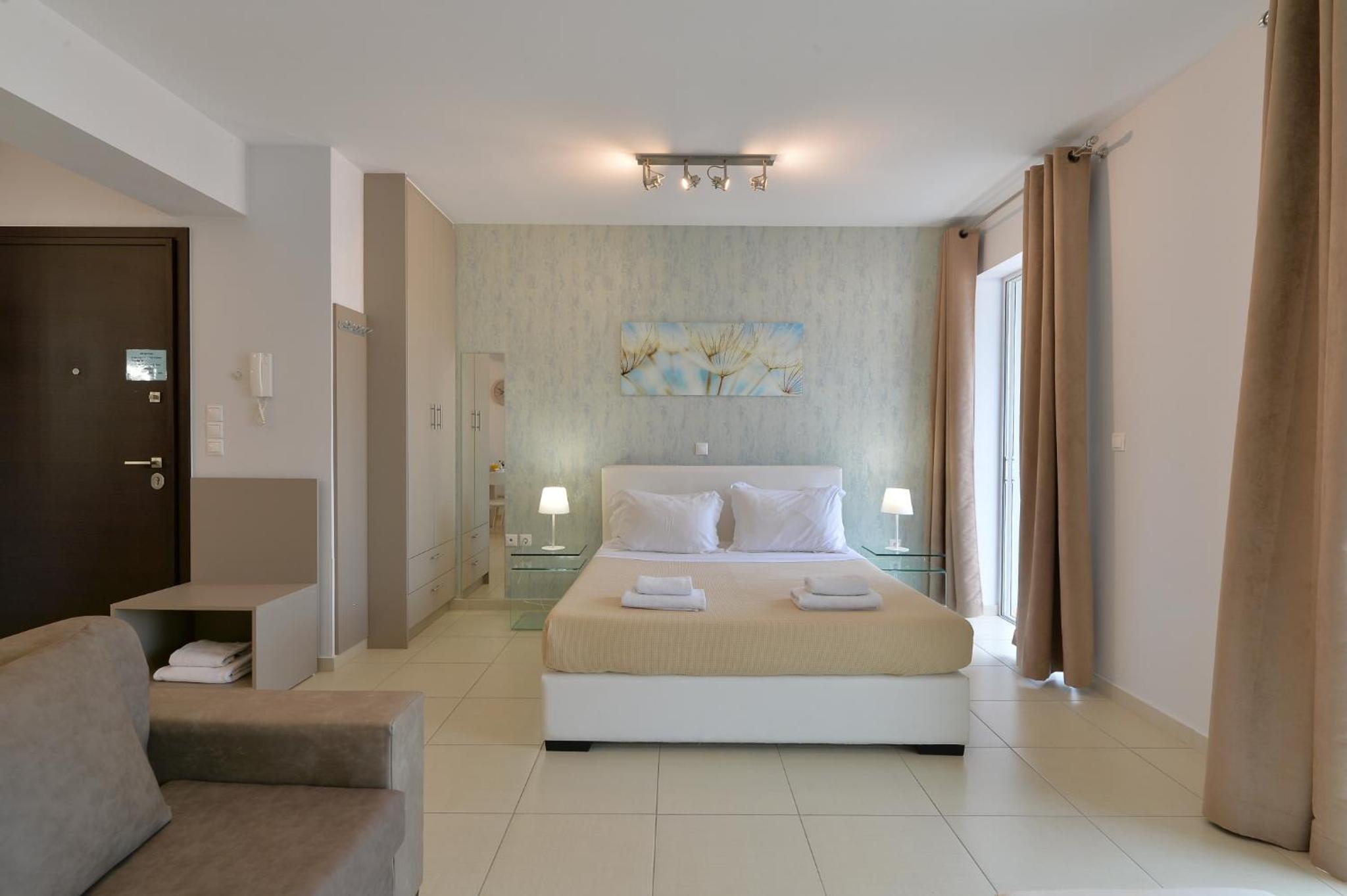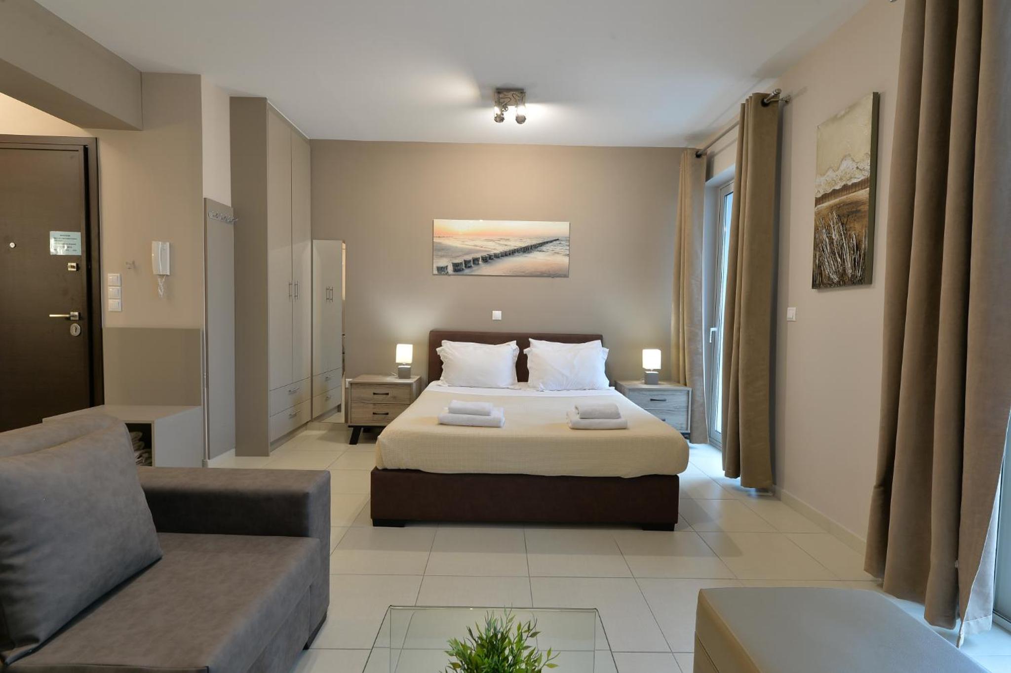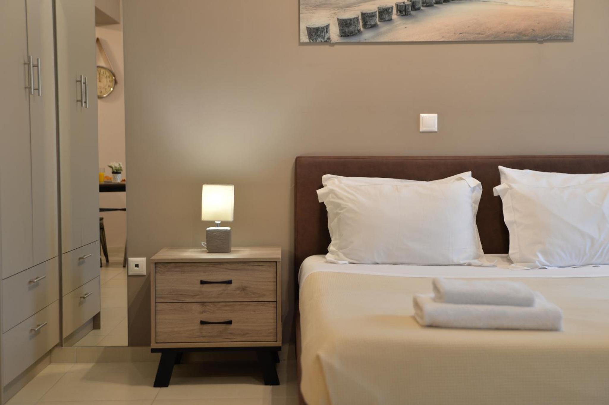 Modern Amenities: Alekos Apartments -Netflix- offers free bikes and free WiFi, ensuring you stay connected and explore the city with ease. The air-conditioned units feature balconies, fully equipped kitchens, and cozy living spaces with flat-screen TVs.