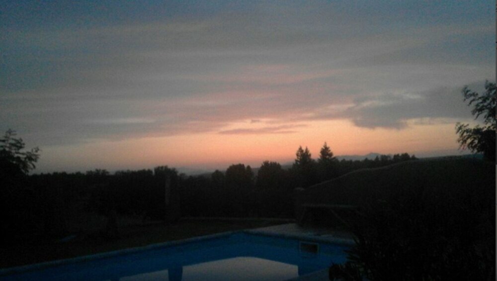 Víctor encantador y desde la piscina bonita puesta de sol.