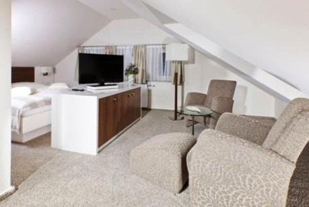 Ruime kamer met fijne zithoek. Wel een lange gang met veel trappen om bij de kamer te komen.