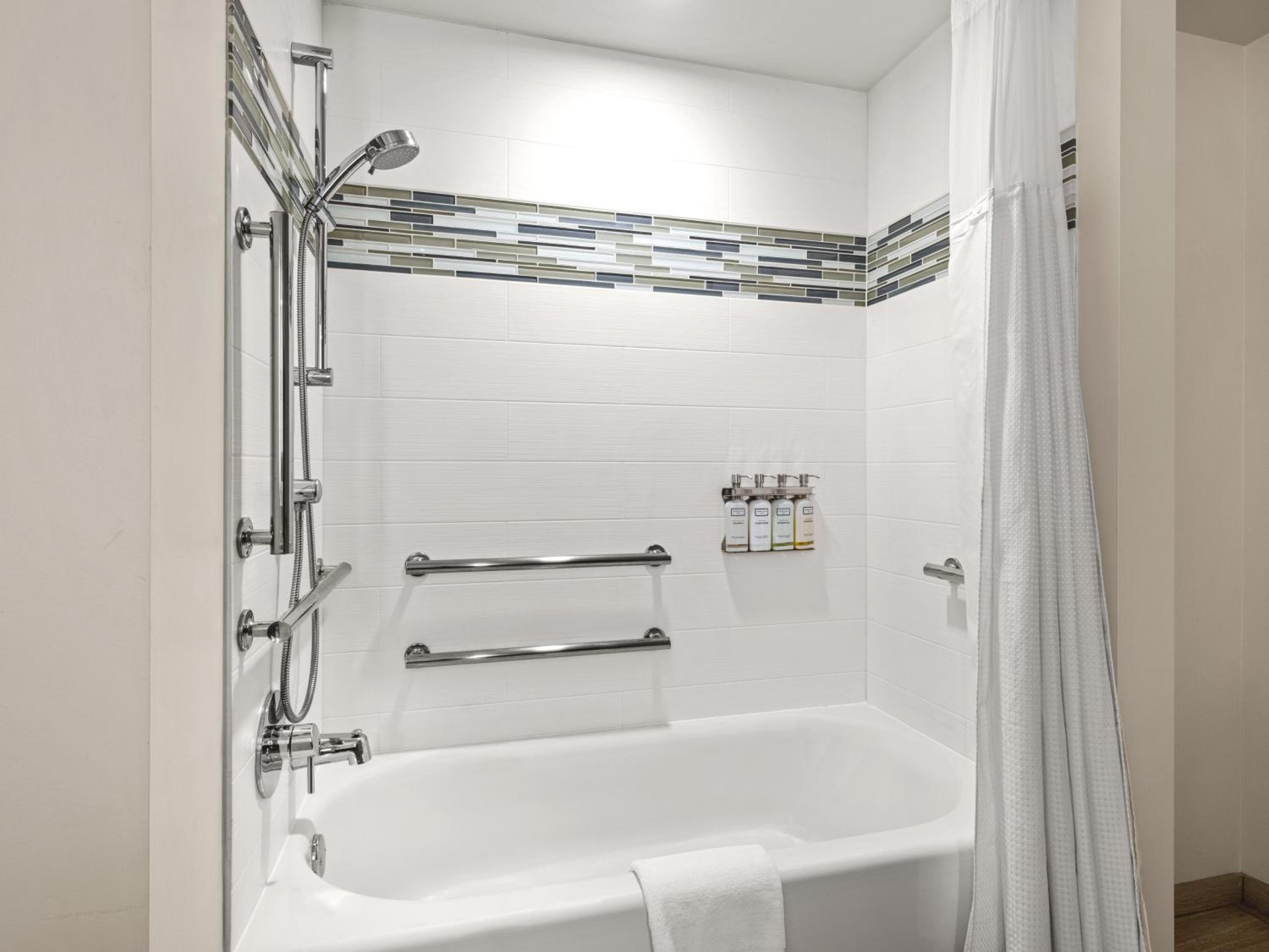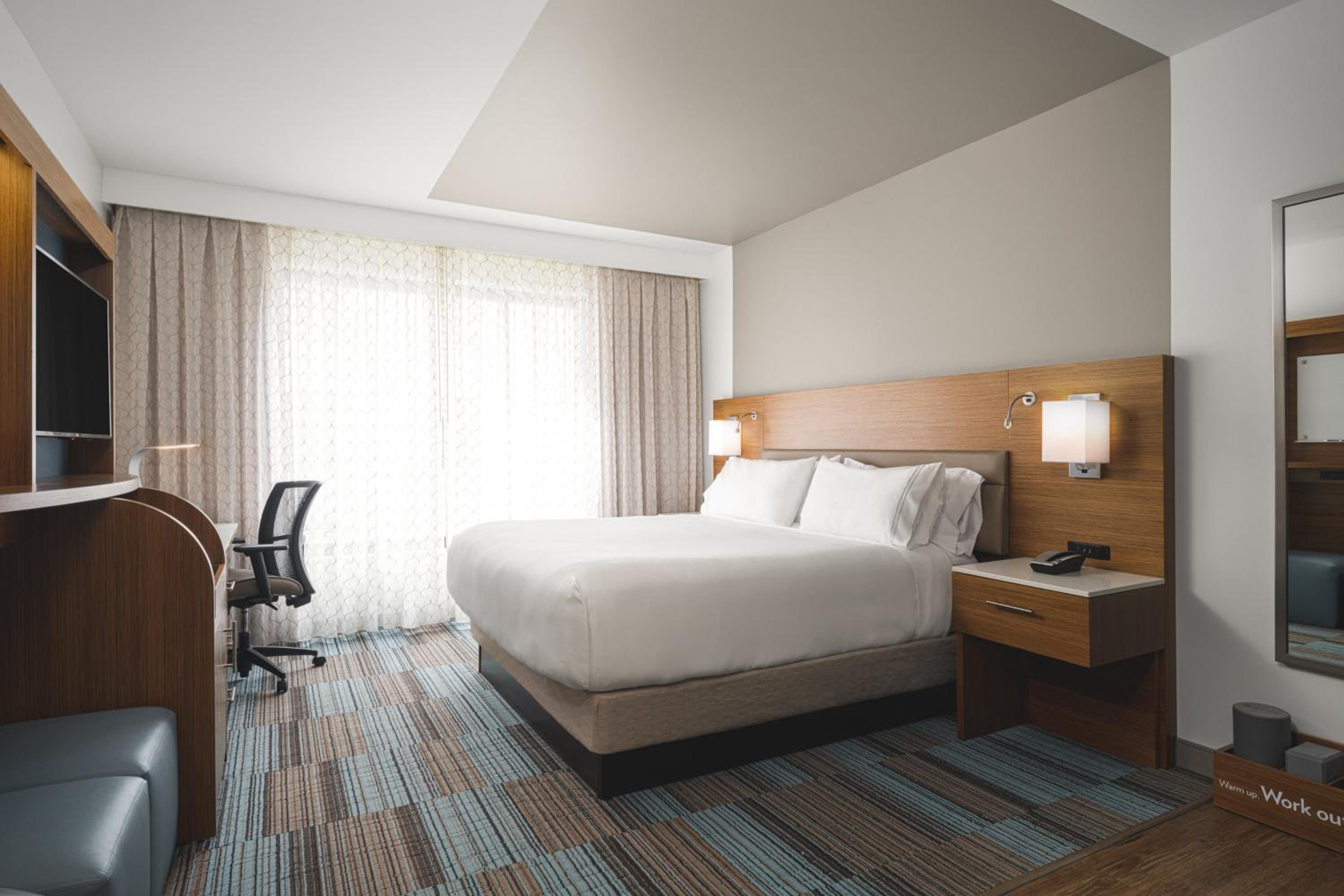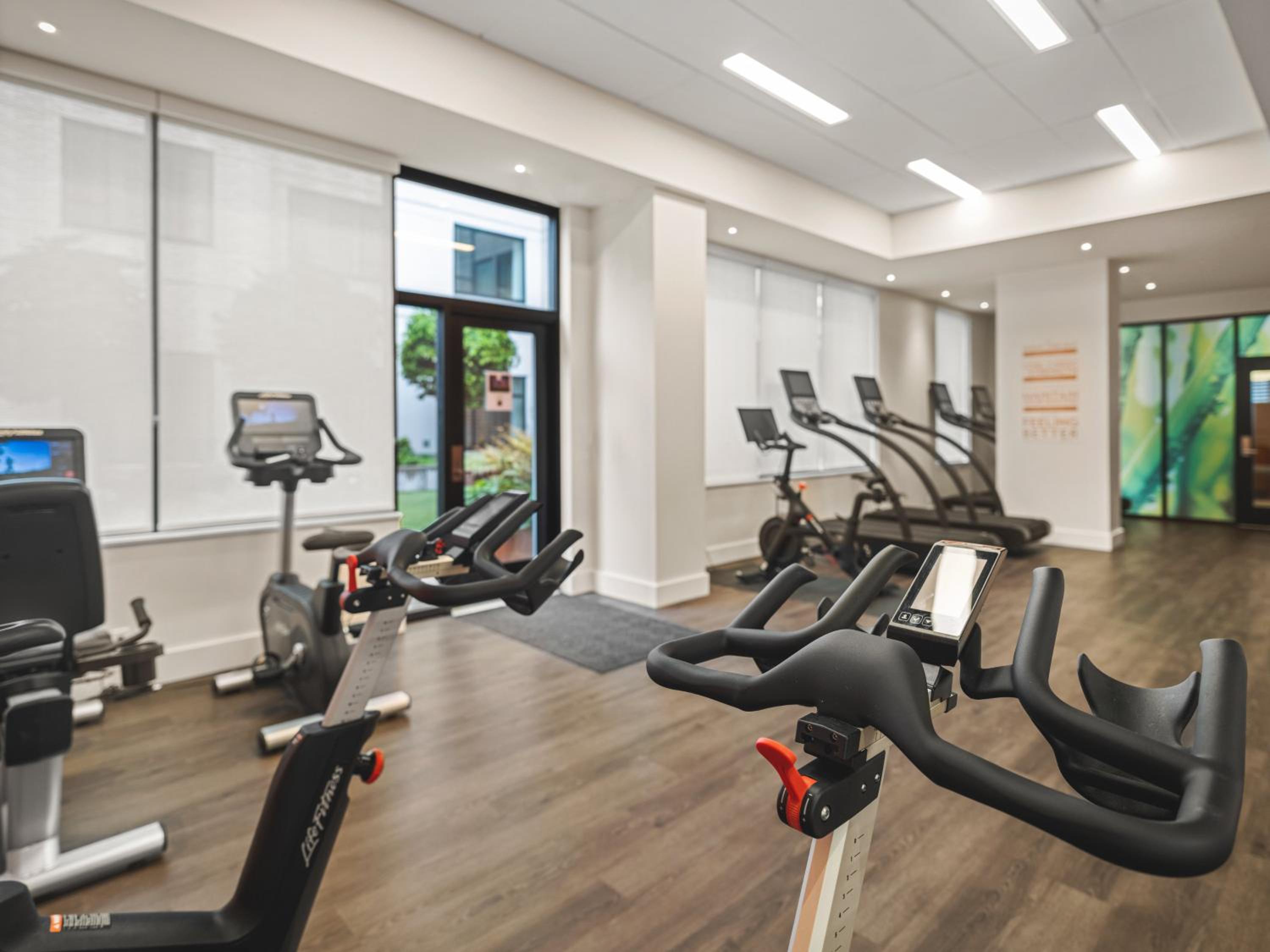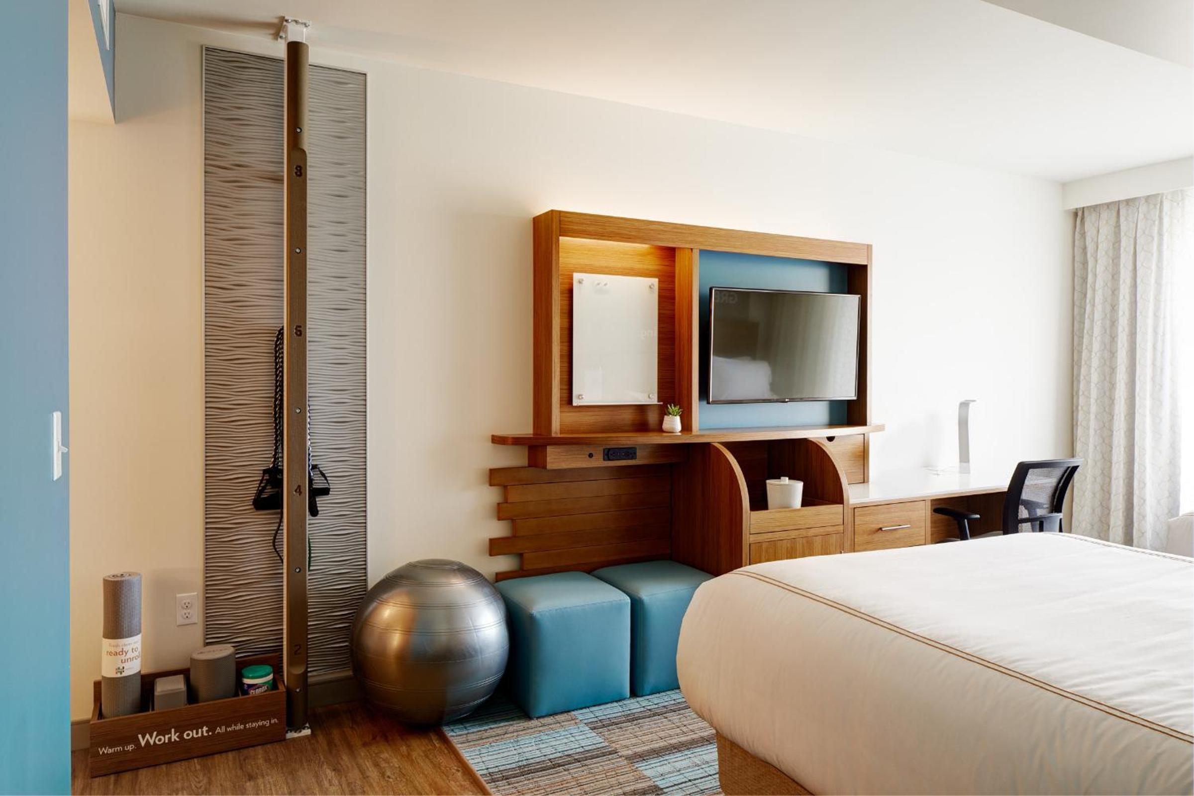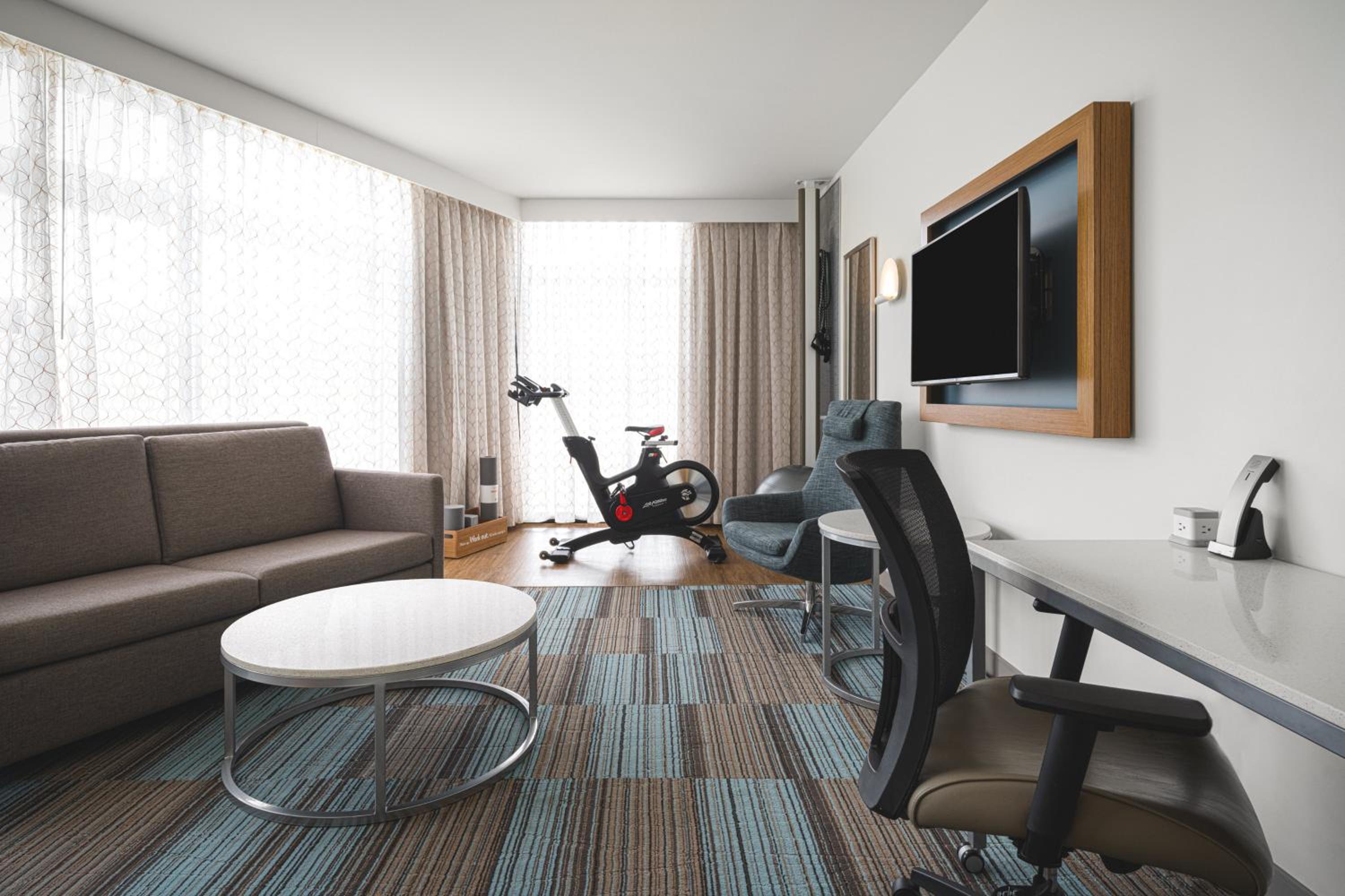 In-Room Wellness Amenities: Enjoy a productive stay with a desk, flat-screen TV, private bathroom, and even an in-room stationary bike in select units.