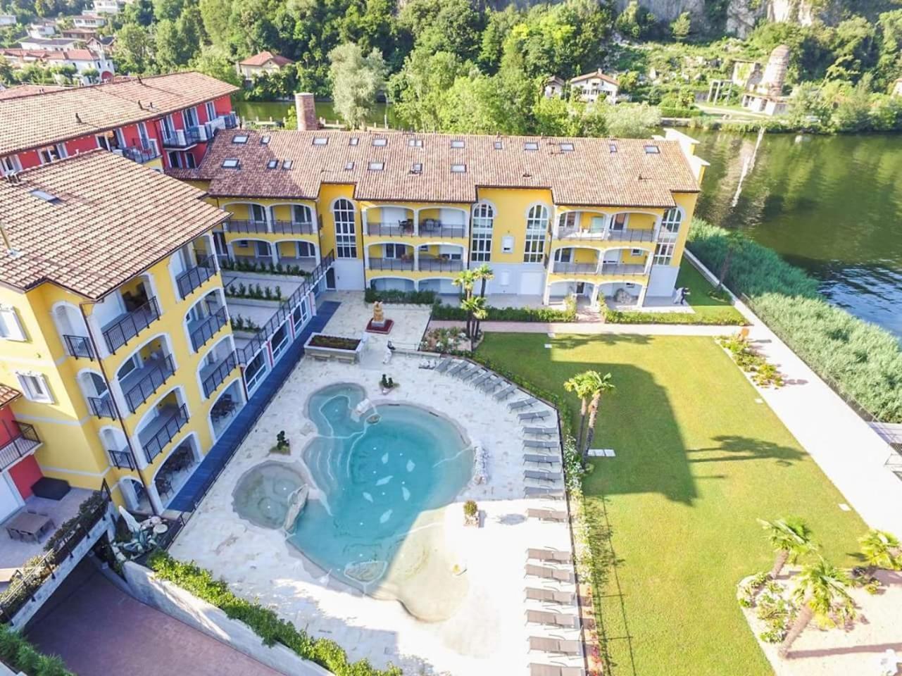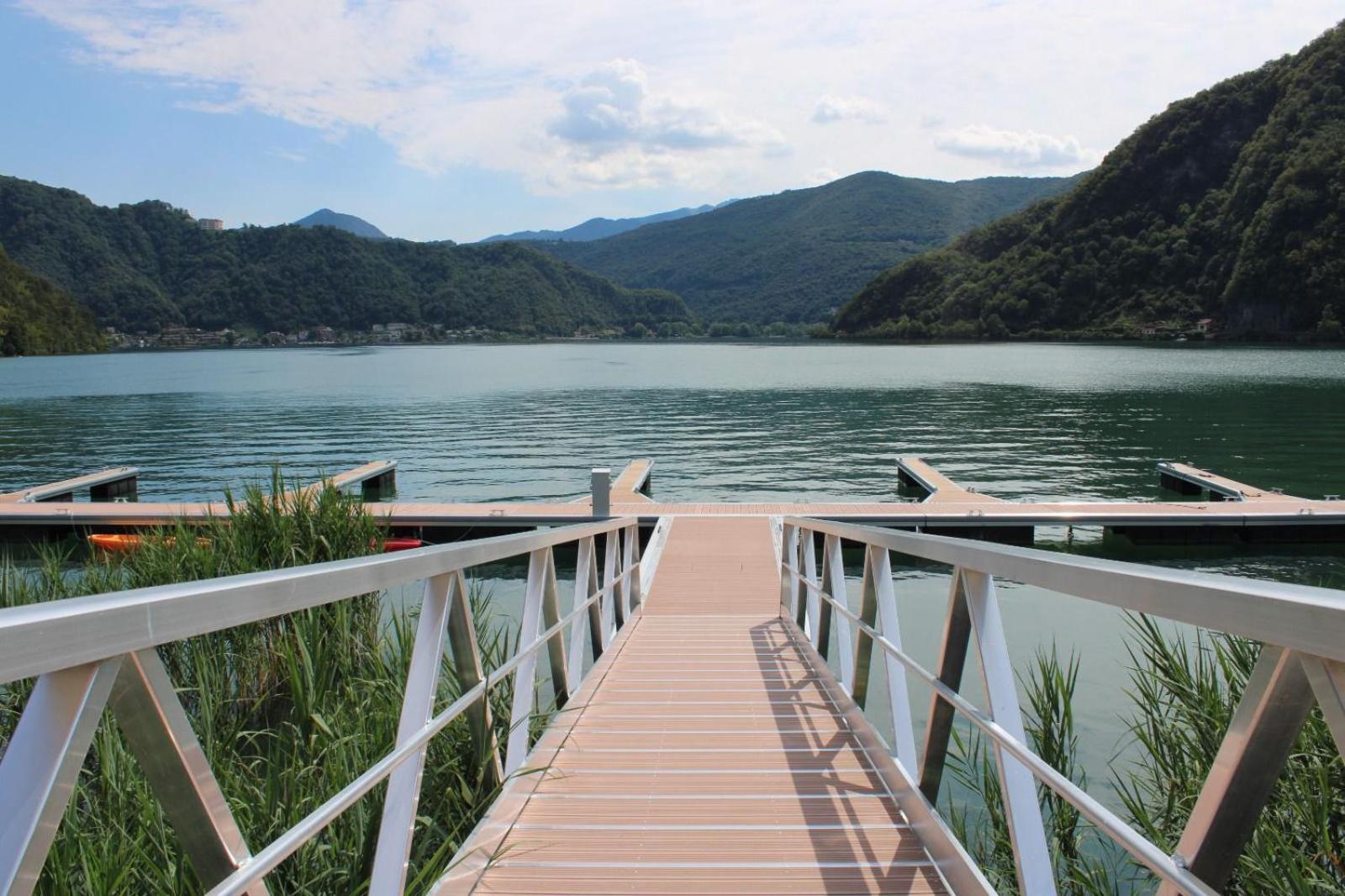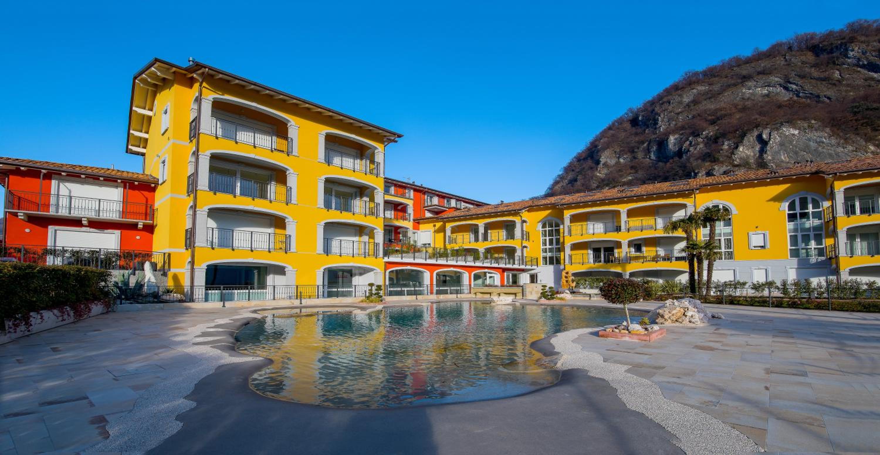 Il residence dispone di un pontile direttamente sul lago, una piscina con un piccolo isolotto simile ad una spiaggetta, davvero particolare.