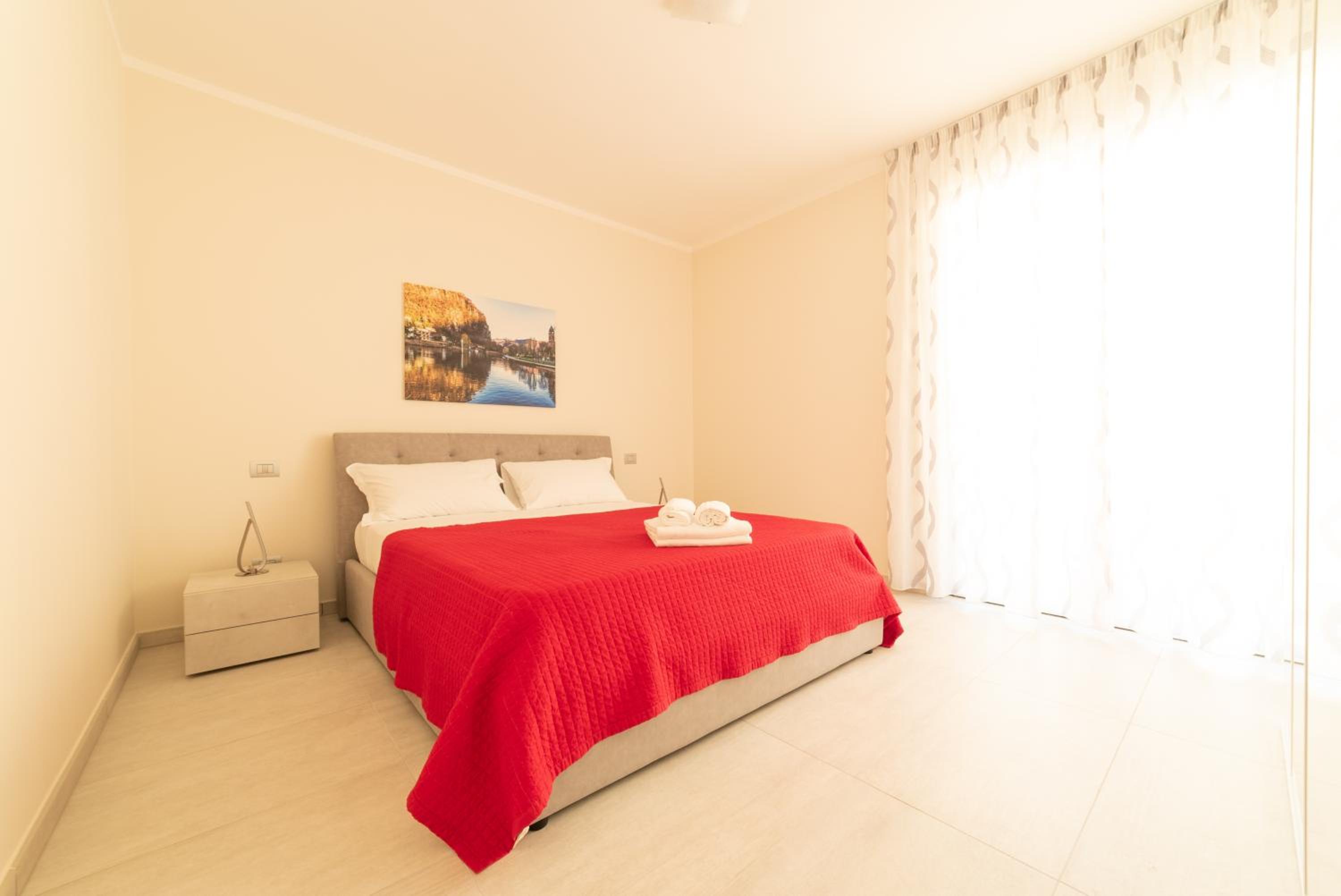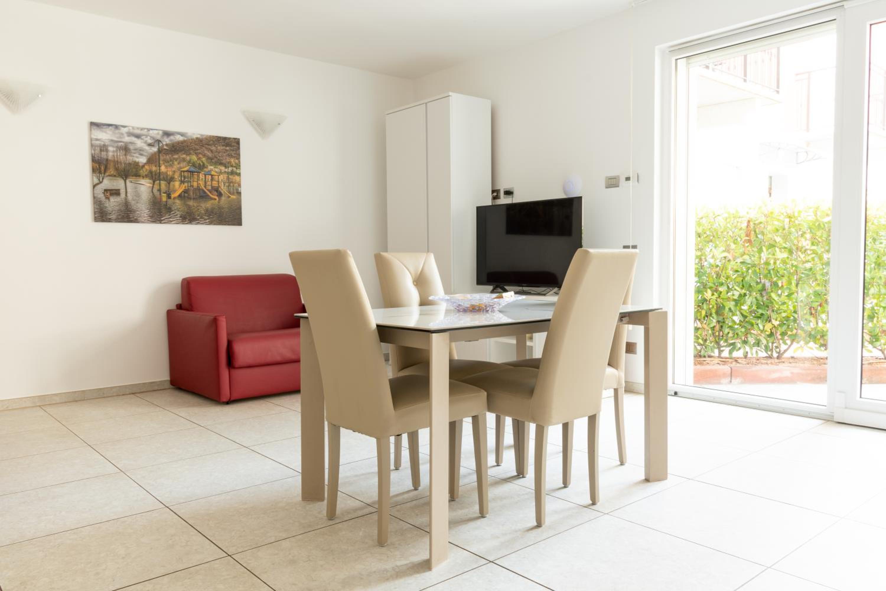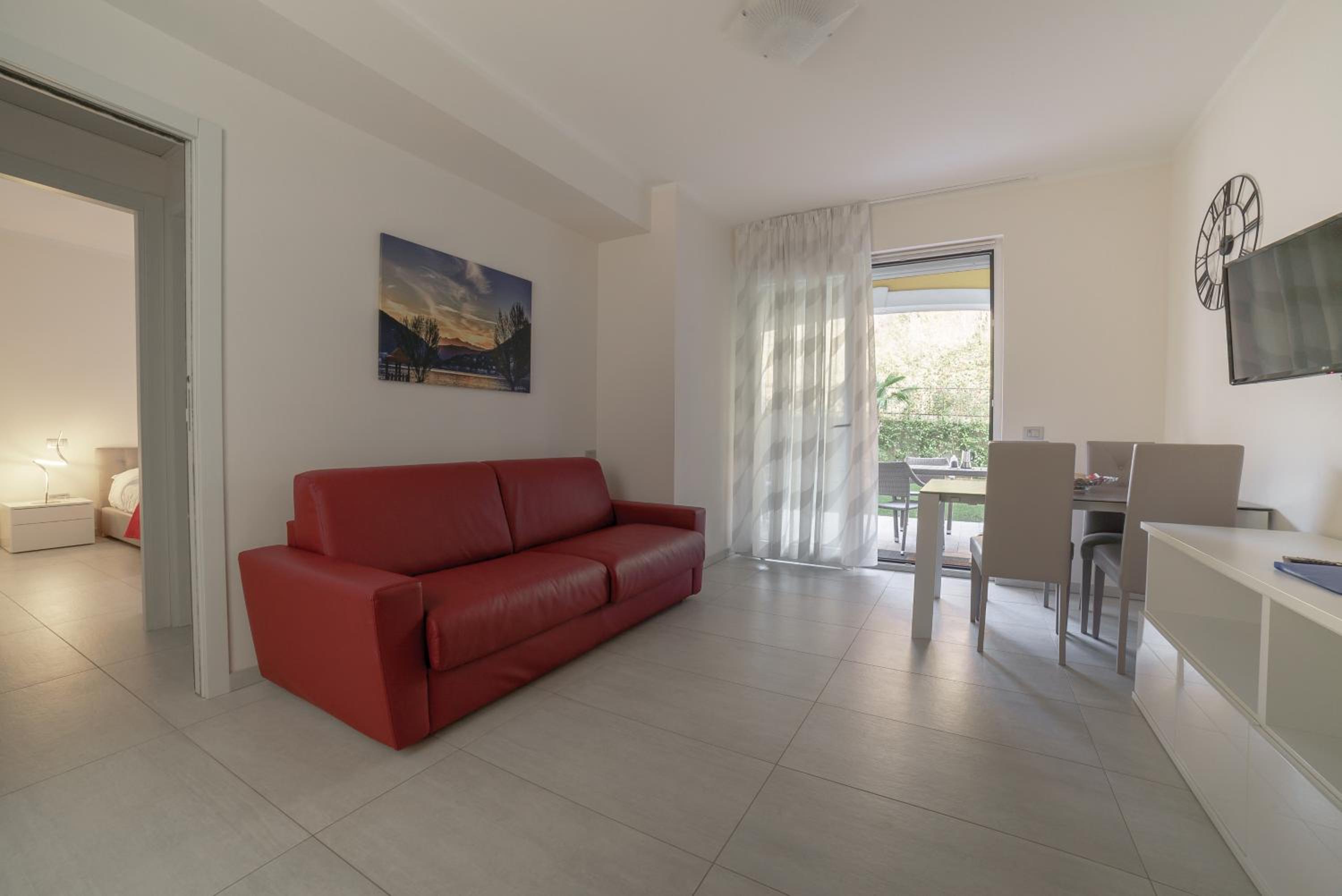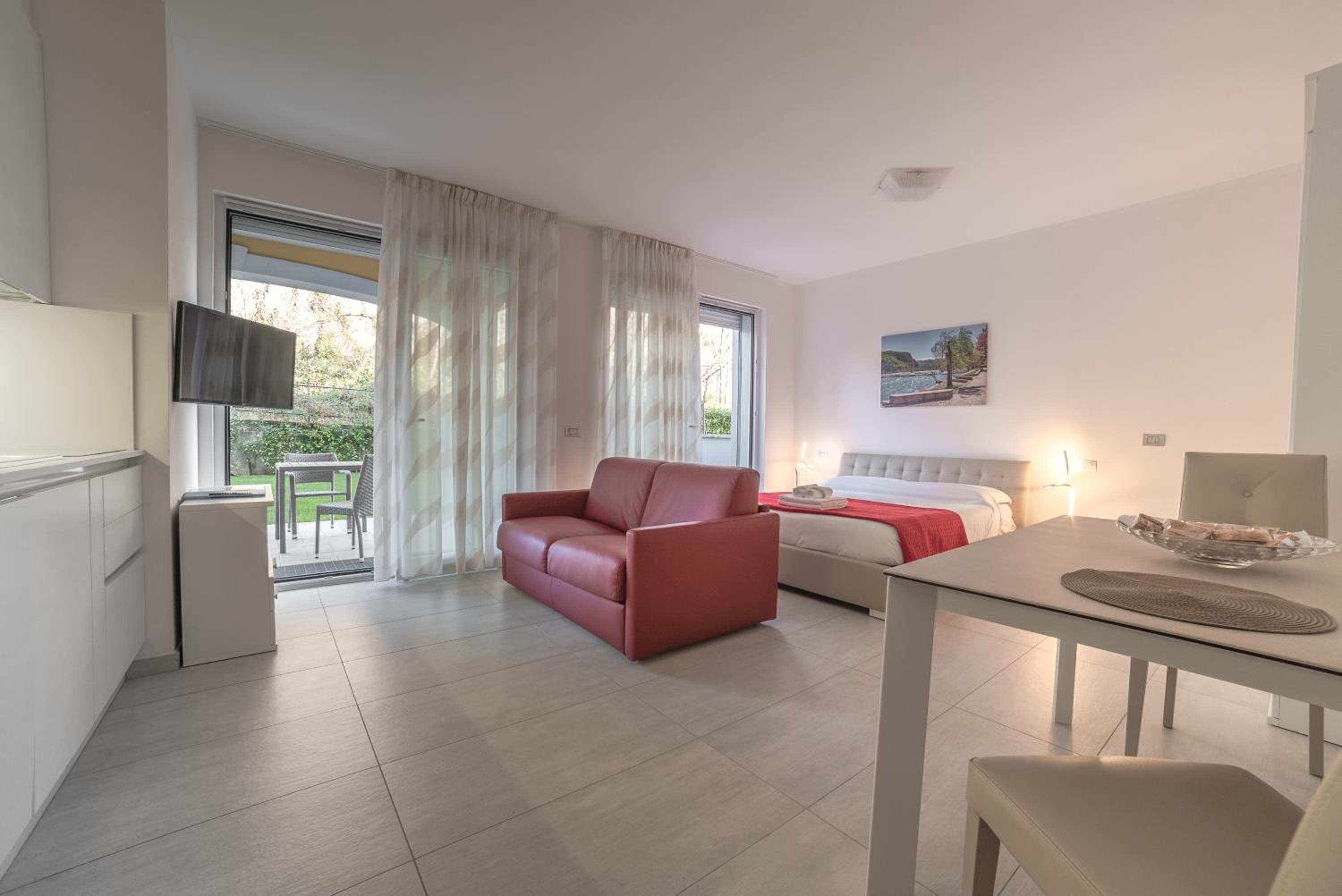 Il residence dispone di un pontile direttamente sul lago, una piscina con un piccolo isolotto simile ad una spiaggetta, davvero particolare.