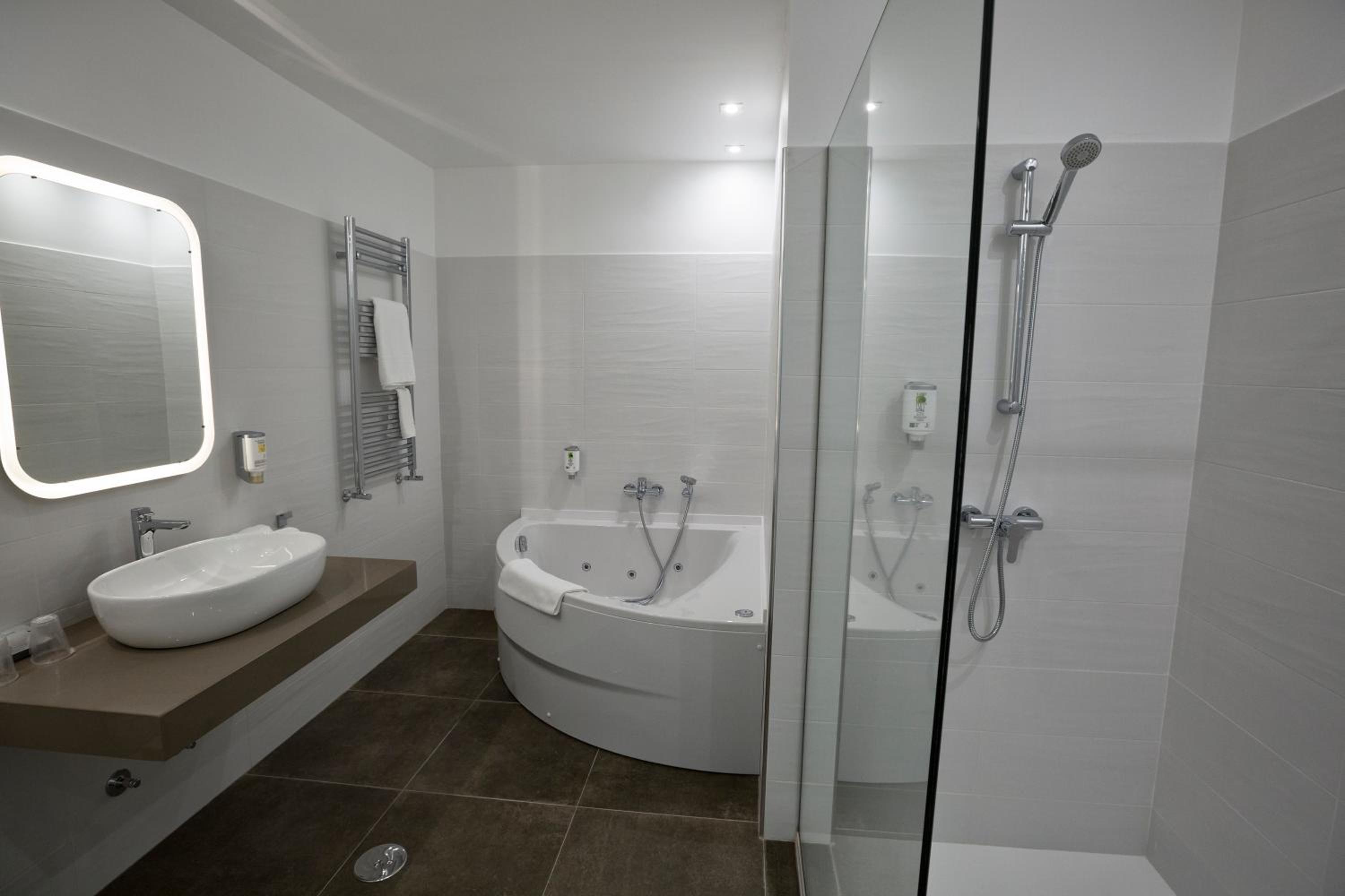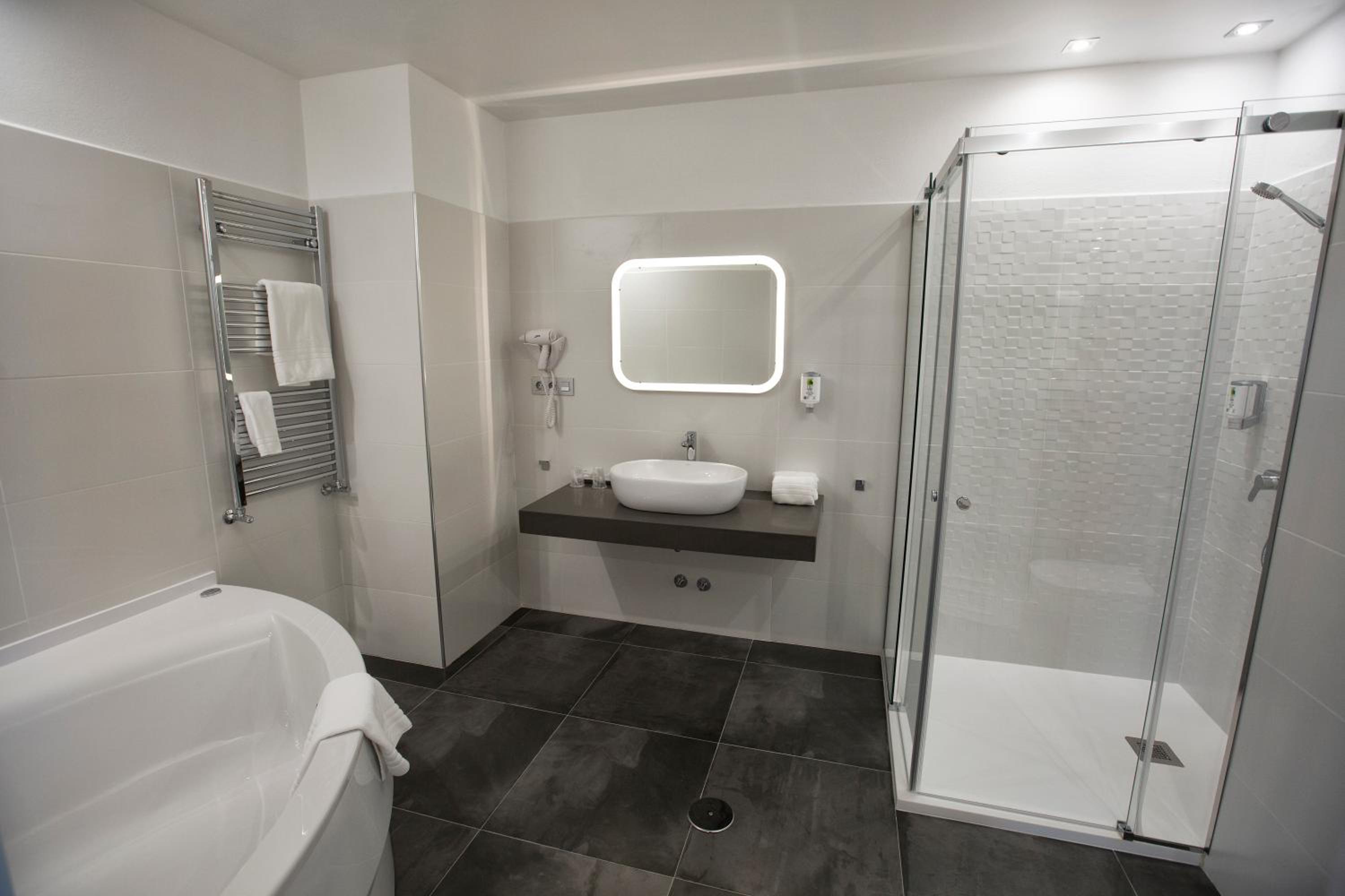 Relax in our heated rooms with wooden floors, equipped with modern amenities like a desk, safe, and flat-screen TV. The private bathroom with a bath tub adds a touch of luxury to your stay.
