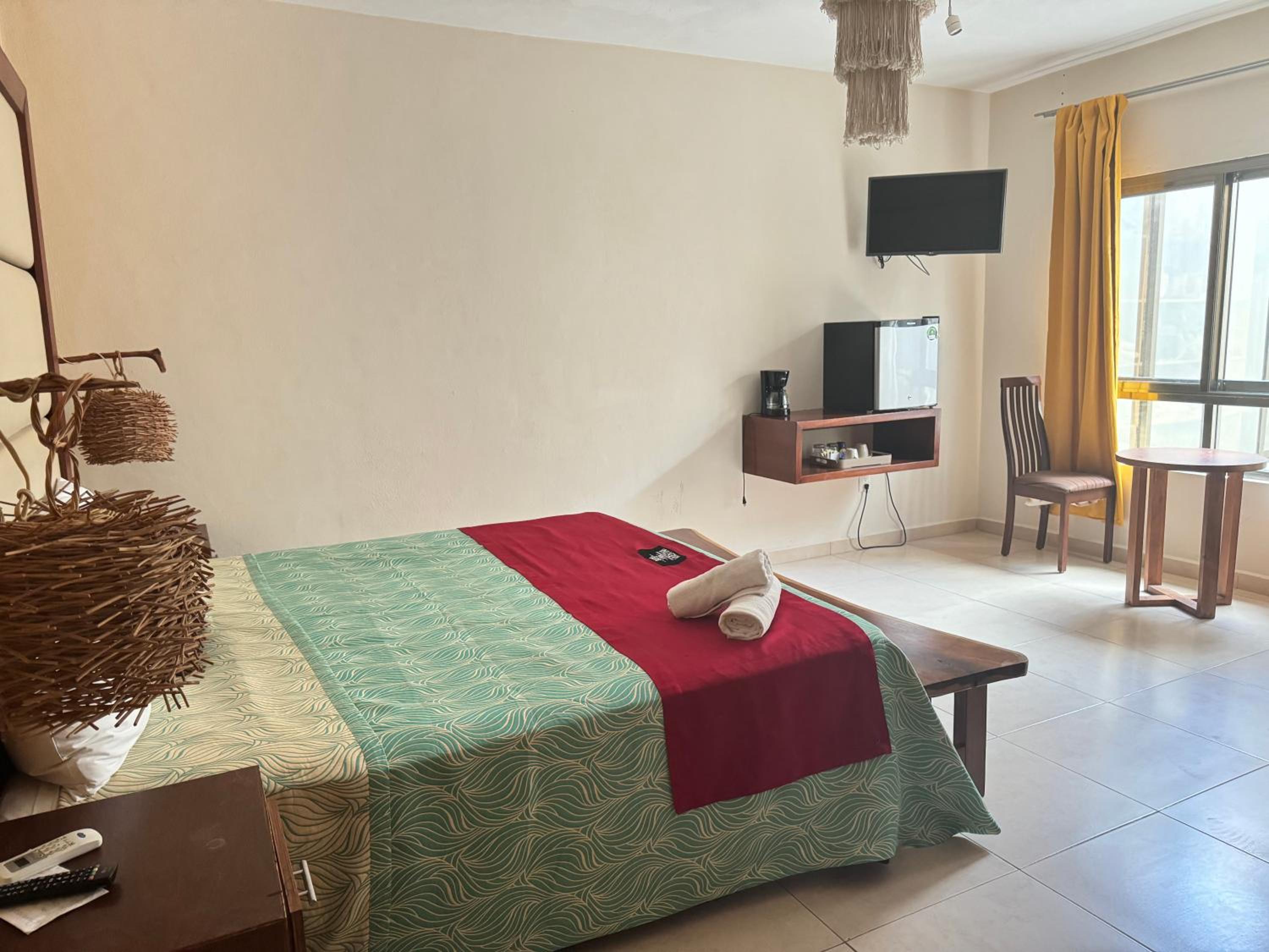 A 200 m de la plage et au coeur des commerces de la ville. Une chambre très propre et bien équipée. Au dessus du restaurant où vous pouvez déjeuner à un prix très correct pour un bord de mer. Le personnel est très accueillant et serviable. Un espace détente et ouscine sur le toit bien aménagé.
