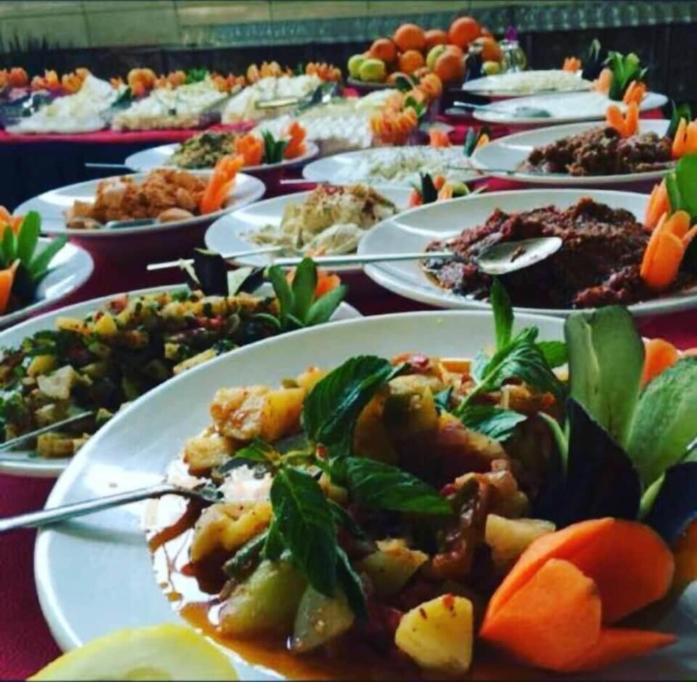 We stayed 2 nights. There was no restaurant. First night we ordered Pizza. This hotel is for public functions like marriage, etc. The music (drum beats) starts in the evening and went on past midnight. The front desk staff spoke English. The breakfast was average. There was a coffee pot but no place to plug it. No toiletries. Second day no coffee packets, tea, sugar dry creamer and no water bottle. Overall the hotel is below average. We selected it for the walking distance to St.Peter's cave only.