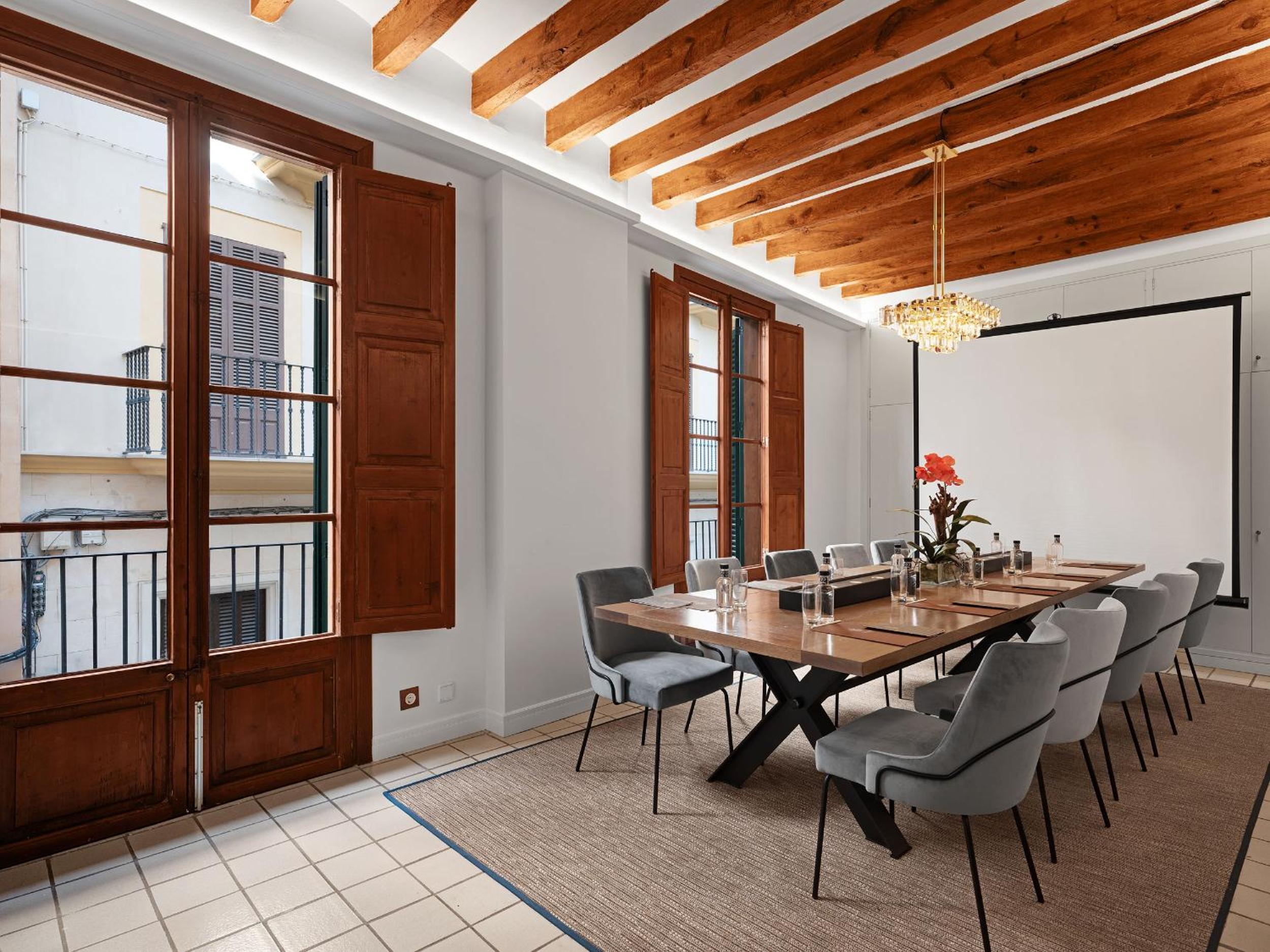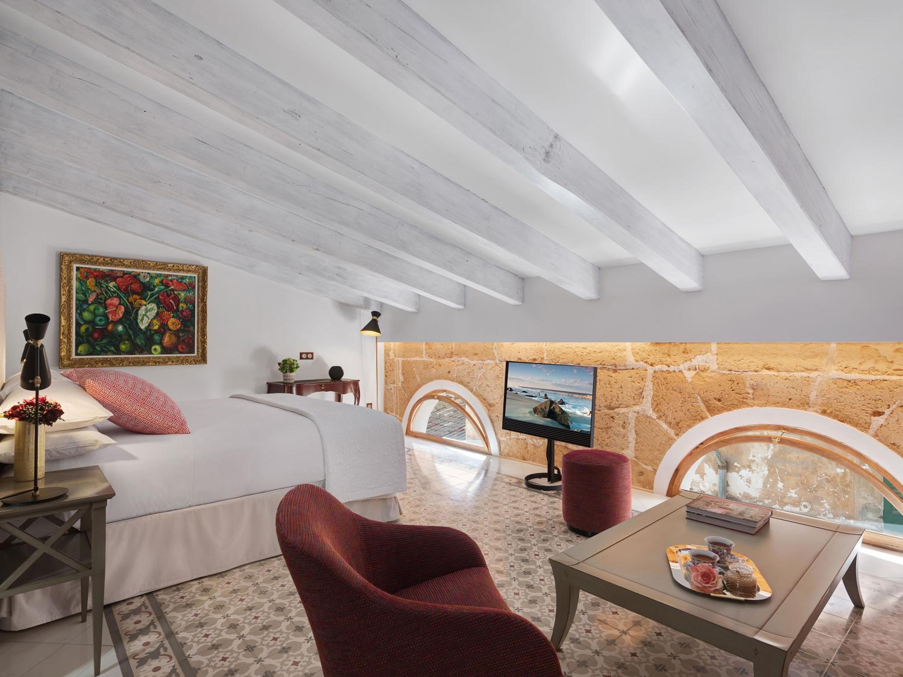 Step into a blend of tradition and modernity at Hotel Gloria de Sant Jaume, housed in a beautifully restored 19th-century building. The hotel's design showcases traditional elements such as exposed wooden beams, hydraulic tiles, and elegant marble bathrooms.