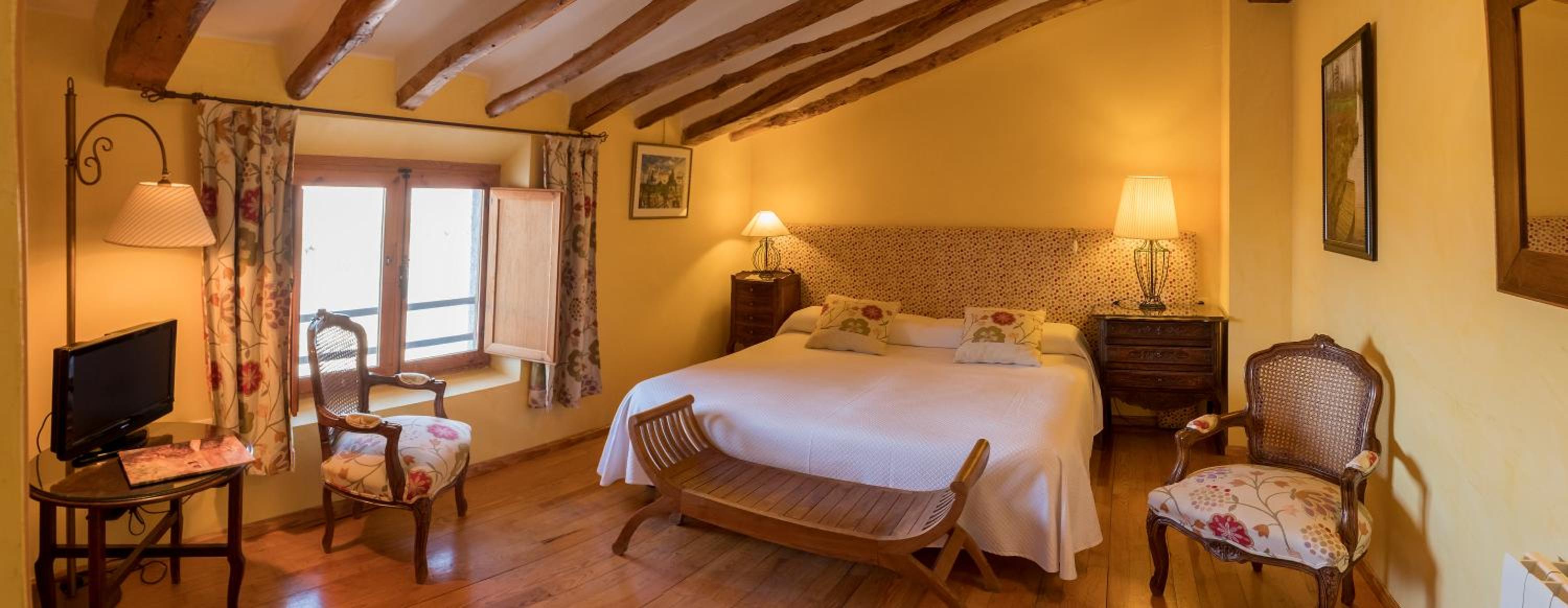 Cozy Accommodations: Enjoy spacious rooms with stunning views of Benejama Valley, featuring simple designs, original wood beams, and modern amenities like central heating and private bathrooms.