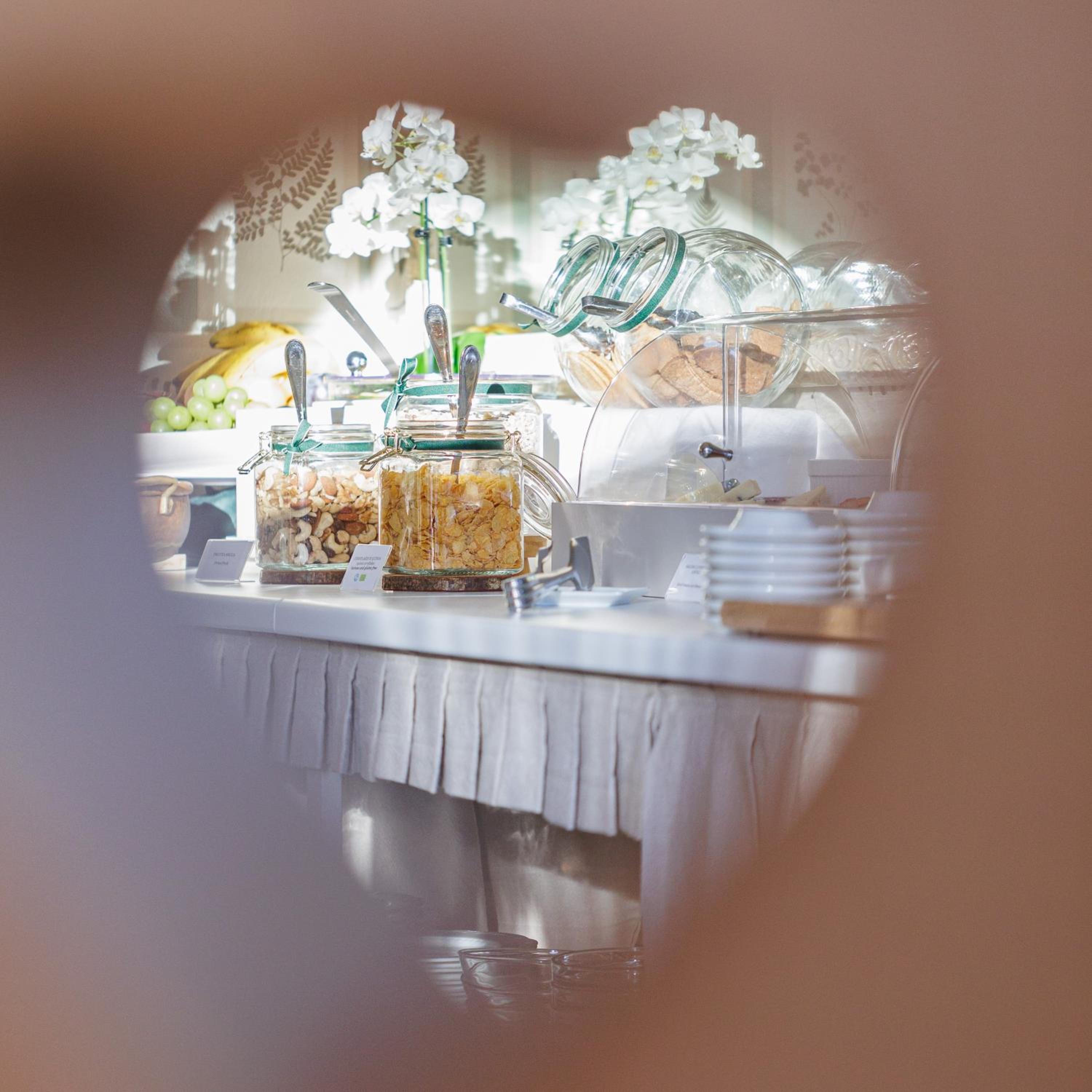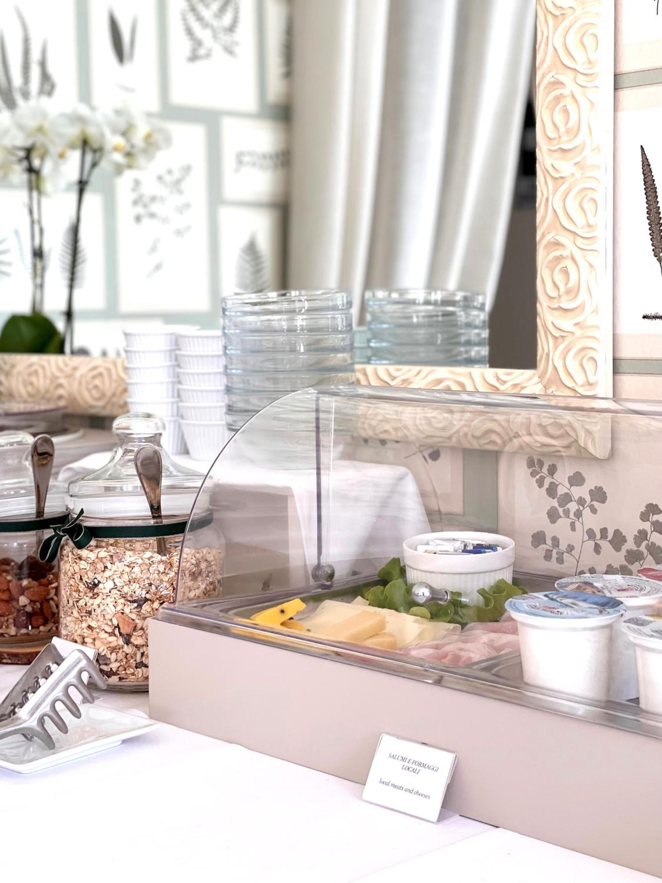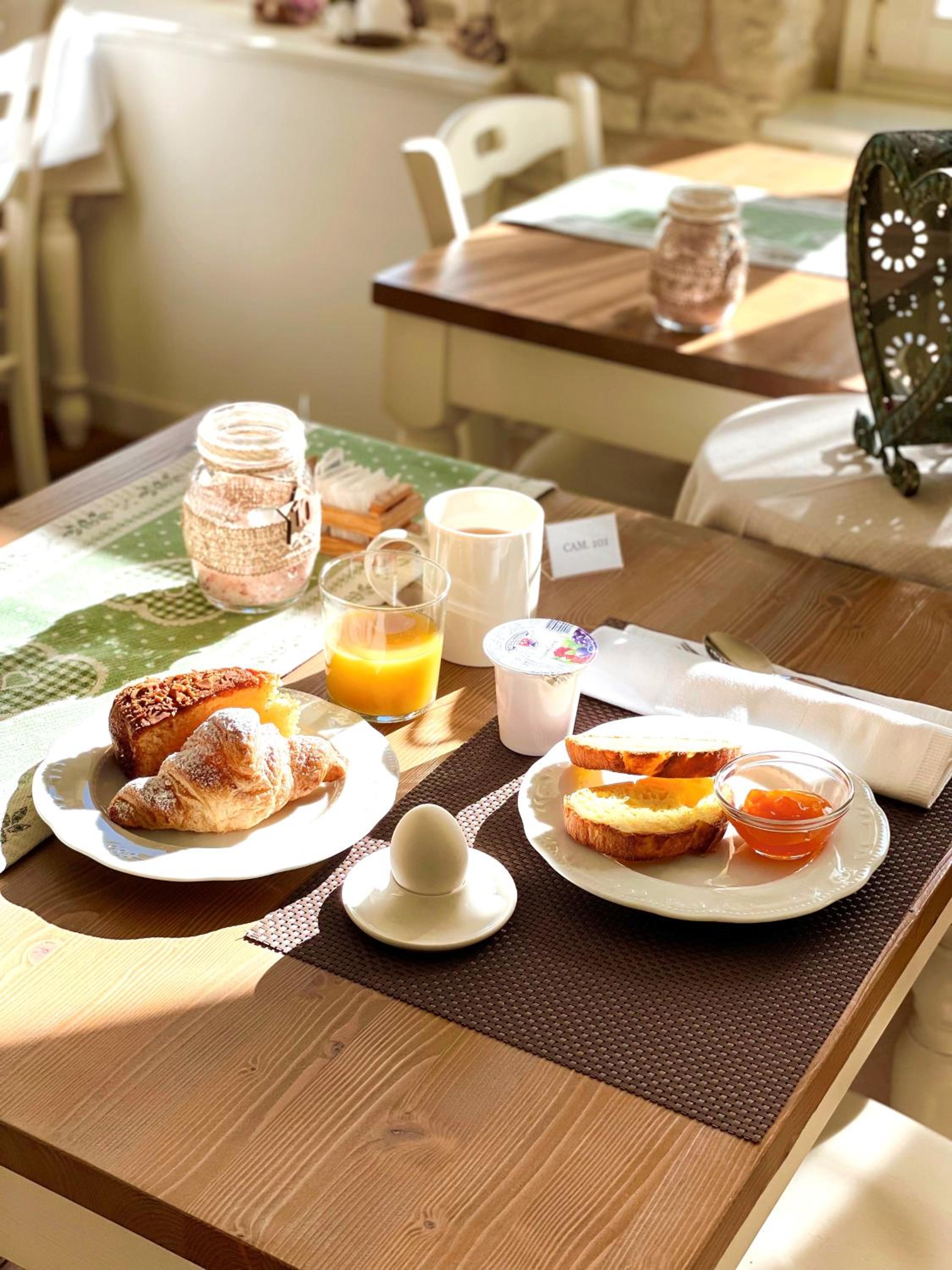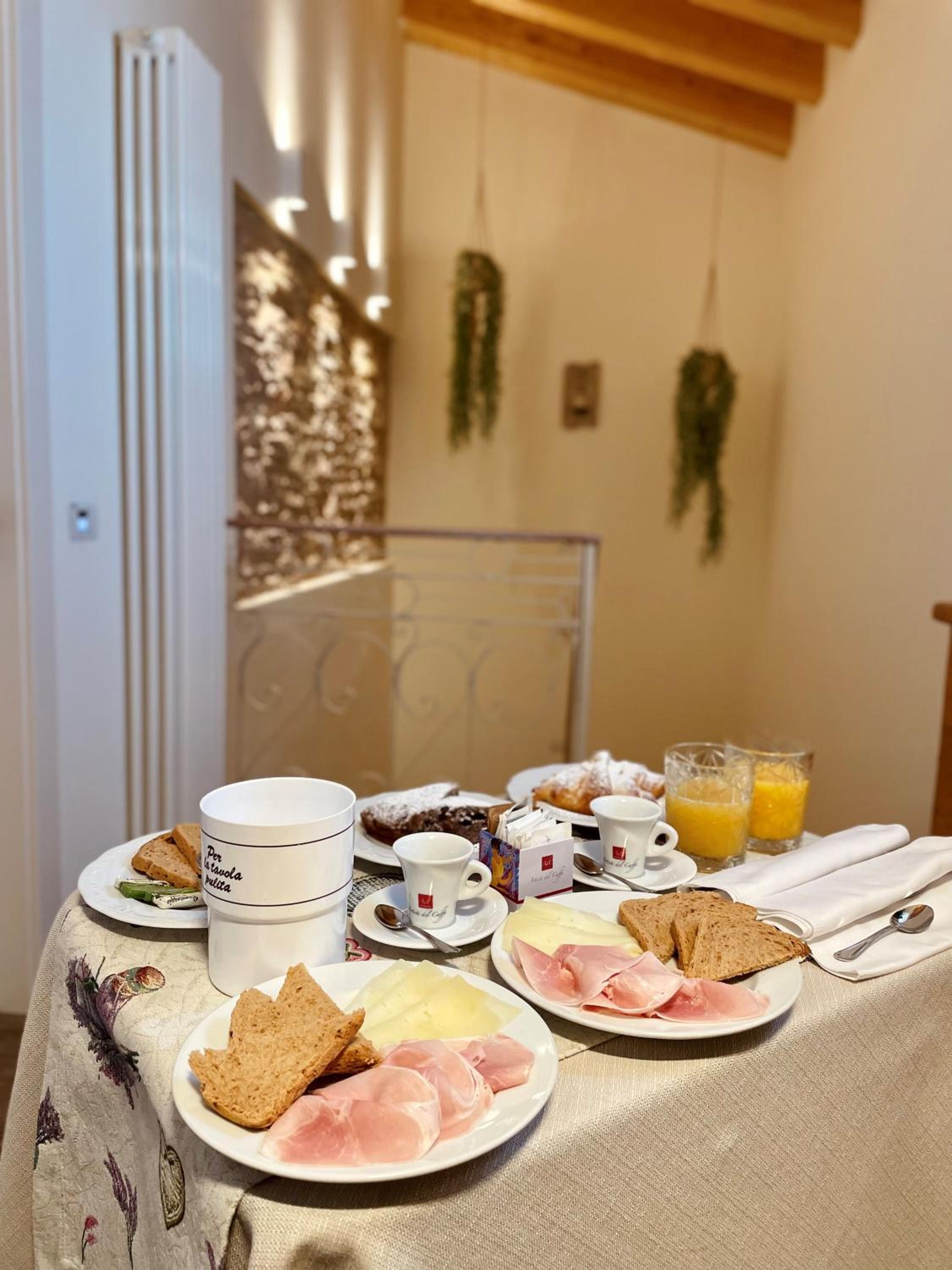 Colazione servita nella calorosa zona ristorante, ricca e squisita.