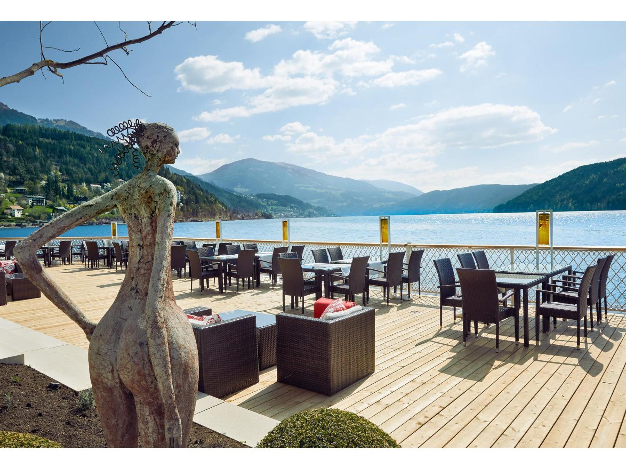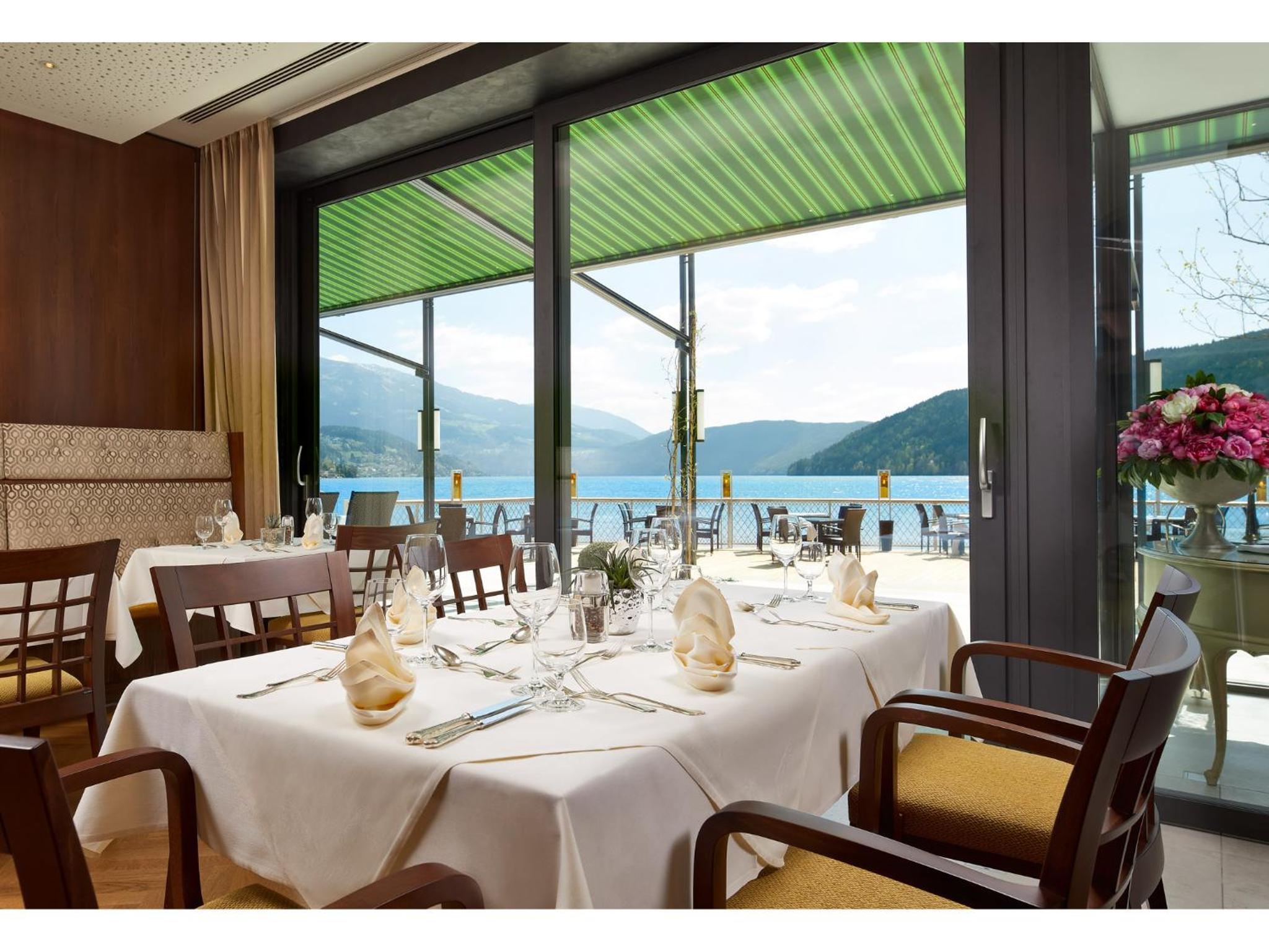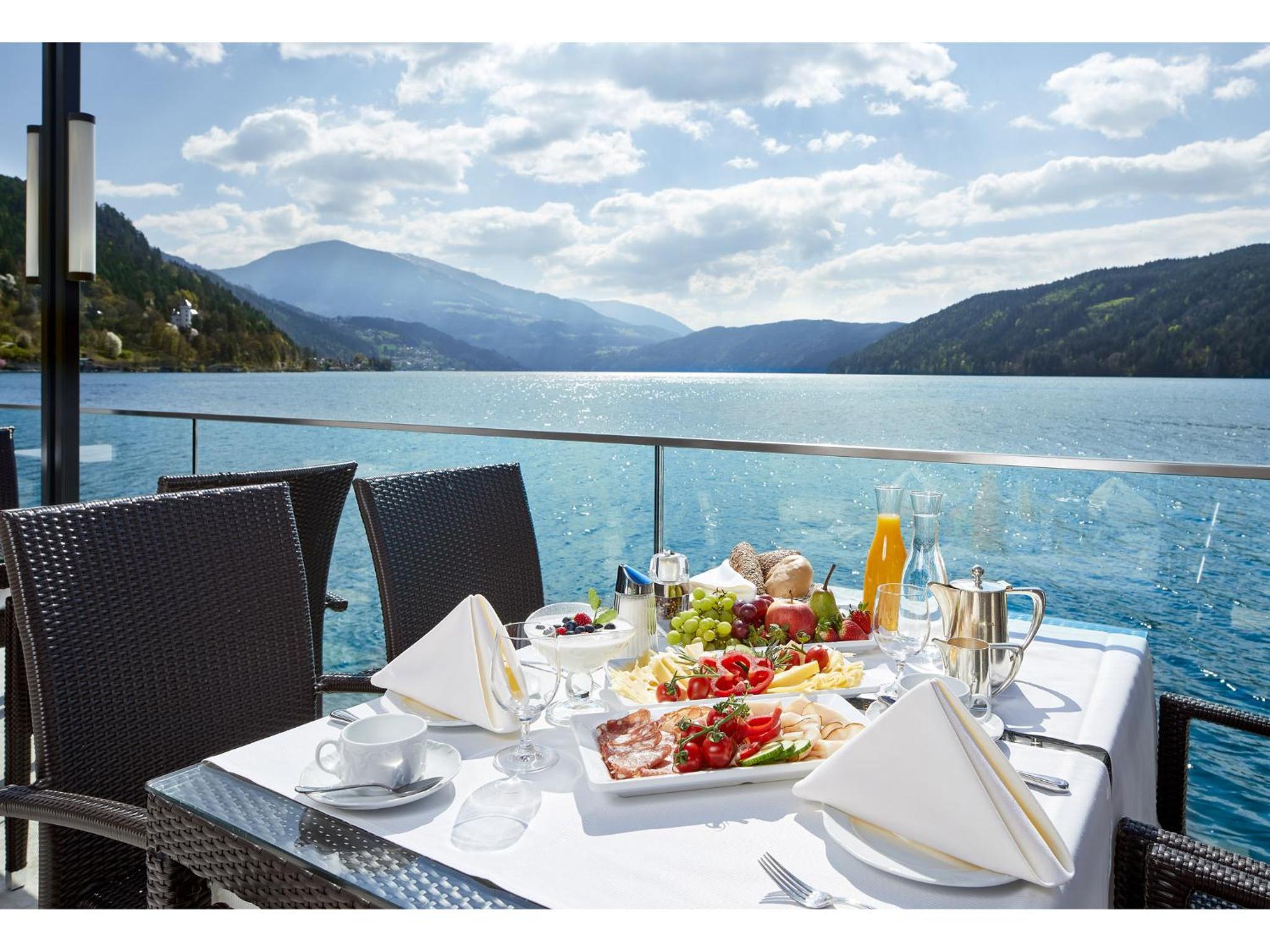 Start your day with a lavish breakfast buffet including an organic food corner. Opt for half-board to savor a 4-course gourmet dinner with a salad buffet. Enjoy meals on the terrace overlooking the lake in fair weather.