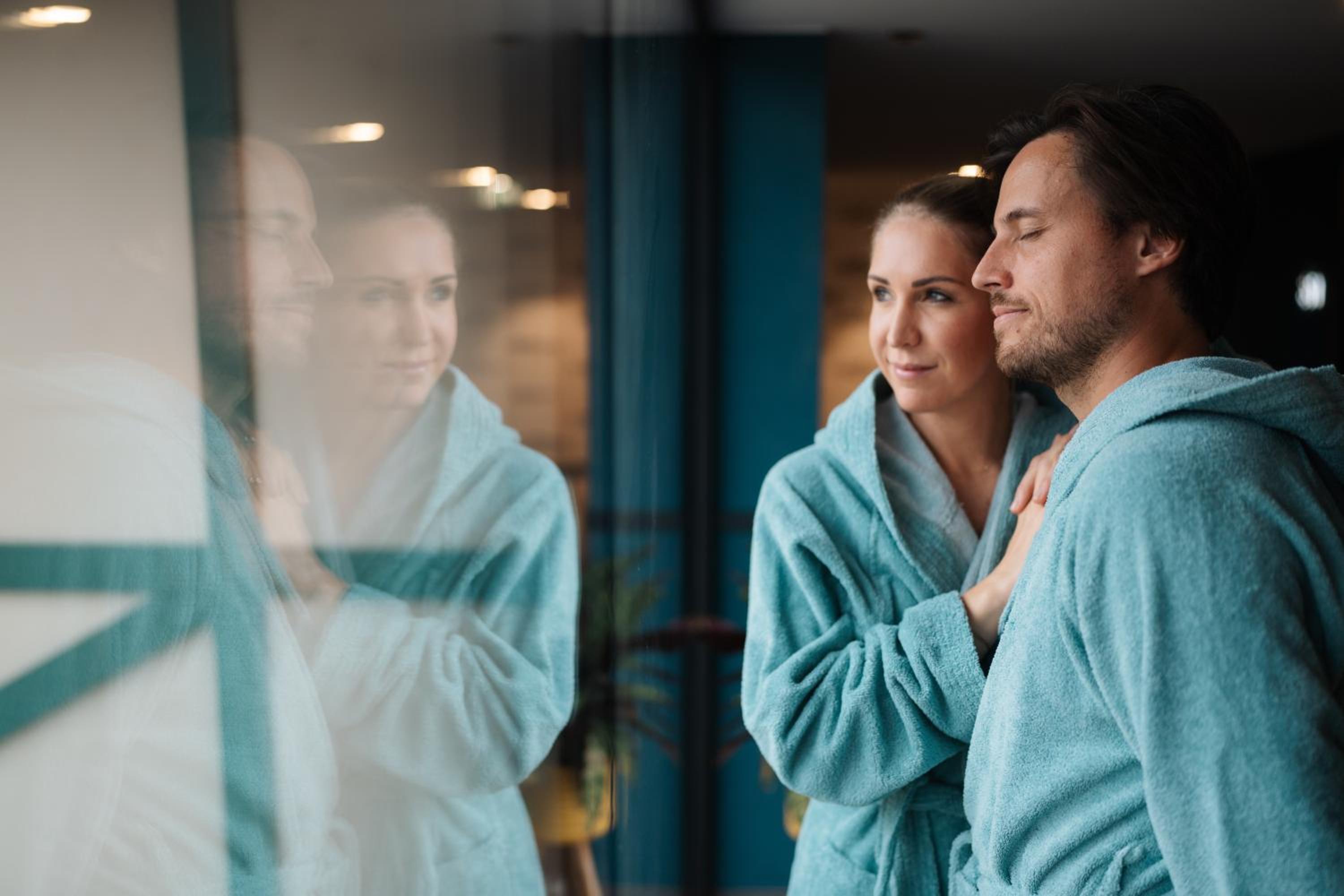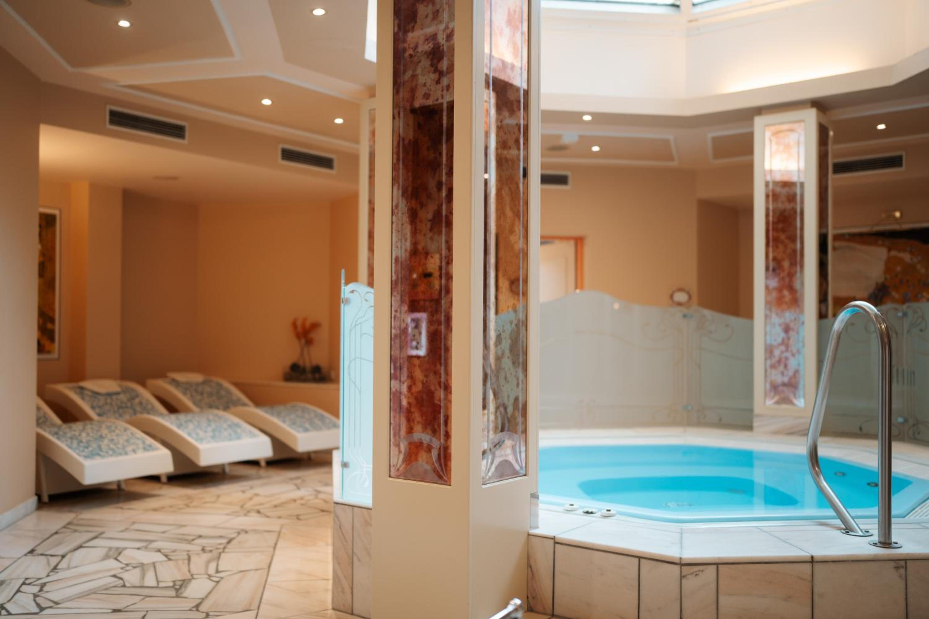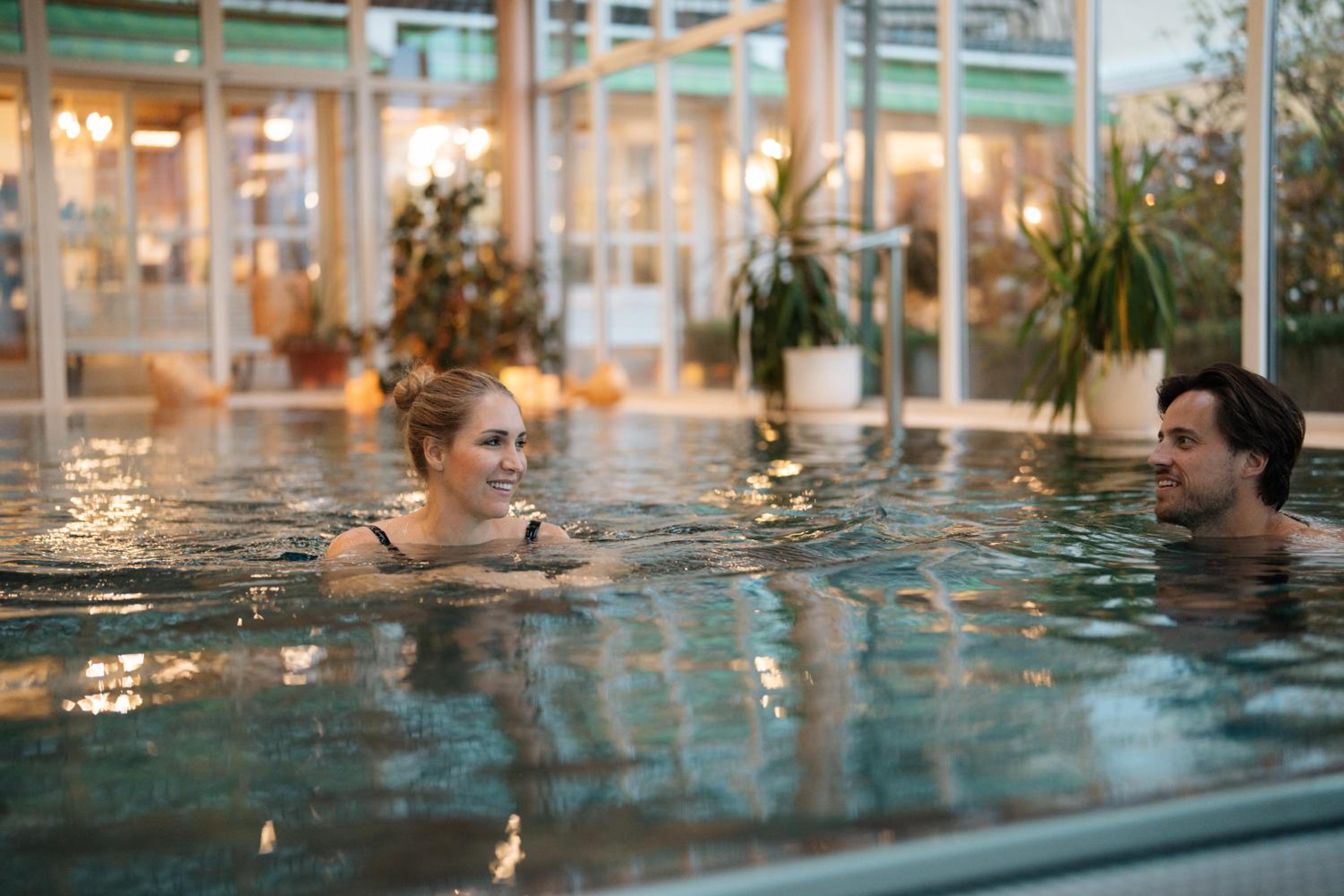 Indulge in the beauty and wellness oasis L'Aqua with various saunas, a steam bath, hot tub, and fitness room. Treat yourself to soothing treatments like mud packs or enjoy massages using premium products.