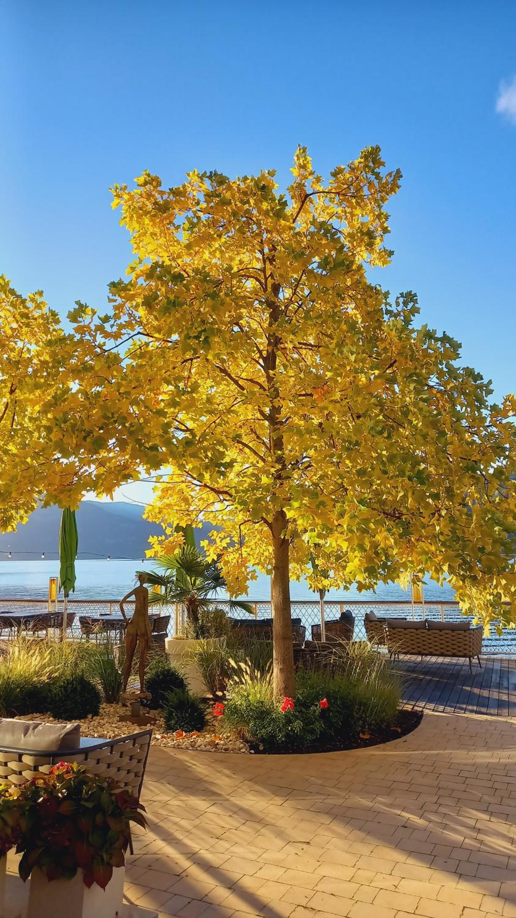 We betaalden voor een dure kamer met zeezicht, maar keken tegen een dak met zonnepanelen en een lichtkoepel aan, daarachter pas het meer. Als je in een stoel zat, zag je niets van het meer.