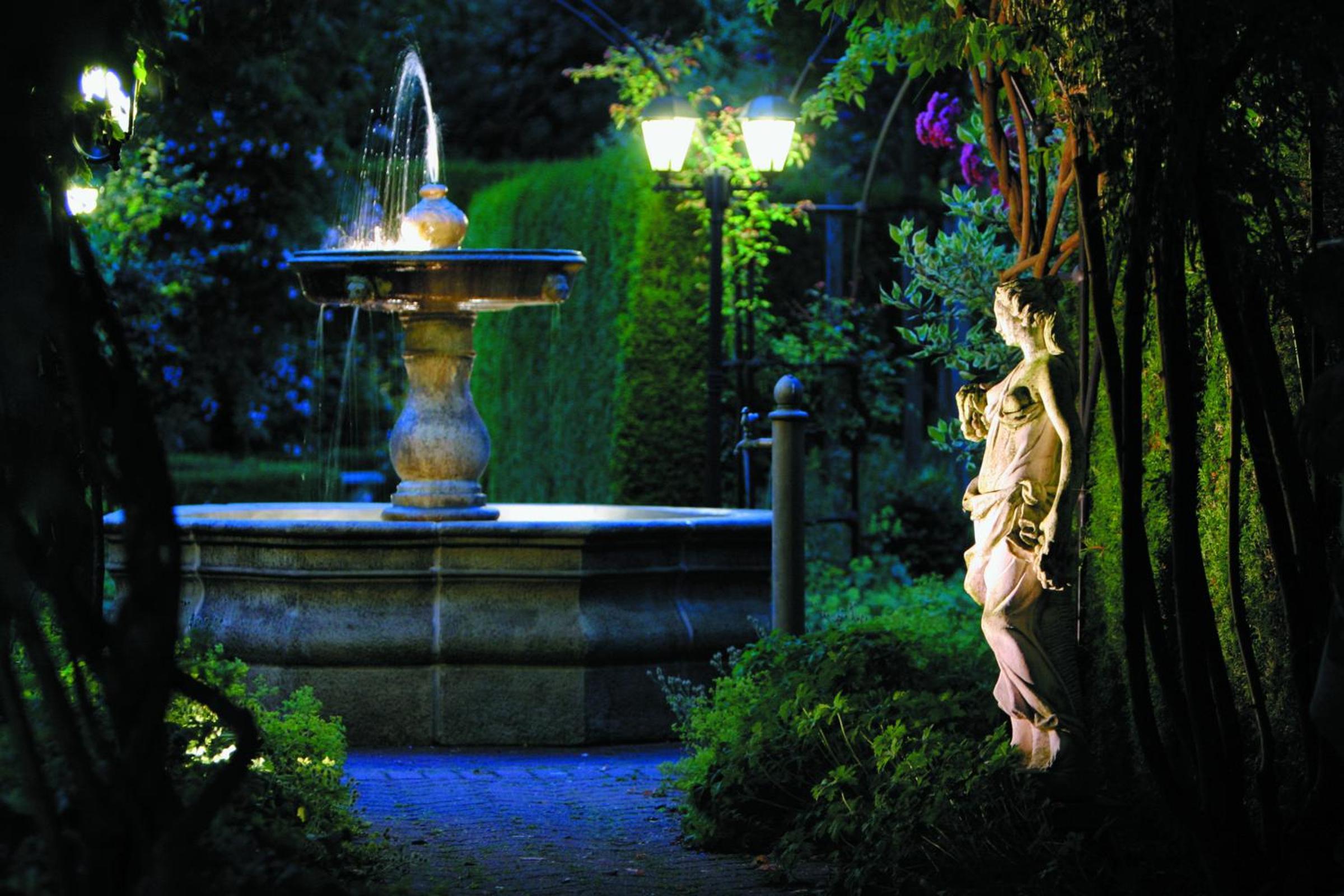 Os jardins e o restaurante.