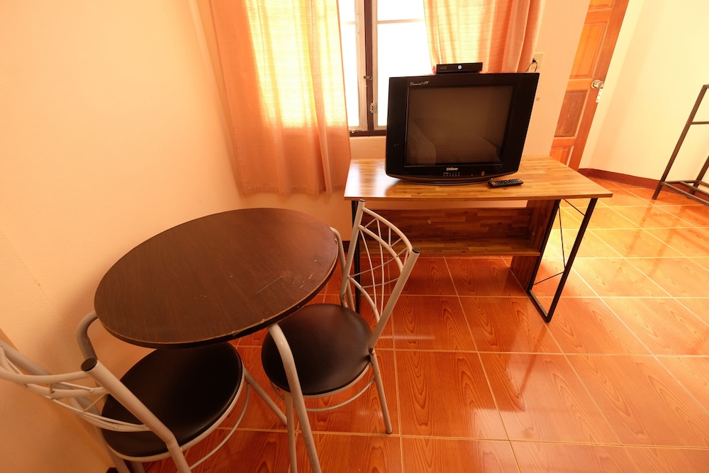 Room good but no where to put things. A table would be nice. Location good, 800 meters from the beach. Very quiet in very well maintained grounds.