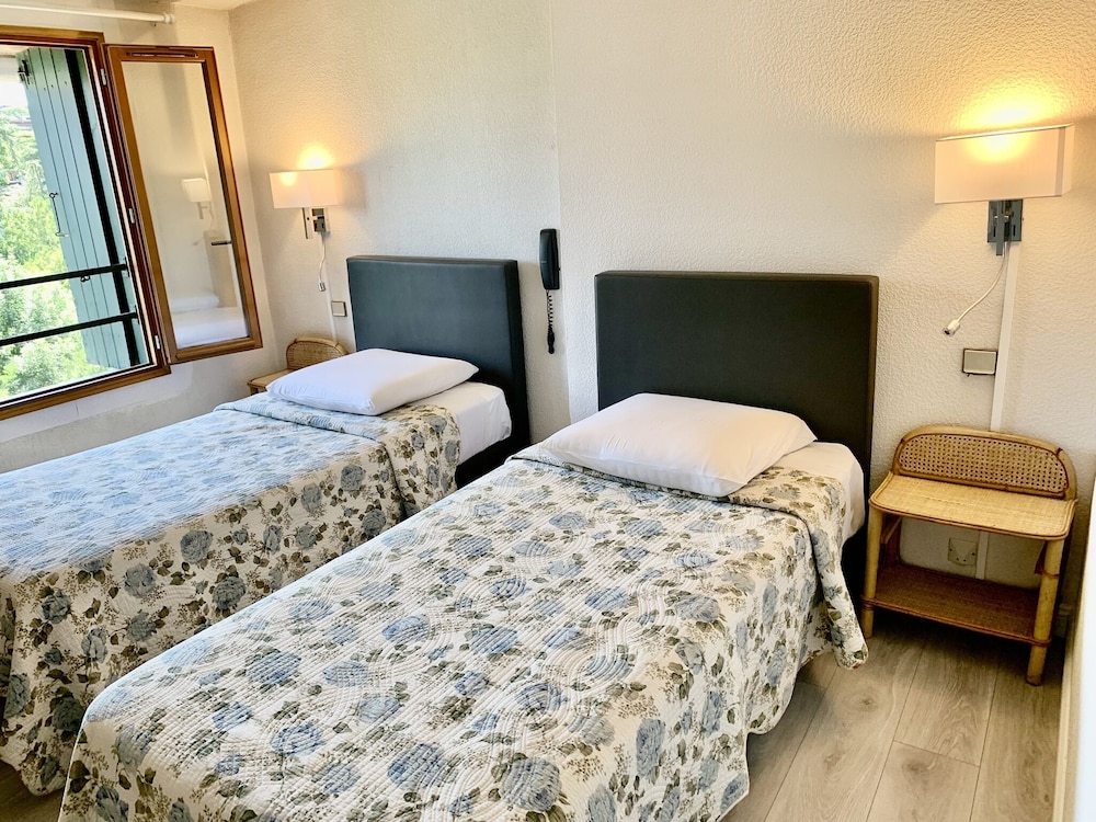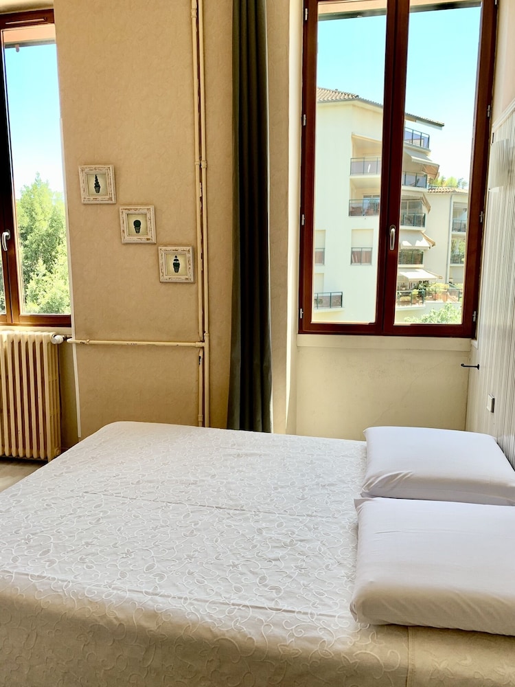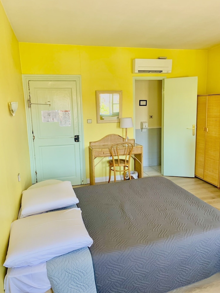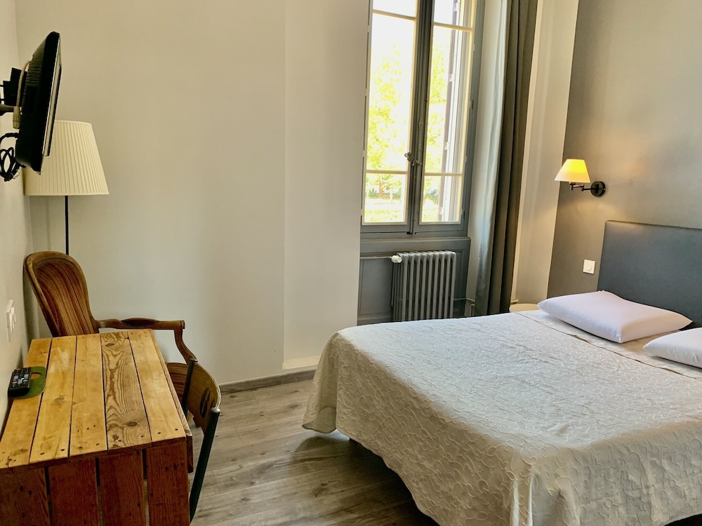 Déçu confort moyen une ampoule sur deux fonctionnait pas de wifi dans les chambres (3 ch rdc 1re et 2 ème étage ) pas de prise près du lit une seule prise dans la chambre et pour certaines chambres la prise ne fonctionne que si la lumière est allumée pas de verre à la salle de bain pas de produit pour la toilette juste un distributeur de savon à peine rempli une serviette tachée changée avec insistance le lendemain bref cet établissement profite de son excellente situation et de la piscine . Mais ce n’est pas du tout suffisant le petit déjeuner est correct sans plus . L’accueil est sympathique.Pas de Clim dans nos chambres et celles qui donnent sur la rue sont bruyantes si on les ouvre pour avoir frais….Nous ne retournerons pas dans cet hôtel.