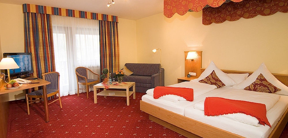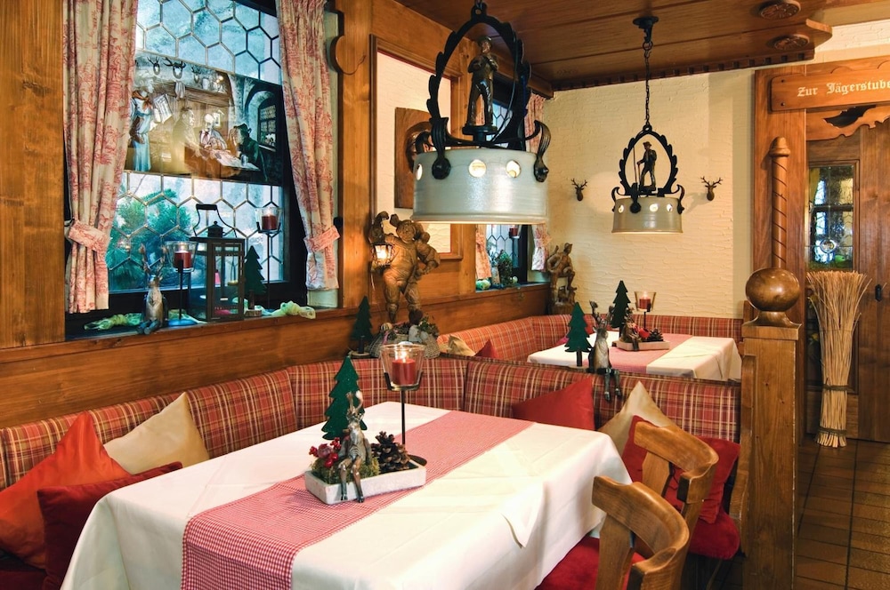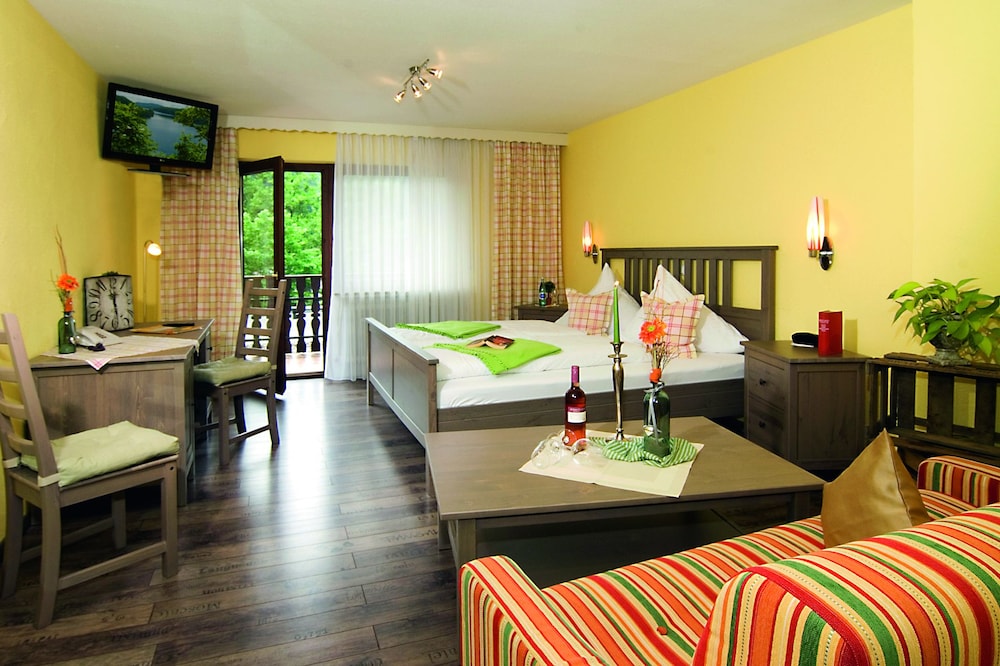 Our room at the back of the hotel overlooking a wooded valley was perfectly pleasant and the beds comfortable though my partner found the pillows too high. The bathroom had a rather leaky shower (with three-part doors which were inclined to come off their runners but the shower itself was fine. All was clean if a bit dated and we ate a perfectly pleasant and reasonably priced meal. Breakfast was good. The dining room décor was classically Germanic and made us laugh - every table had a miniature gnome as decoration! All in all a nice hotel and good value