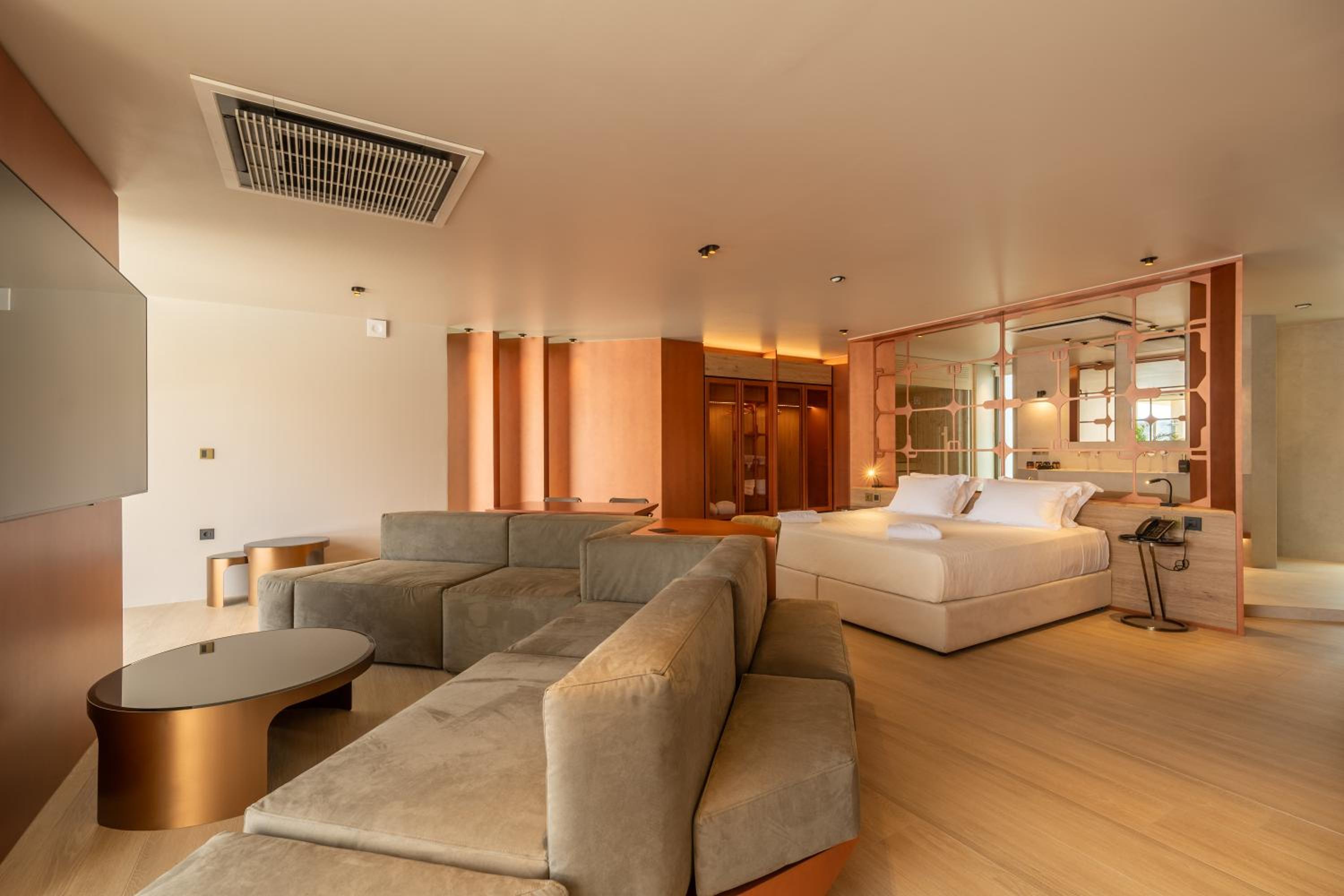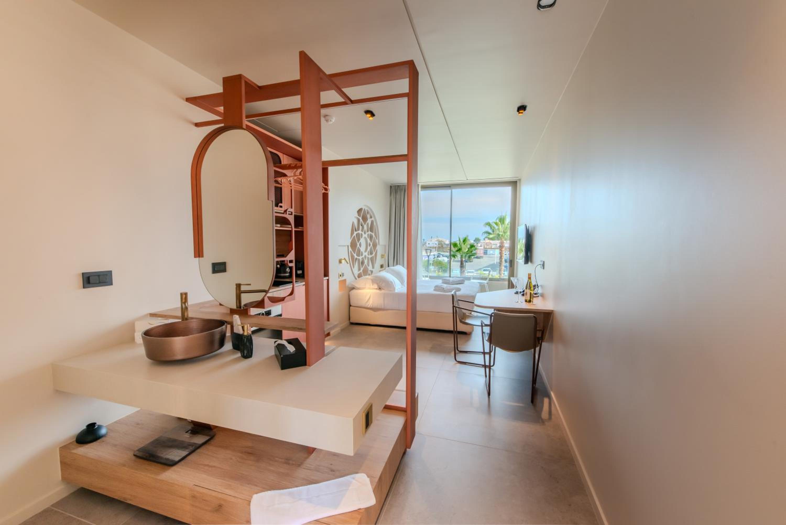Indulge in stunning sea views from the comfort of your room's balcony. Immerse yourself in the beauty of Chania while enjoying modern amenities like a flat-screen TV, coffee machine, and fridge.