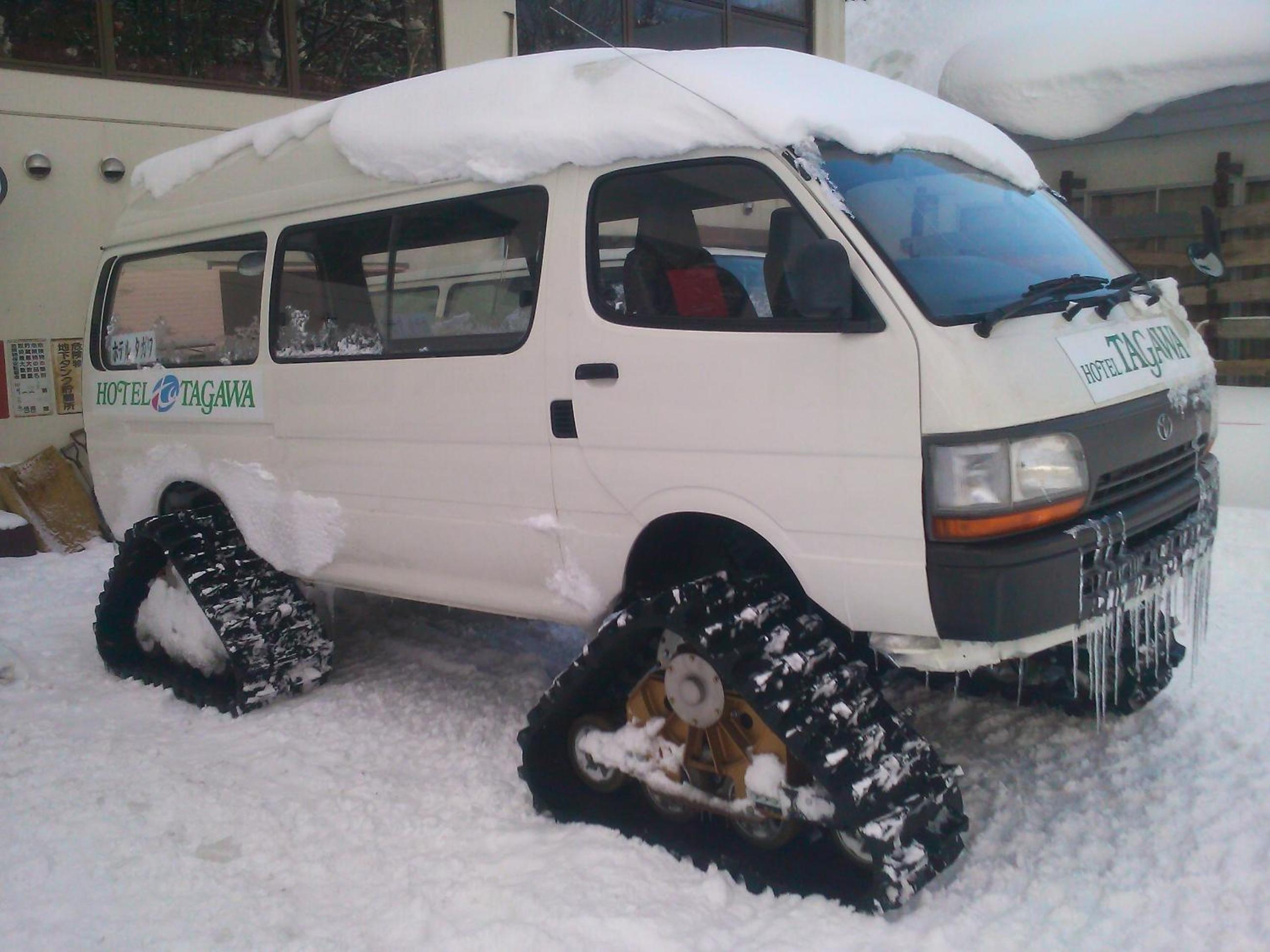 竜王スキーパークでスノボするために宿泊しました。急いで予約したのでちゃんと確認していなかったのですが、ホテルがゲレンデの中間地点にあるためスキー場駐車場から雪上車で送り迎えになります。なにしろゲレンデの途中にホテルがあるわけですからホテルを出て即滑り出せます。そこは最高です。