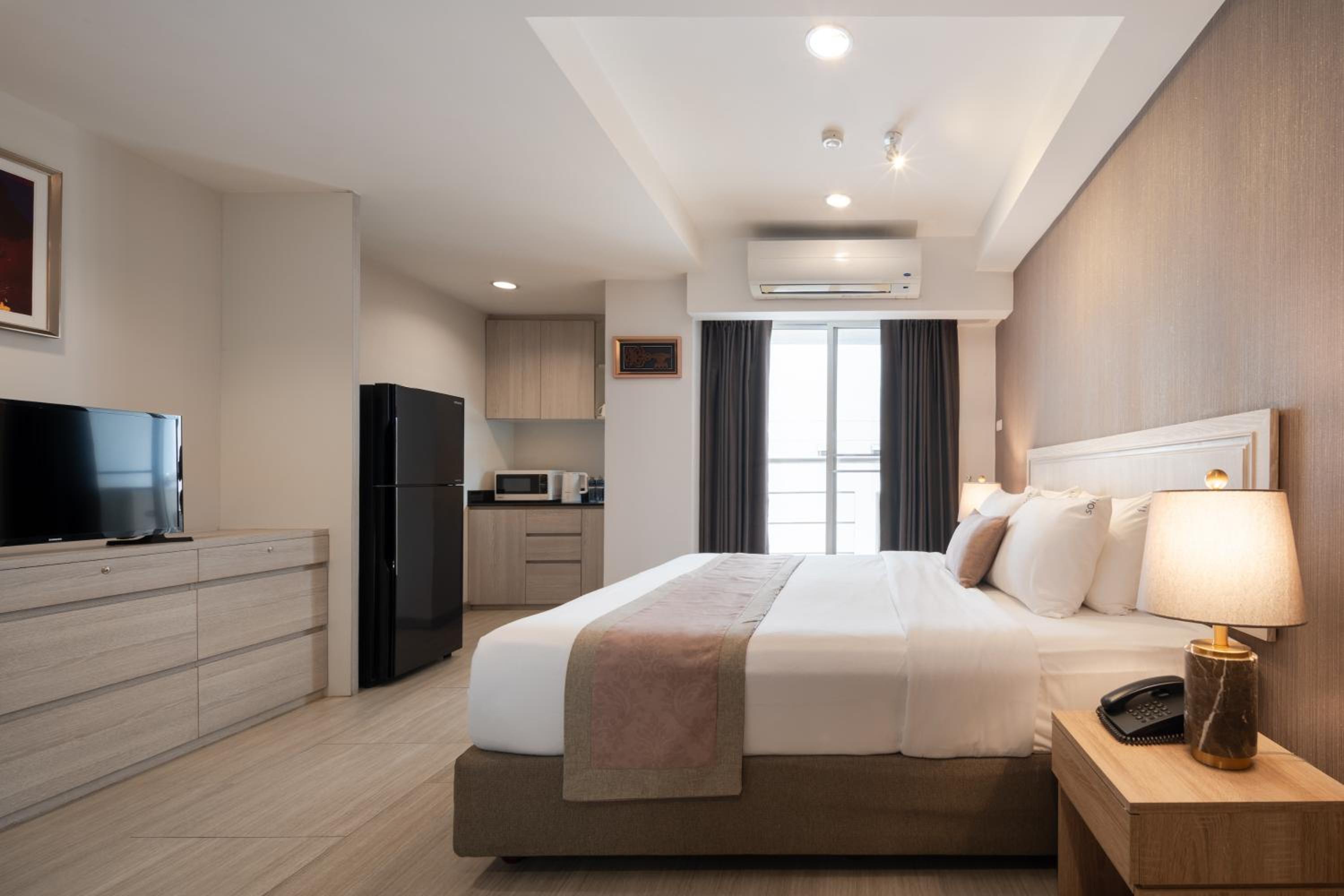 The guest rooms at Aspira Residence Ruamrudee are designed to provide ultimate comfort, featuring amenities such as air conditioning, kitchenette with microwave and fridge, and plush bedding. Some rooms even include a kitchen for added convenience.