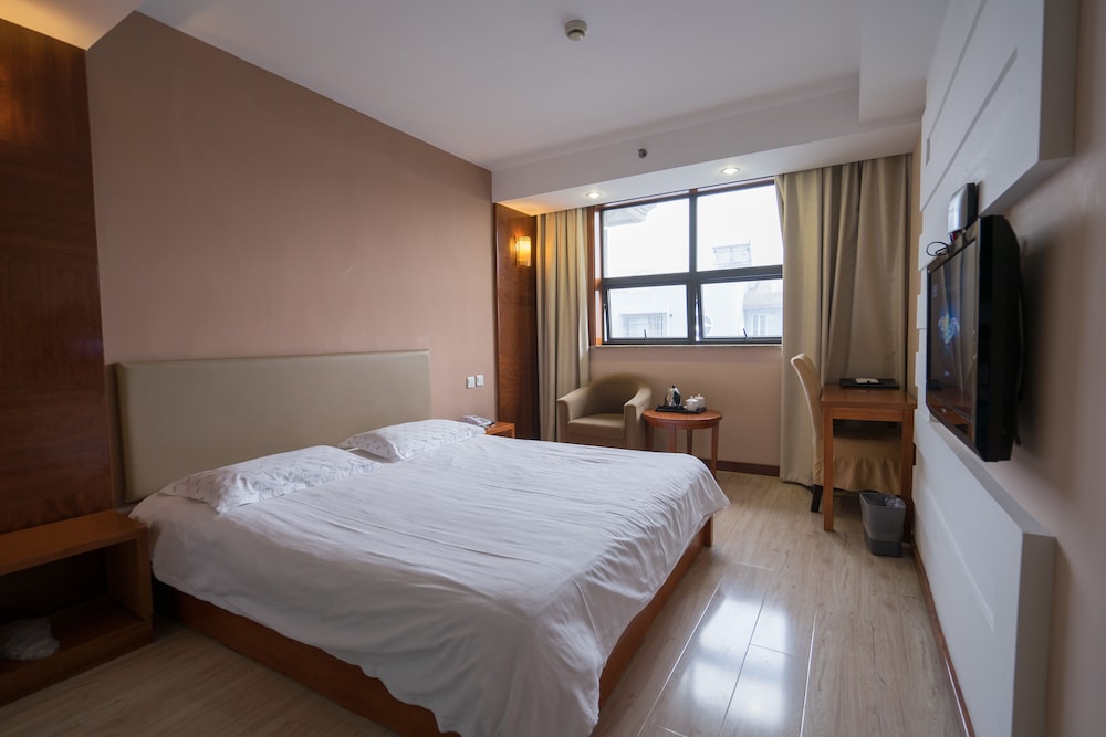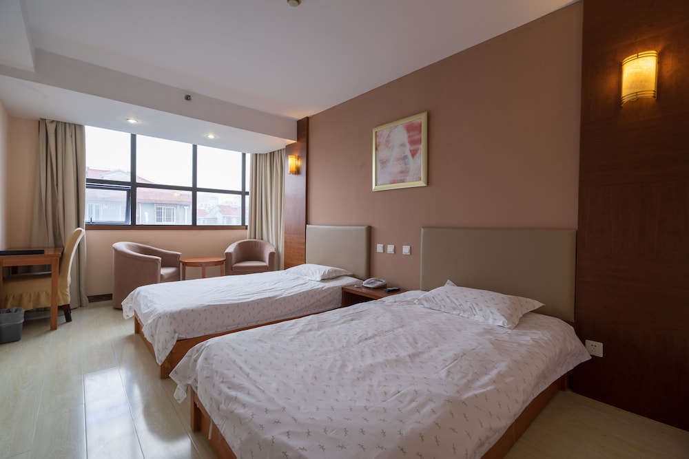 Knew some English, no problems checking in. Nicer area, if you come don't miss the Chines cultural park/hotel nearby. easy 5 min walk to green metro line 2 that connects to PVG and downtown. grocery store a block away. no water in room but it is made up every day. normal hard beds WiFi only works in lobby but there is a desk there to use good bargain for the money Old but clean enough