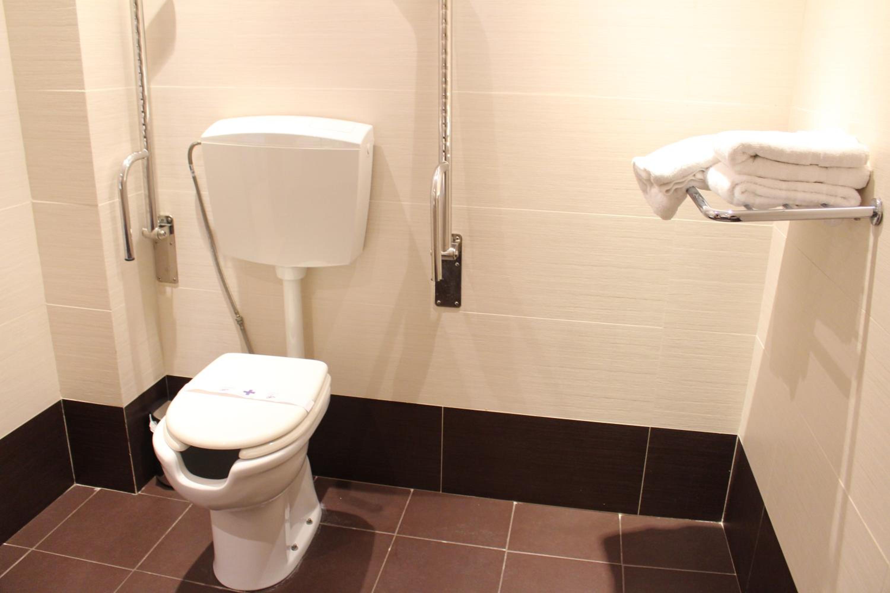Salle de bain peu pratique mais adaptée au PMR.
