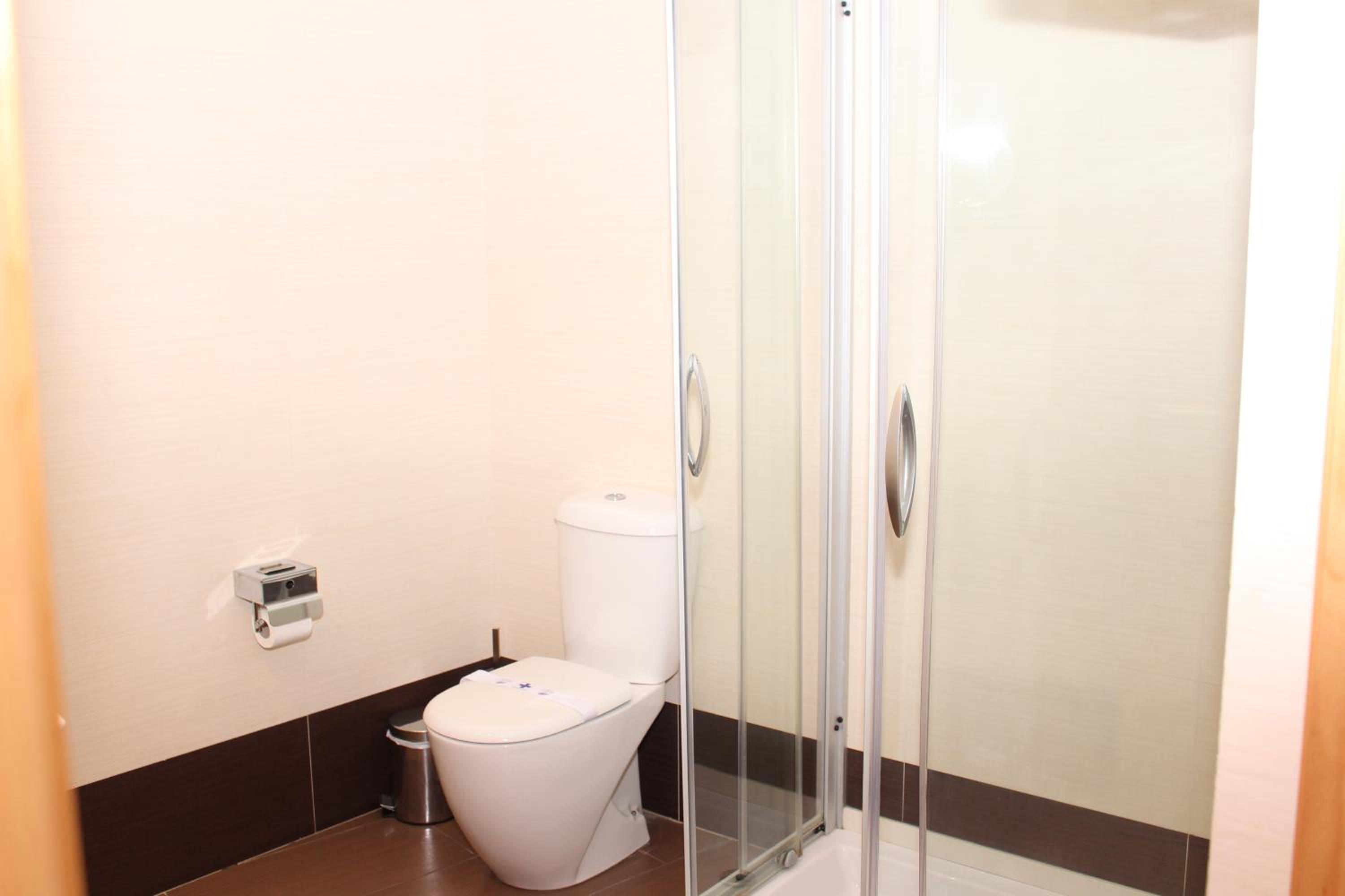Douche (rideau) et WC dans la même pièce et au même niveau, ce qui fait que le sol est trempé jusqu'au WC après le premier à passer sous la douche ...