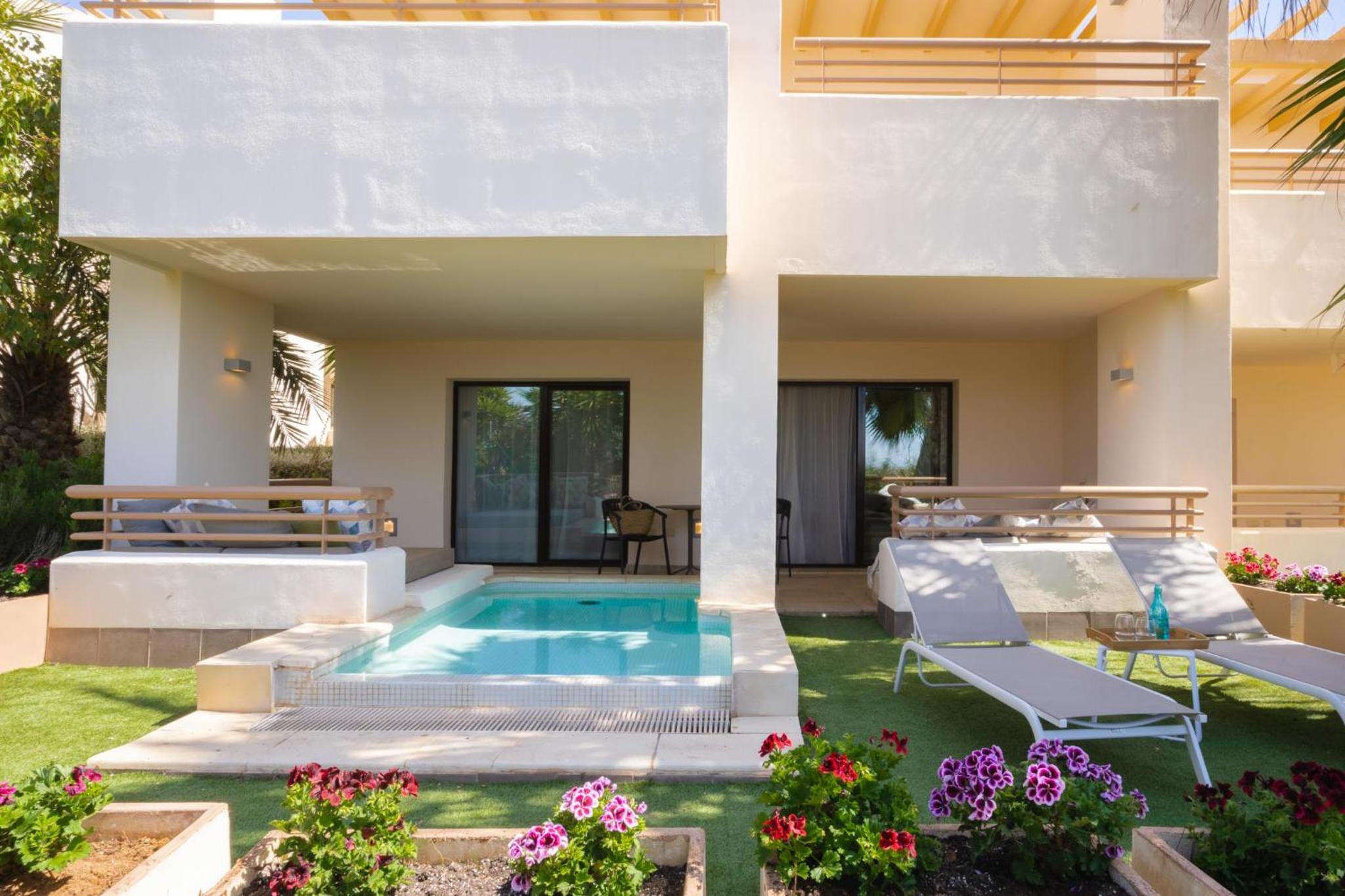 Veel ruimte in de kamer en mooie badkamer met fijne jacuzzi