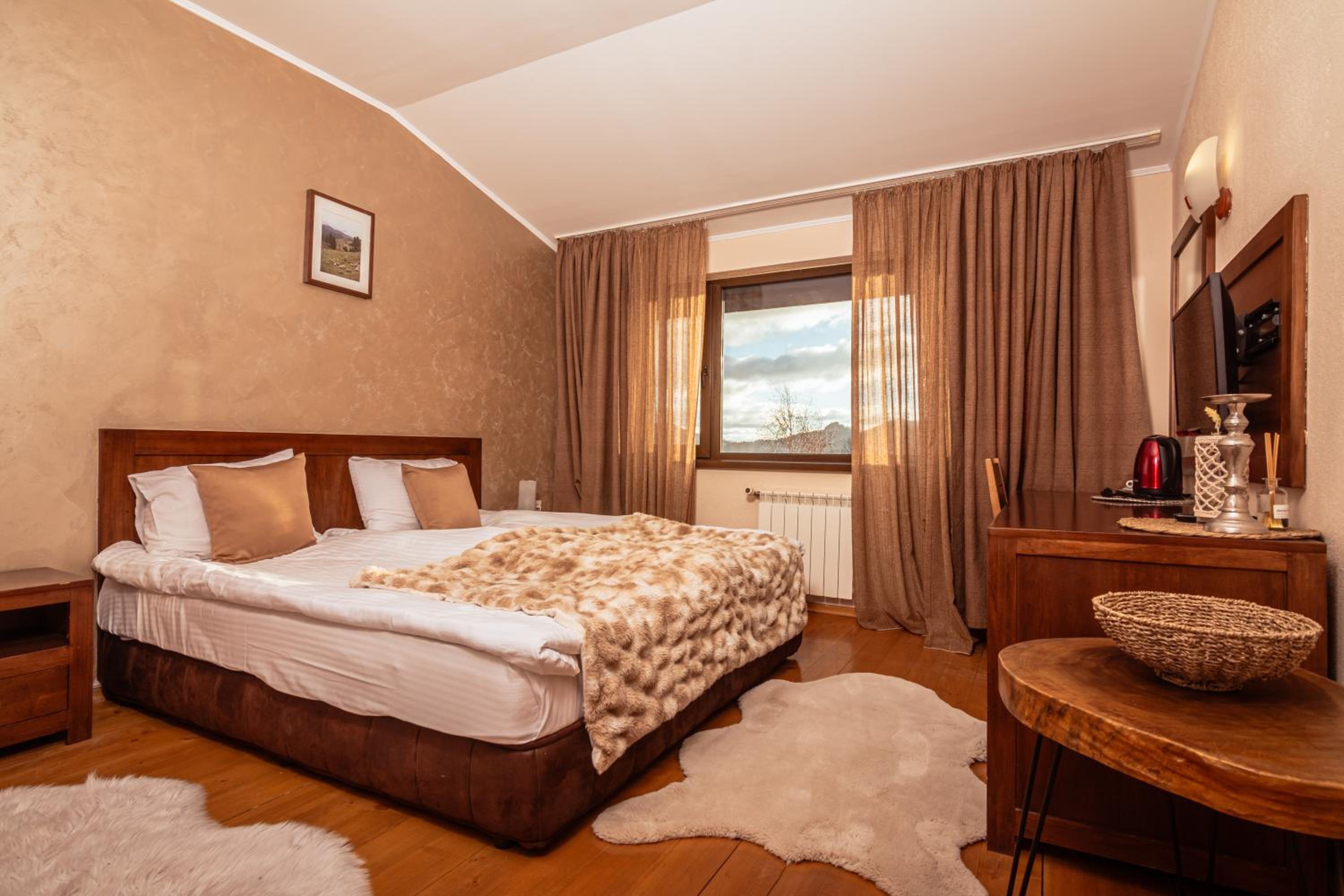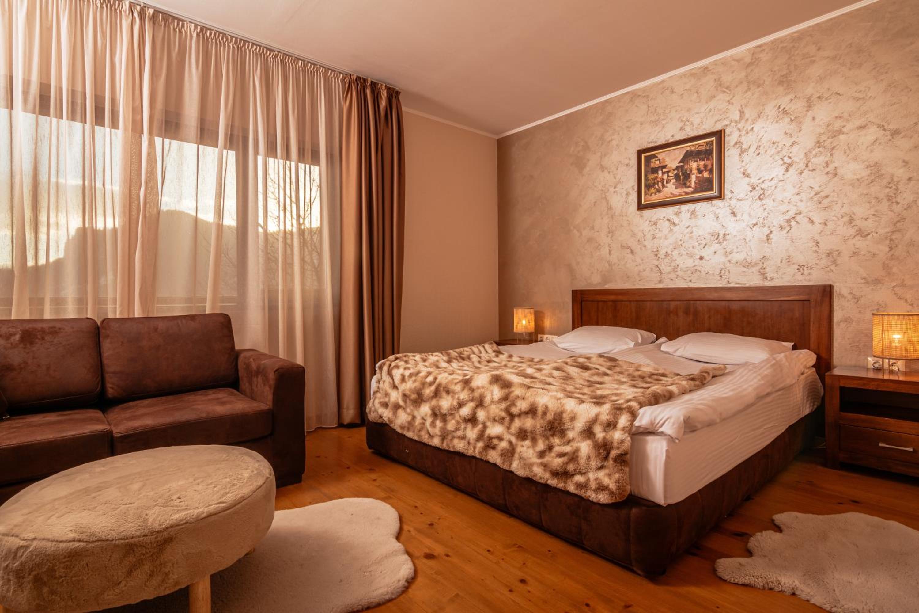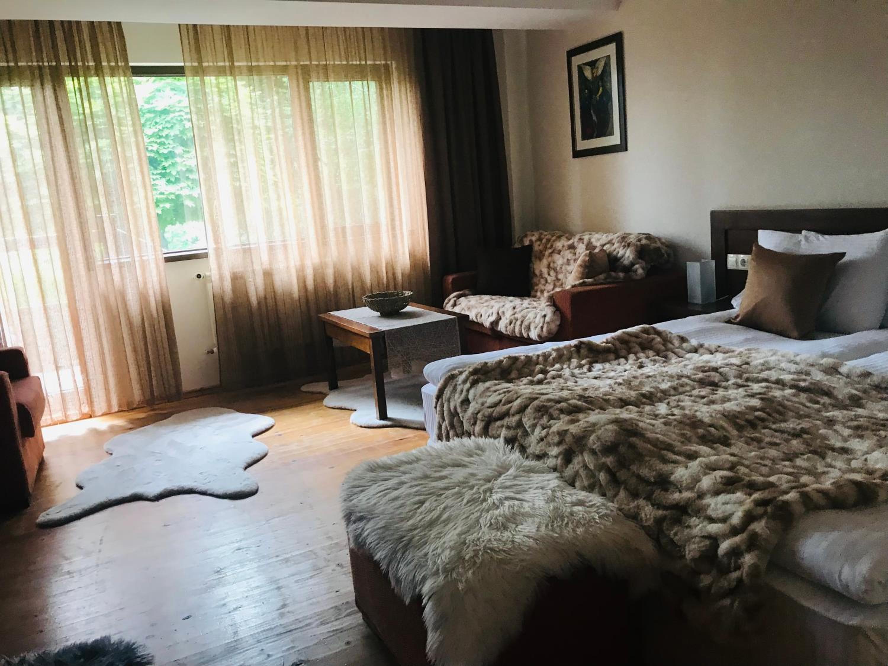 Sehr hübsches, stilvoll eingerichtetes, grosses Zimmer mit Blick auf die Berge. Schönes Restaurant, leckeres Essen, abwechslungsreiches Frühstück. Wir bekamen Wandertipps und Rhodopentee und die Kinder spielten stundenlang mit den süssen Katzen.