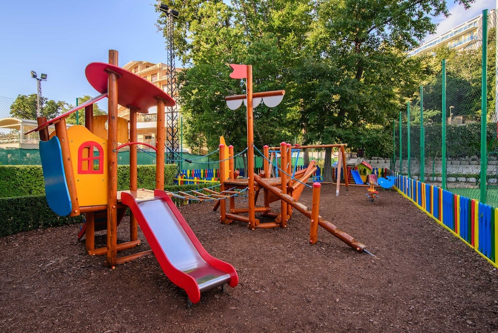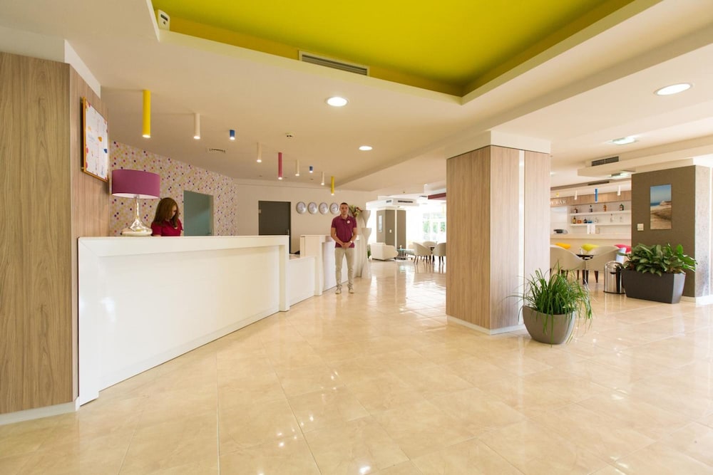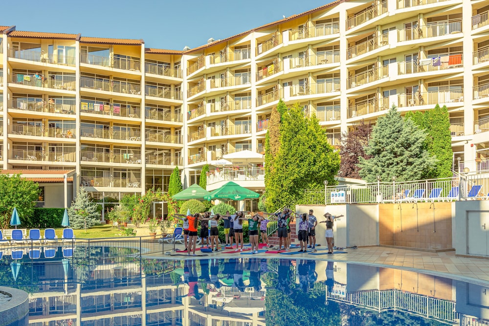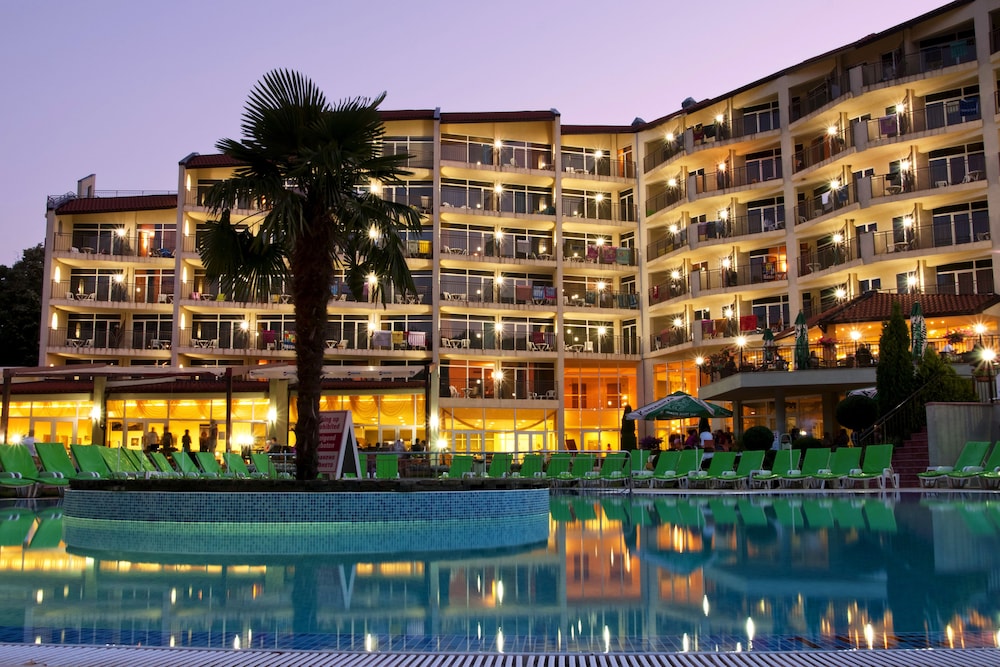 This hotel is in the middle of tourist area. There's nothing but hotels and tourist bars and shops. And of course the wonderful beach and sea. The hotel itself is okay, not great. I found the interiors to be not so cozy but more a bit clinical, but with comfy couches and chairs. The staff seemed to be young with different level of quality in English. Some spoke quite rudimentary some spoke well. They weren't well educated on activities or sights outside the hotel area, but trusted on google to find out about them. Breakfast was very large with loads of choices. Dinner had 3-4 choices and again loads of side dishes and desserts. Unfortunately no fresh fruit juices,but concentrates.I didn't really like them except for the pineapple which was available only at one bar. There was also a pizza bar and icecream stand during the day. Free drinks were all Bulgarian made. If you wanted a normal coca cola you had to buy it. Swimming pool was very busy with people. There was also night program which seemed to be aimed more toward young people (unfortunately i didn't take part on music quiz). In short if you're looking to simply have a beach holiday with okay hotel this is well worth it.