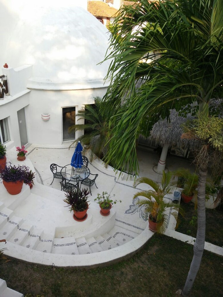 The hotel is built on the side of a hill. It shines white and many rooms have domes. The internet was at times spotty. The bathrooms were a bit dated but worked. Hot water took a bit of time to ramp up. I wanted to get that out of the way because the rest of it is excellent. Comfortable beds. Great pool. Wonderful friendly staff. Place was spotless. It is located in a residential neighbourhood about a Pleasant ten minute walk to the Playa Santa Cruz. This is the main beach in Crucecita, and ii is lined with restaurants.