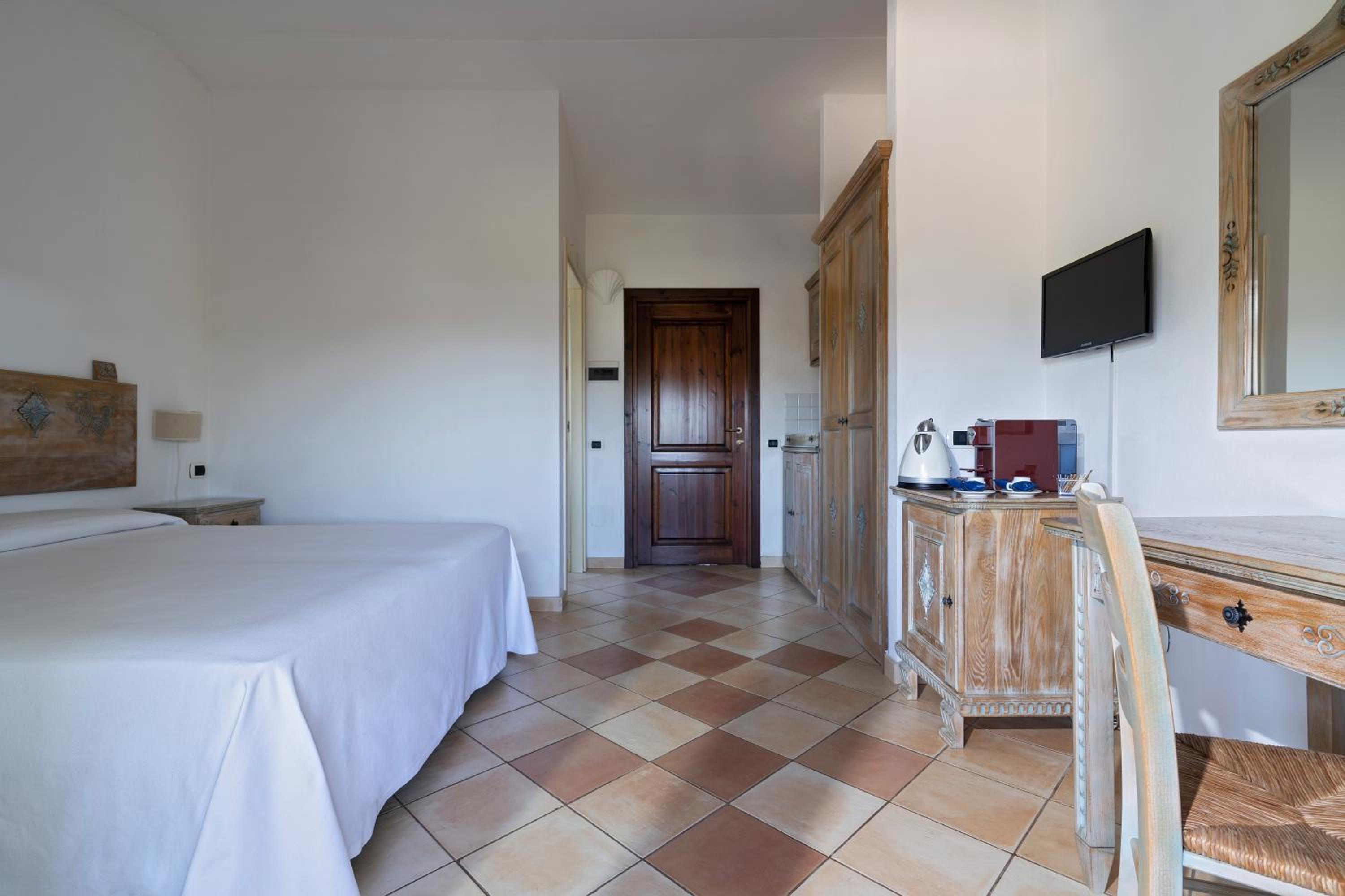 Bellissimo residence. Le stanze, arredate con gusto e con mobili della tradizione sarda, si affacciano su un piccolo giardino protetto dal vento e dal mare da un’alta siepe, che quando fiorita deve essere stupenda; il mare, dal nostro appartamento al piano terra, non si vedeva, ma si sentiva.