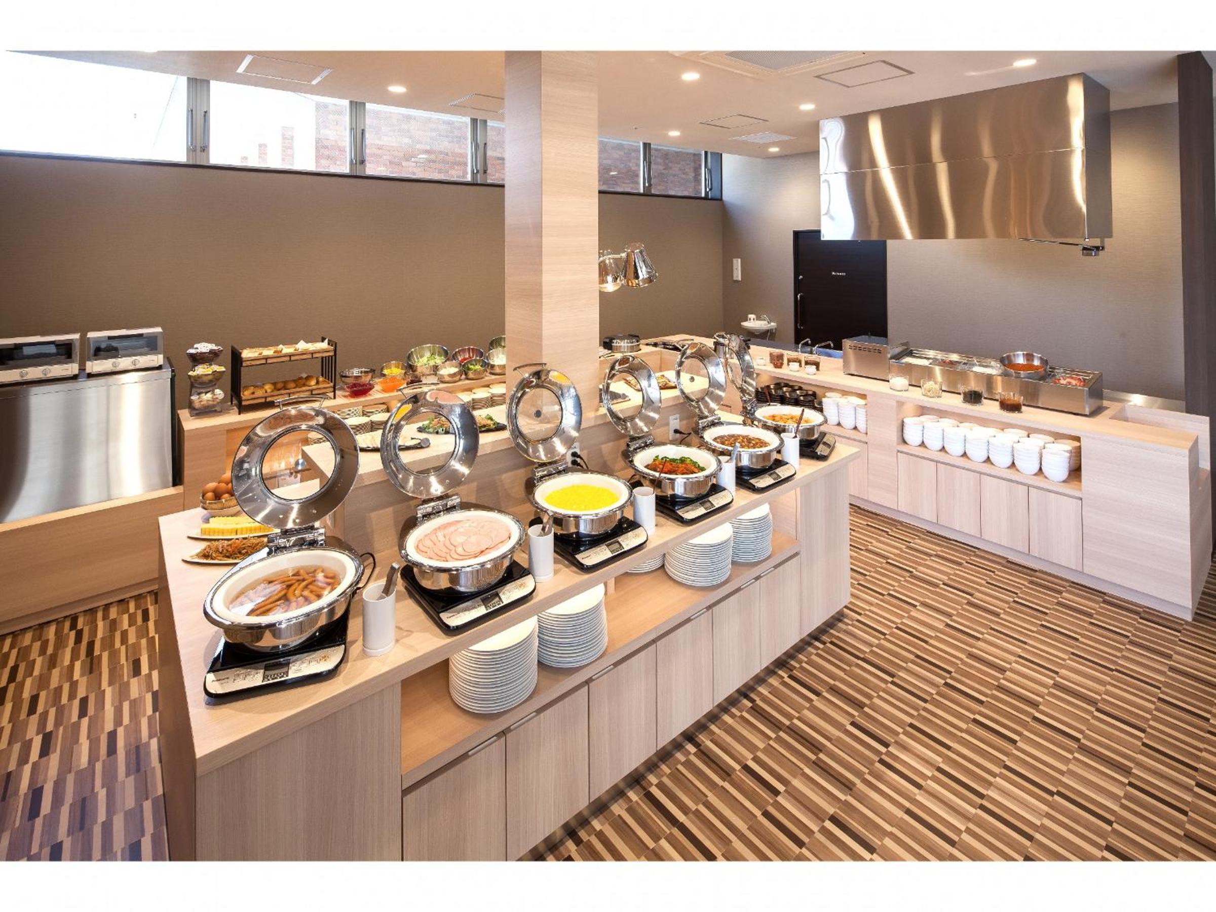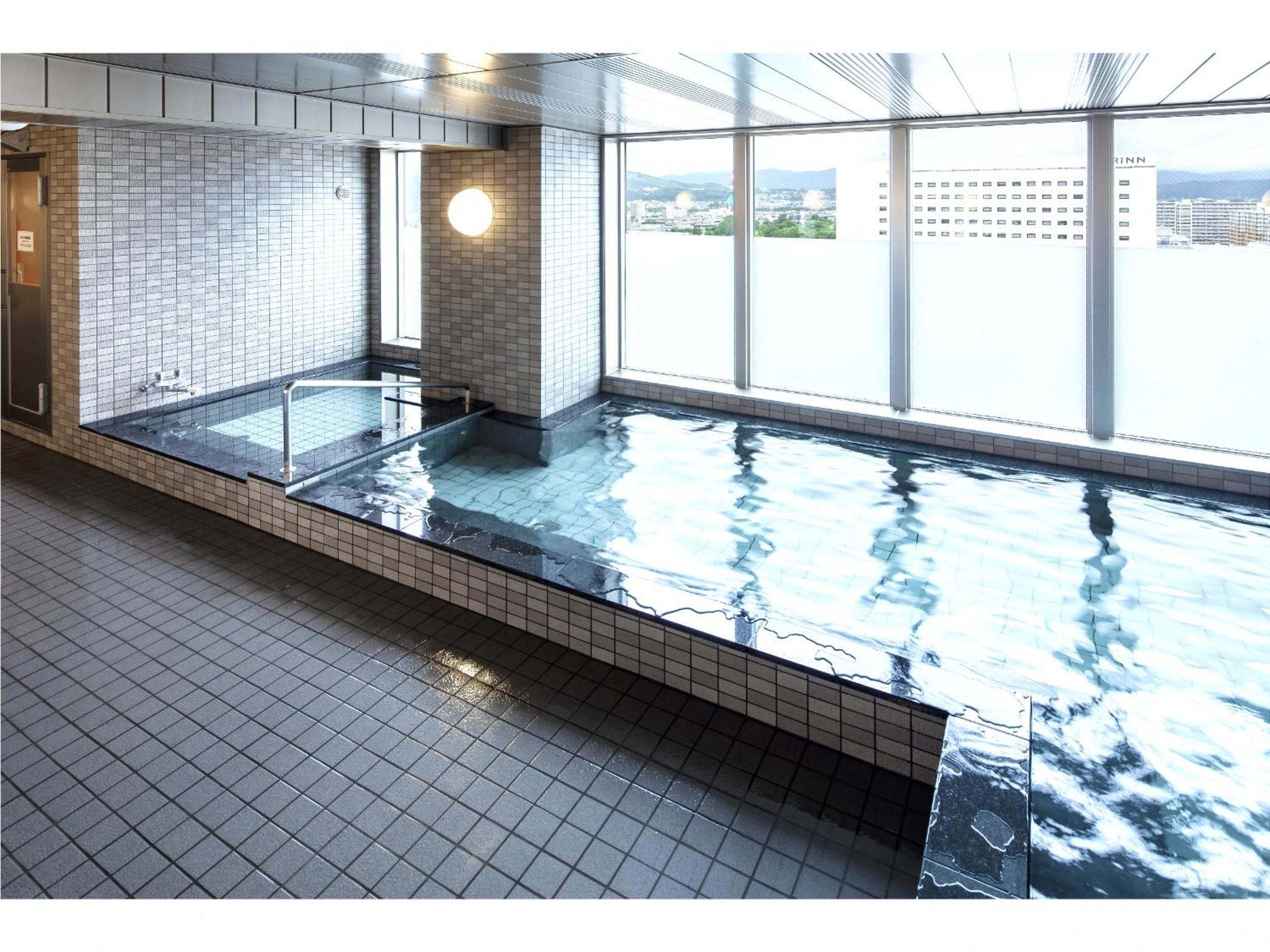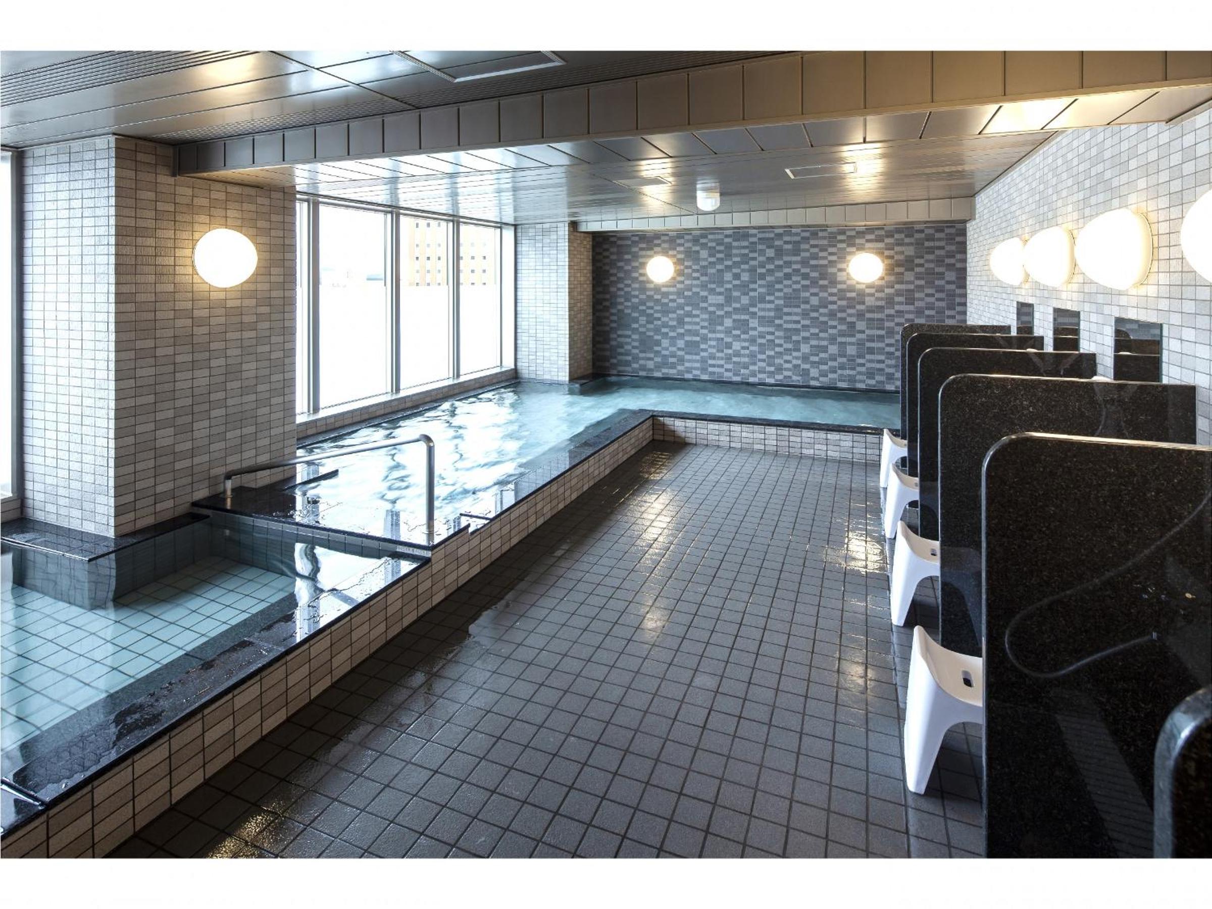 ホテルは駅前、最上階の大浴場はキレイで温かく、朝のビュッフェも品揃えが豊富で楽しいです。