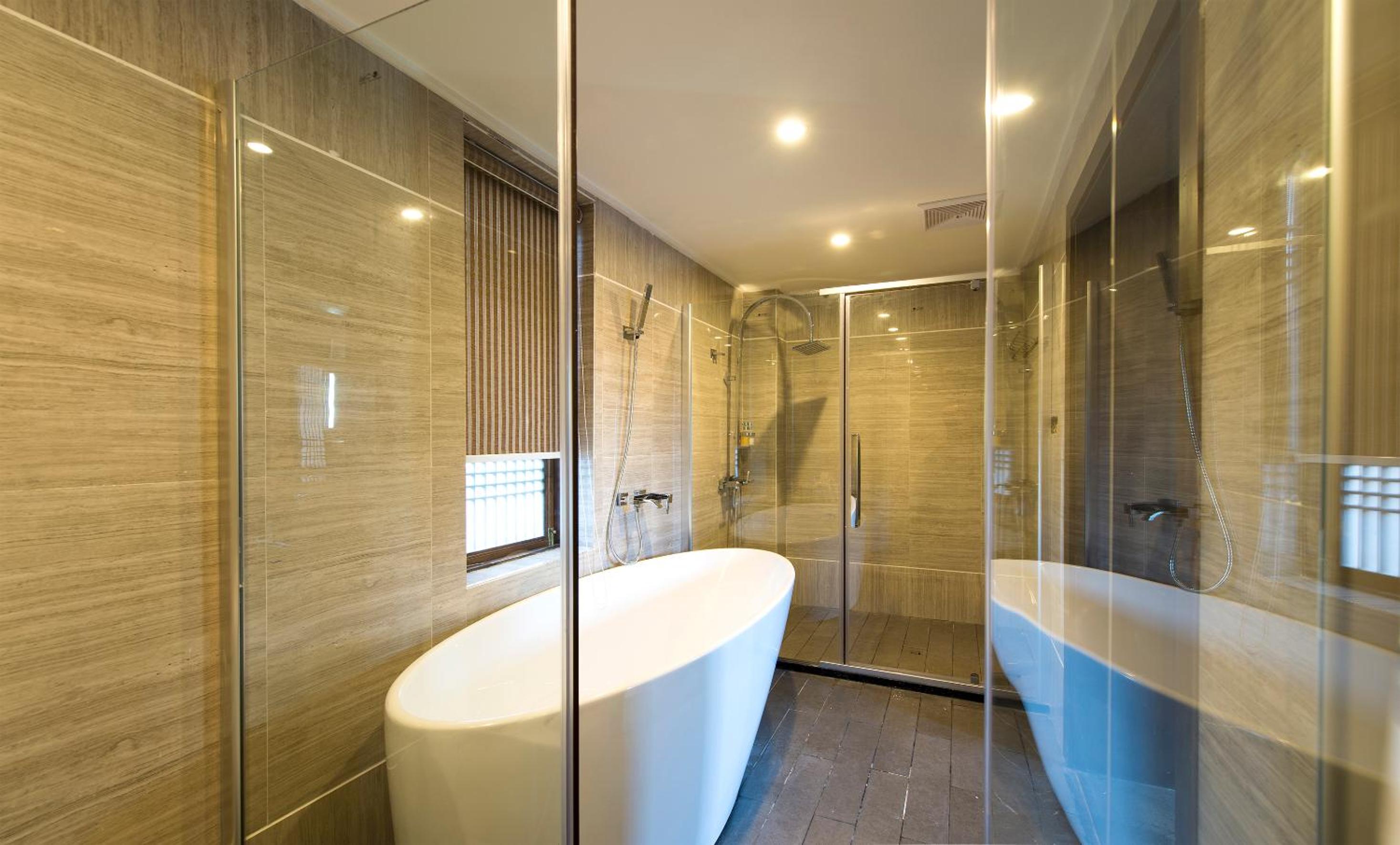 The bathroom does not have a proper exhauster, which might be due to its connection with other rooms. It is a little uncomfortable entering this beautiful, quite modern bathroom and smelling the bad odour