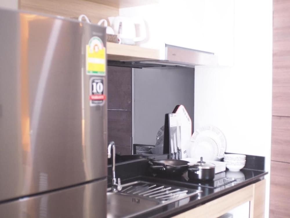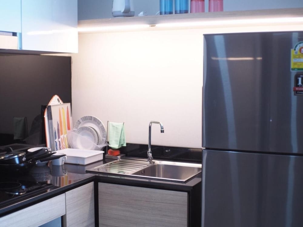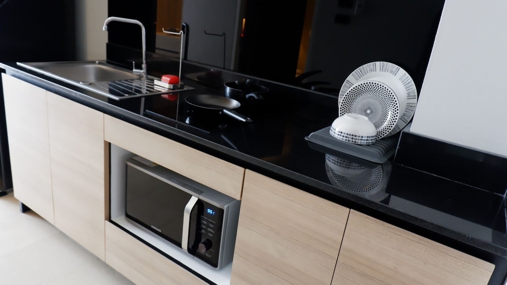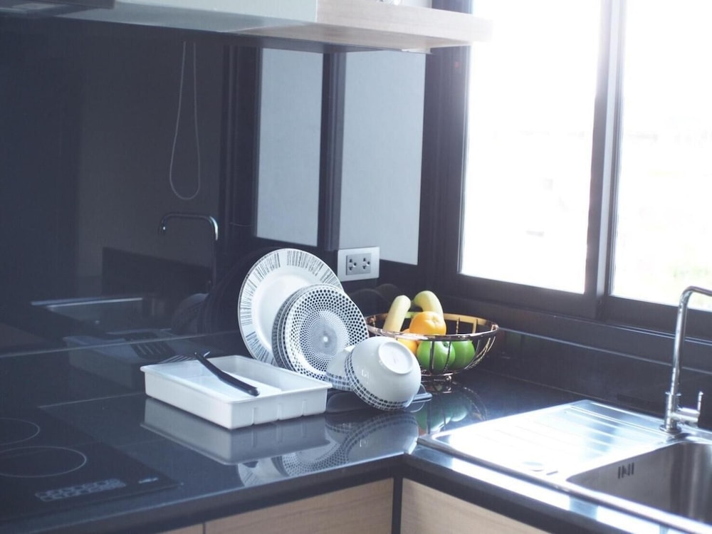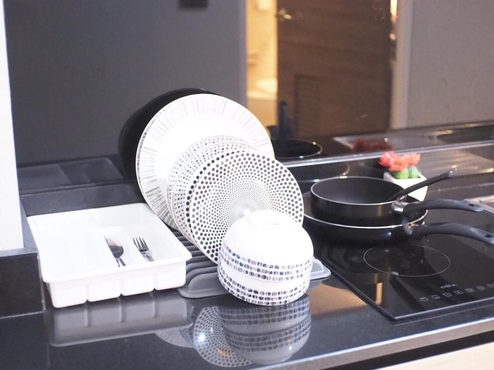Lots to like: Staff super friendly & helpful. Building fairly new. Room layout thoughtful - lots of natural light, balcony, large window in bath. Large well-lit mirrors, outlets in useful spots, lighting in closets, lots of storage space, air conditioning works well, bed is soft, good water pressure & hot water. Rooms facing mountains don’t hear much traffic. For short stays: 2 mugs, instant noodles & coffee. There is a hot plate. For longer stays, ask staff for bowls, plates, silverware & cooking utensils. Pool towels new & fluffy. Back gate to path to the shopping center avoids street traffic.You can buy anything else you want for the room there. I would happily stay here again.