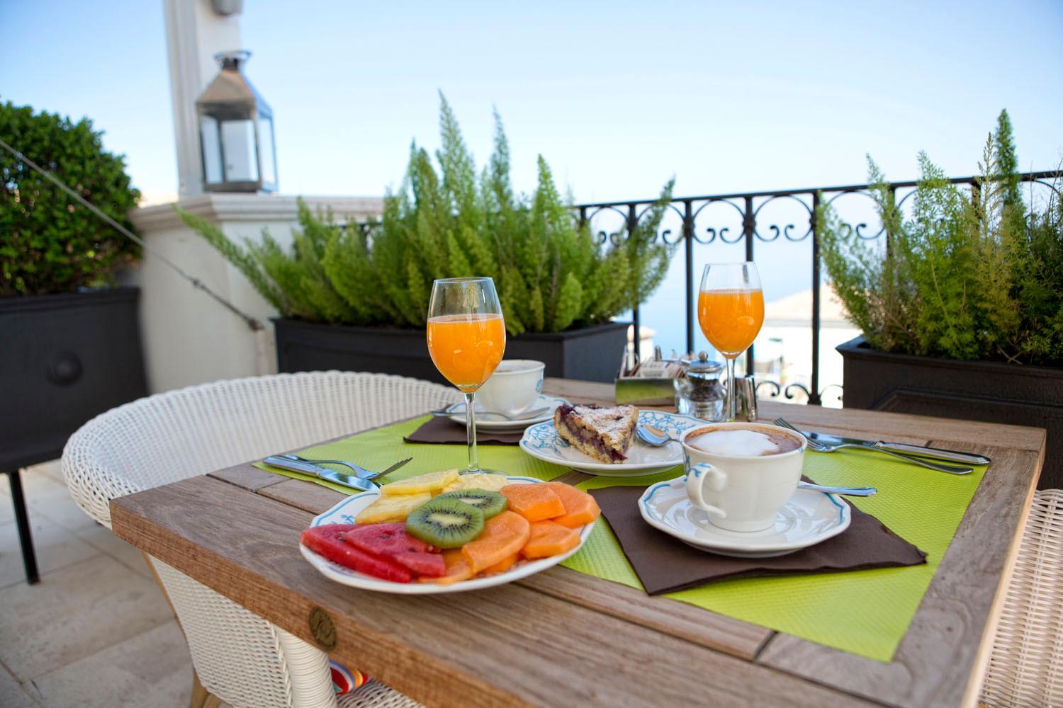 Start your day with a delightful breakfast buffet featuring organic jams and fresh fruits. Unwind with local liqueurs and classic cocktails at the bar or on the sea-view terrace, perfect for a relaxing evening.