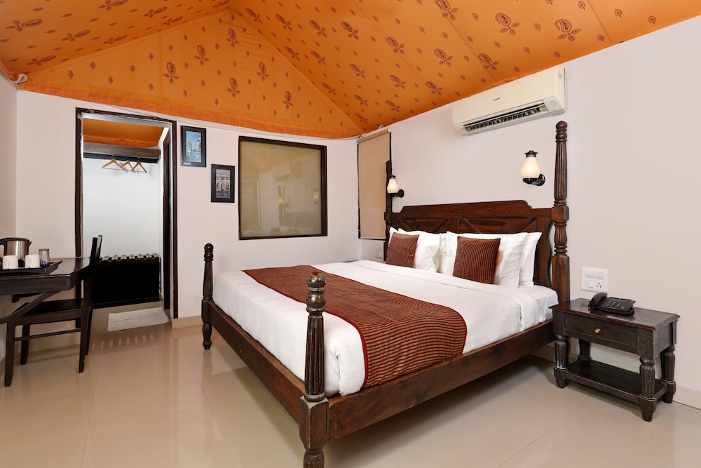 As seasoned travelers to India, we wanted to book something a bit special for the final days of our holiday. We paid 130 euros a night inc. taxes making this the top price hotel we have visited in India In 20 years (except the Taj Palace in Mumbai). We were very very disappointed. This is a tired hotel; badly run and badly maintained. Positives first: The gardens are lovely and most of the staff are very helpful. However, the hotel does not deliver what it promises. We paid (sadly in advance or we would have left after the first night) for a Deluxe Cottage with a lake view. What we got was a grim cottage with no lake view. In the description on Hotels.com it offers a minibar, which suggests it is licensed. What you get is a fridge and there is no alcohol available here.There is only wifi in reception. There is no wardrobe - just a rail with no coat hangers. There is limited hot water - only available a few hours a day. The pool is fine but there are only four sun loungers, two of which are broken and no mattresses. We had to ask for toilet paper. As the roof of the cottage is canvas, noise is very disturbing, and all night parties and dogs constantly barking made for sleepless nights. The restaurant is poor. We paid for 1/2 board, but after the first night we ate elsewhere. The food in the breakfast buffet was lukewarm or cold, and the toaster for self service toast was filthy dirty. This is the only hotel we have ever visited in India with no welcome drink - enough said.