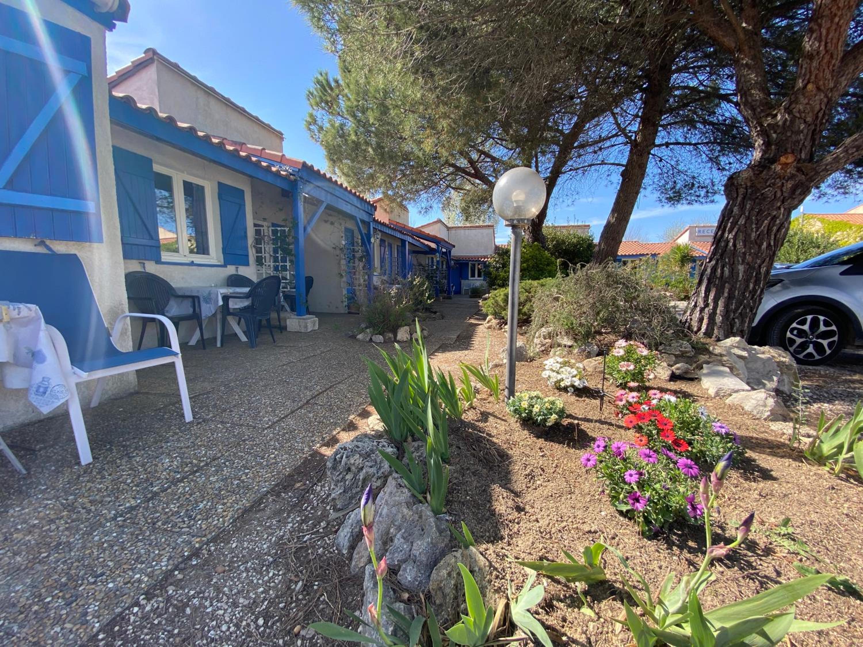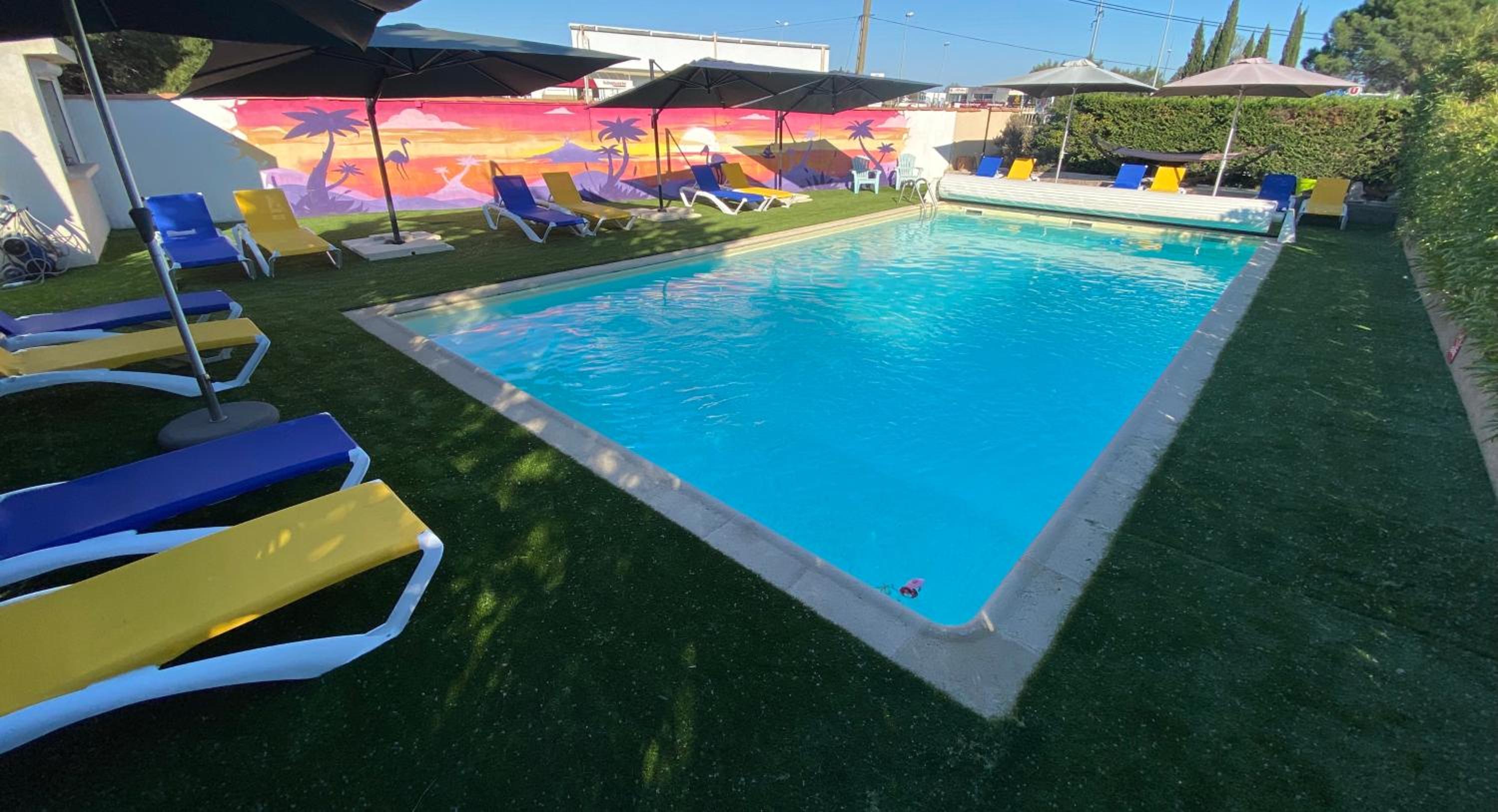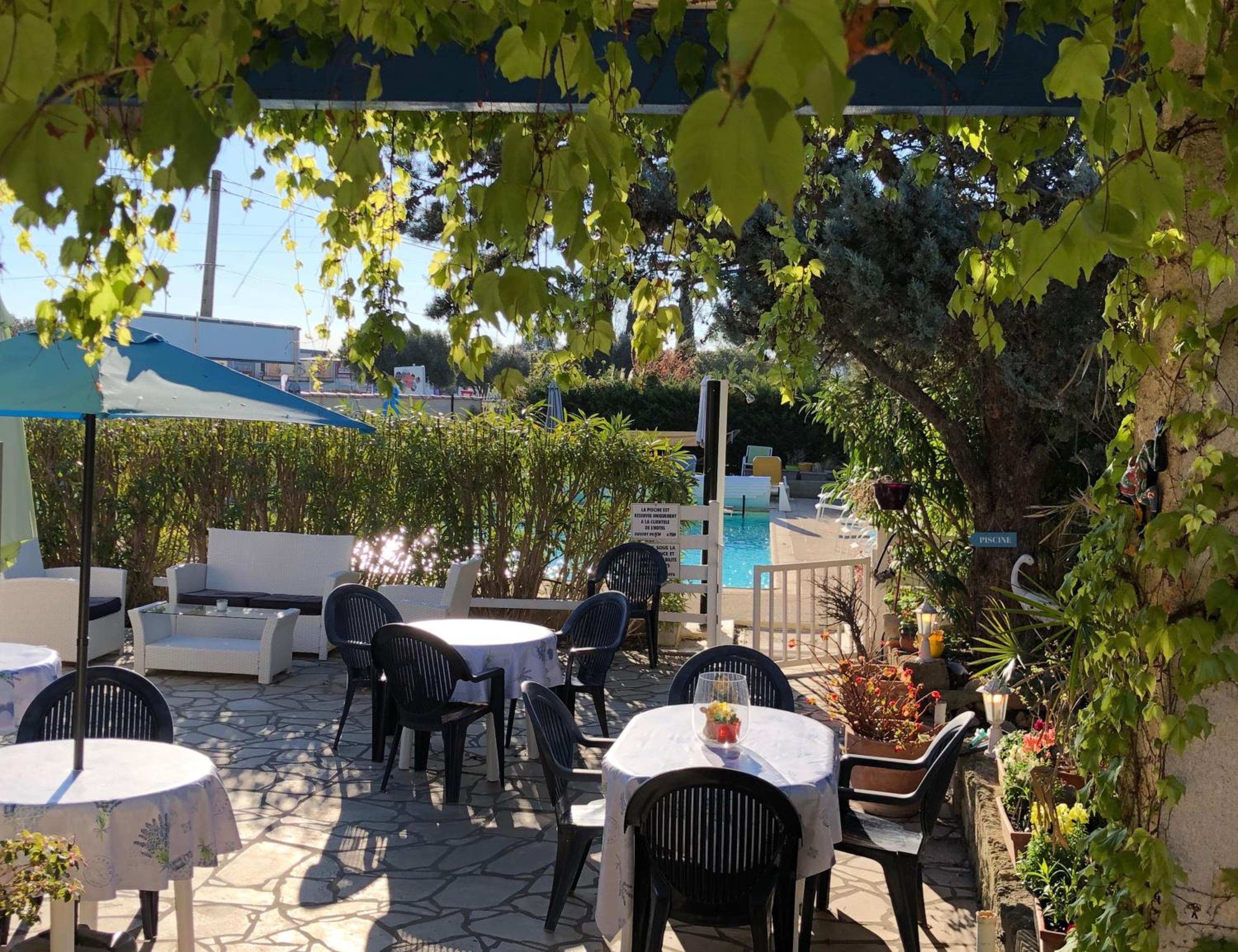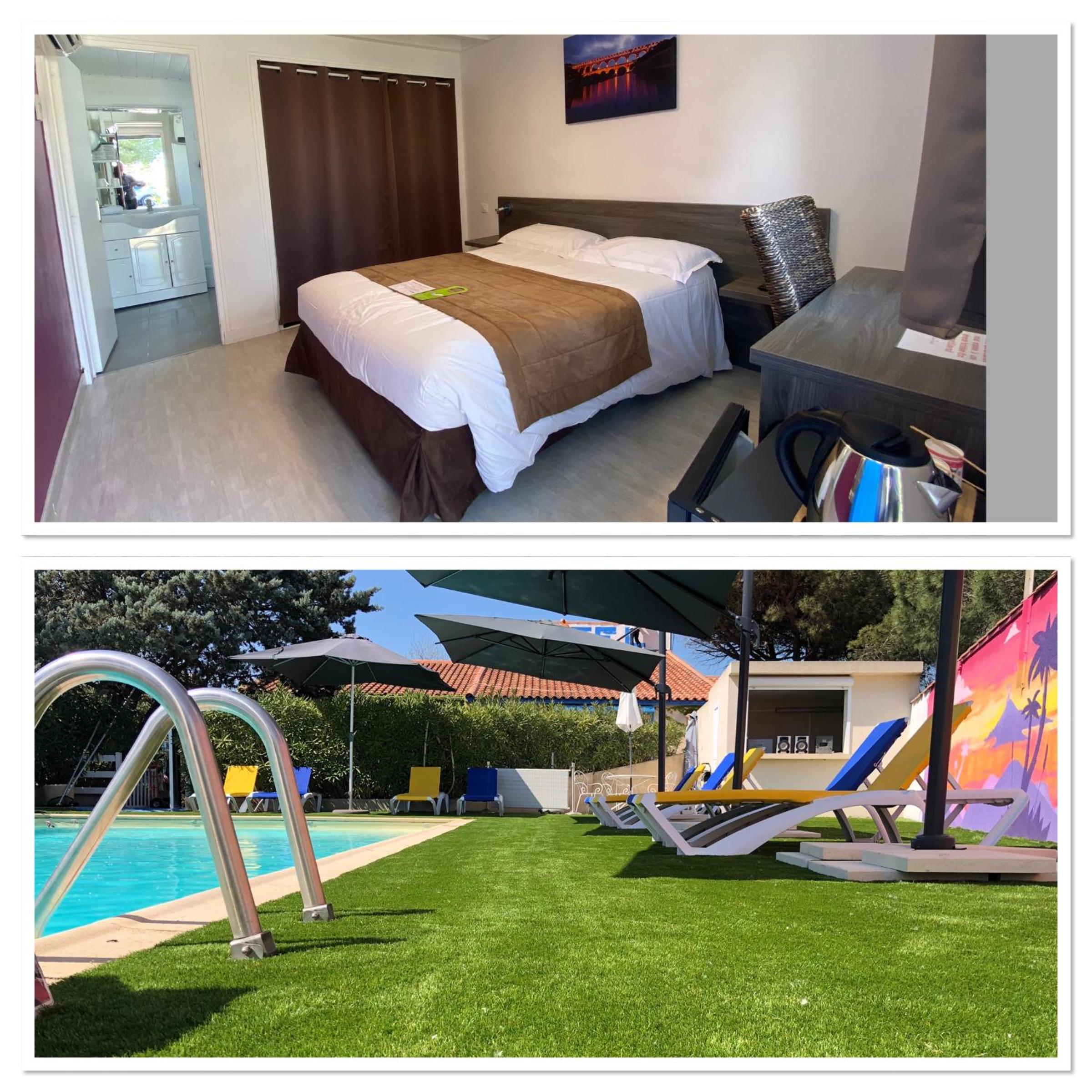 Bel établissement très fleuri avec, des chats très câlins, parking gratuit, piscine, et petite terrasse individuelle si vous voulez casser la croûte, les commerces sont proches à pied, et la voie verte derrière Super U vous emmène jusqu’à Aiguës-Mortes (20 mn à pied)