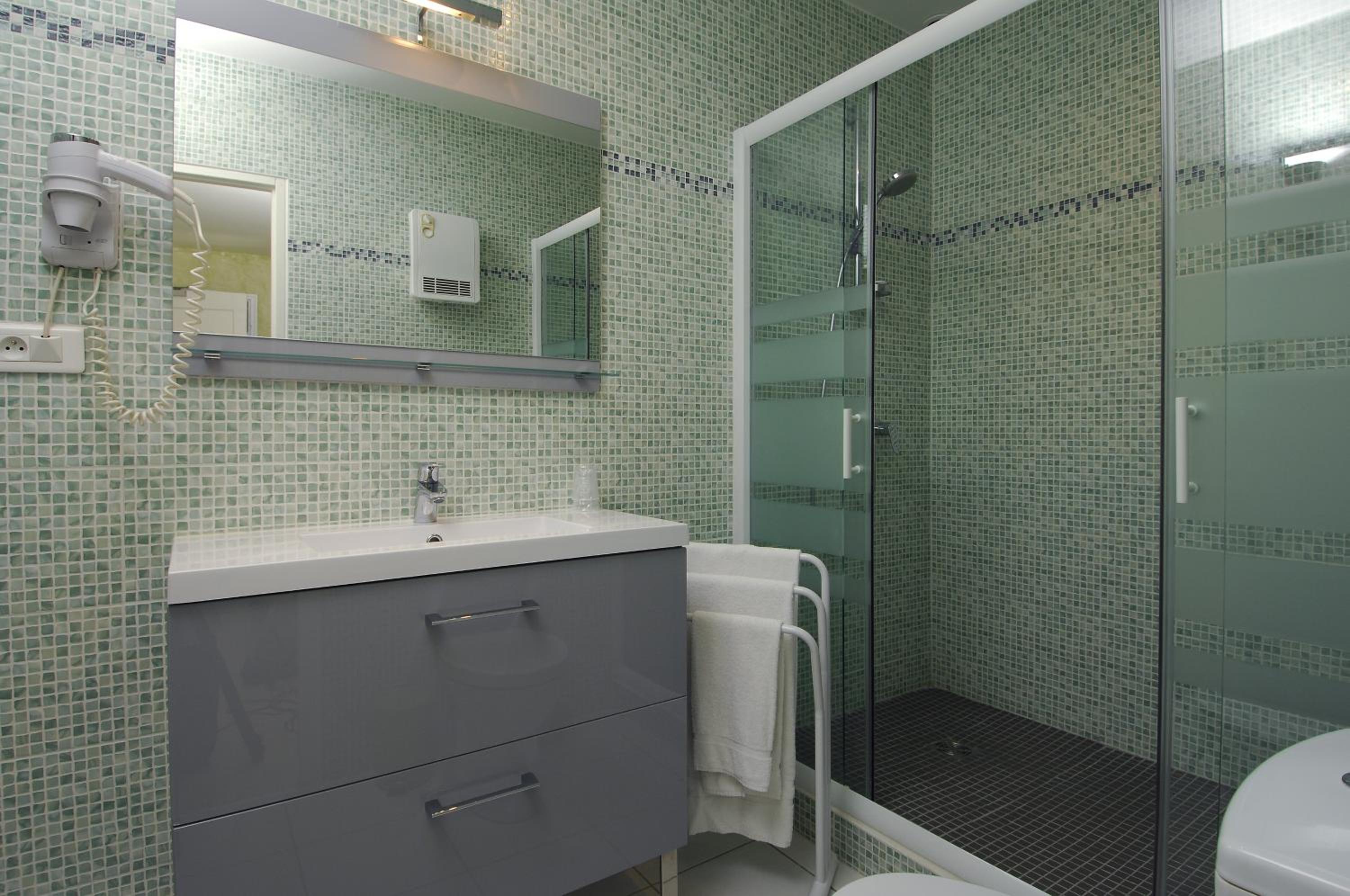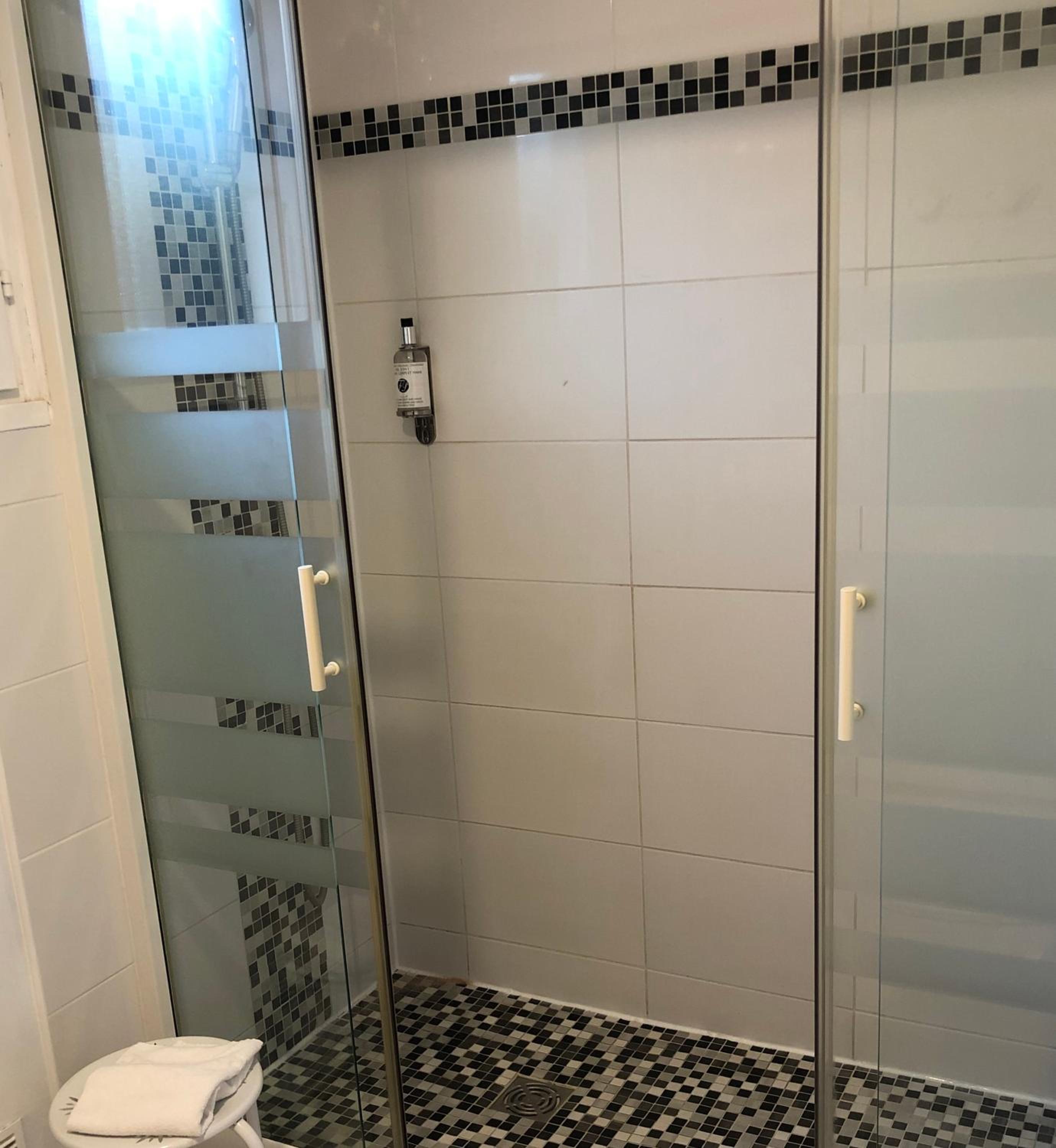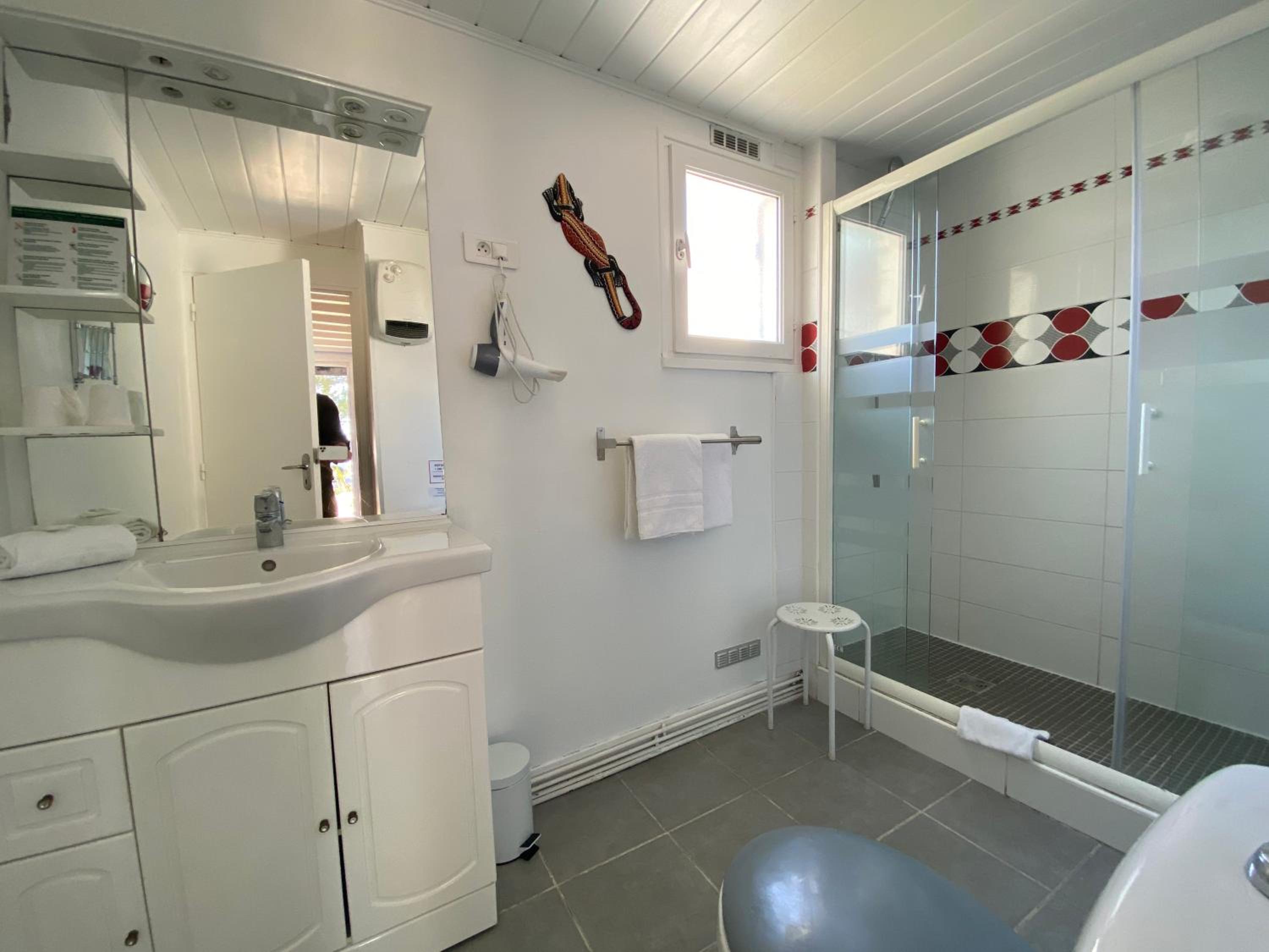 Les chambres sont bien équipées avec Clim, petit frigo, bouilloire, SdD spacieuse.