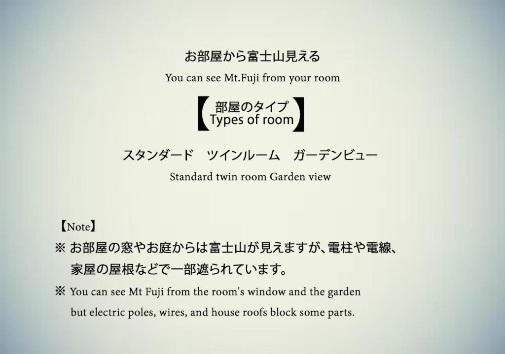 Vue sur le mont Fuji, taille de la chambre, la terrasse avec jardin, bon petit déjeuner apporté en chambre.