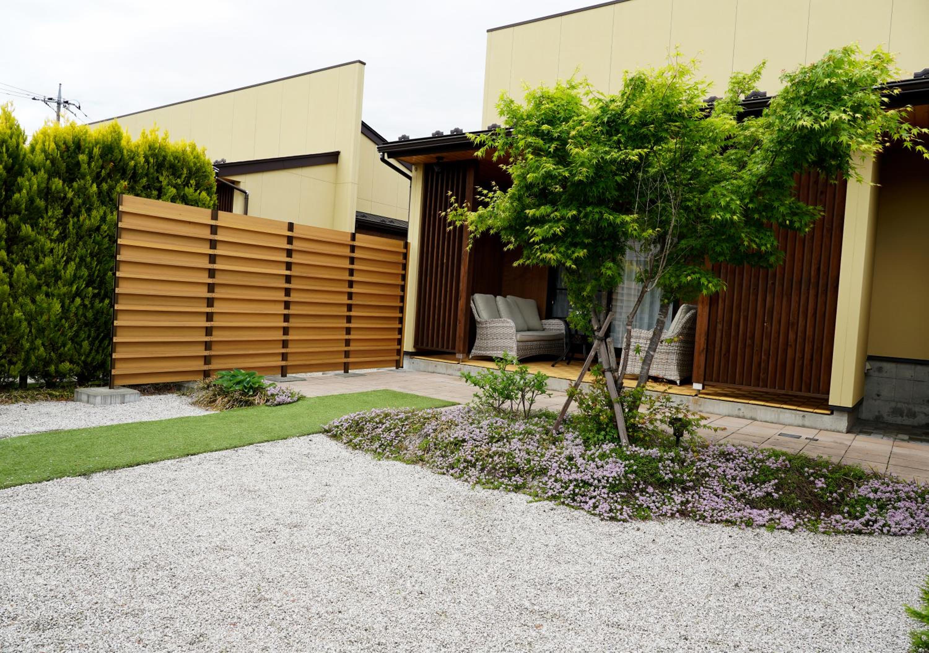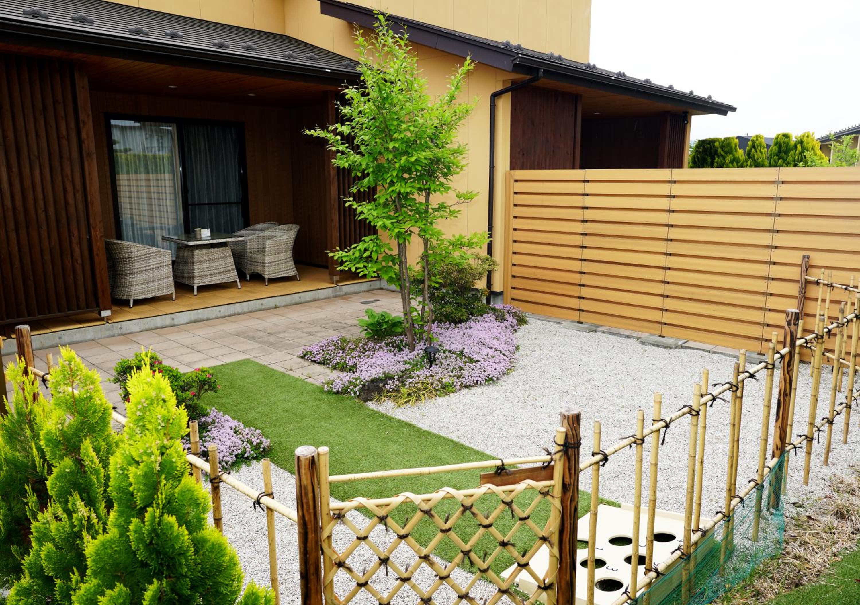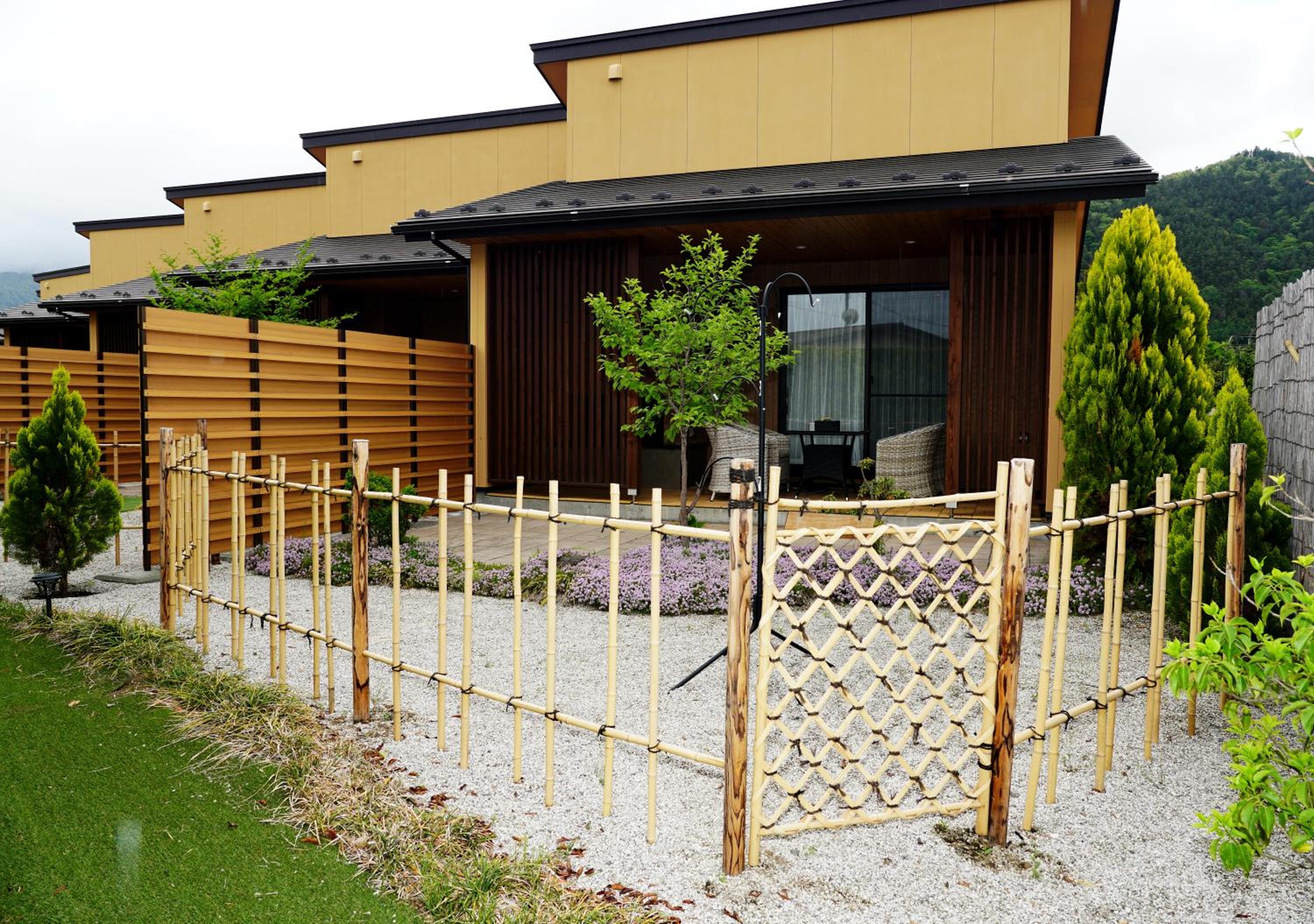 Escape to Hananoyado Yumefuji in Fujikawaguchiko, where each room offers a serene private garden with a terrace, perfect for unwinding after a day of exploration.