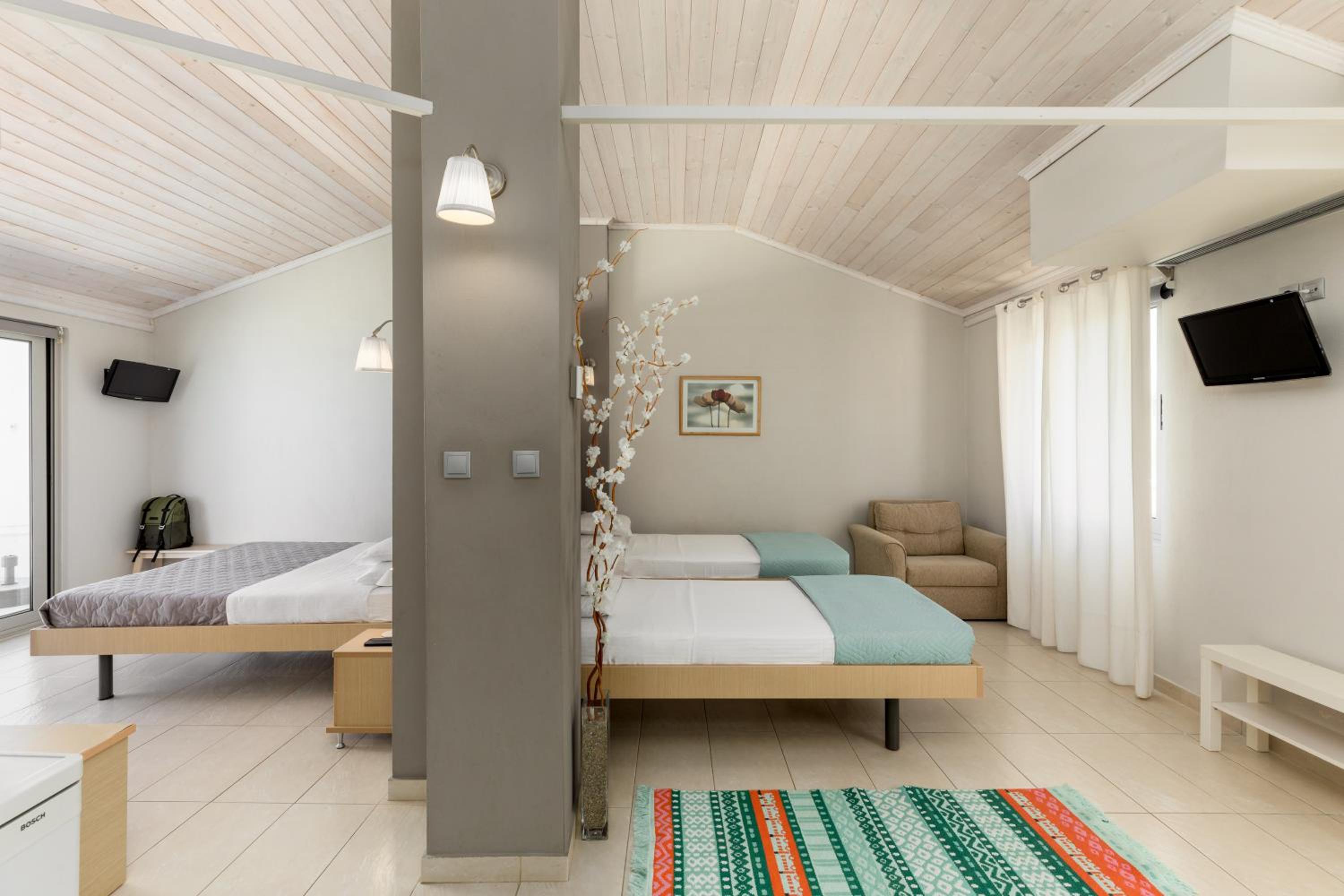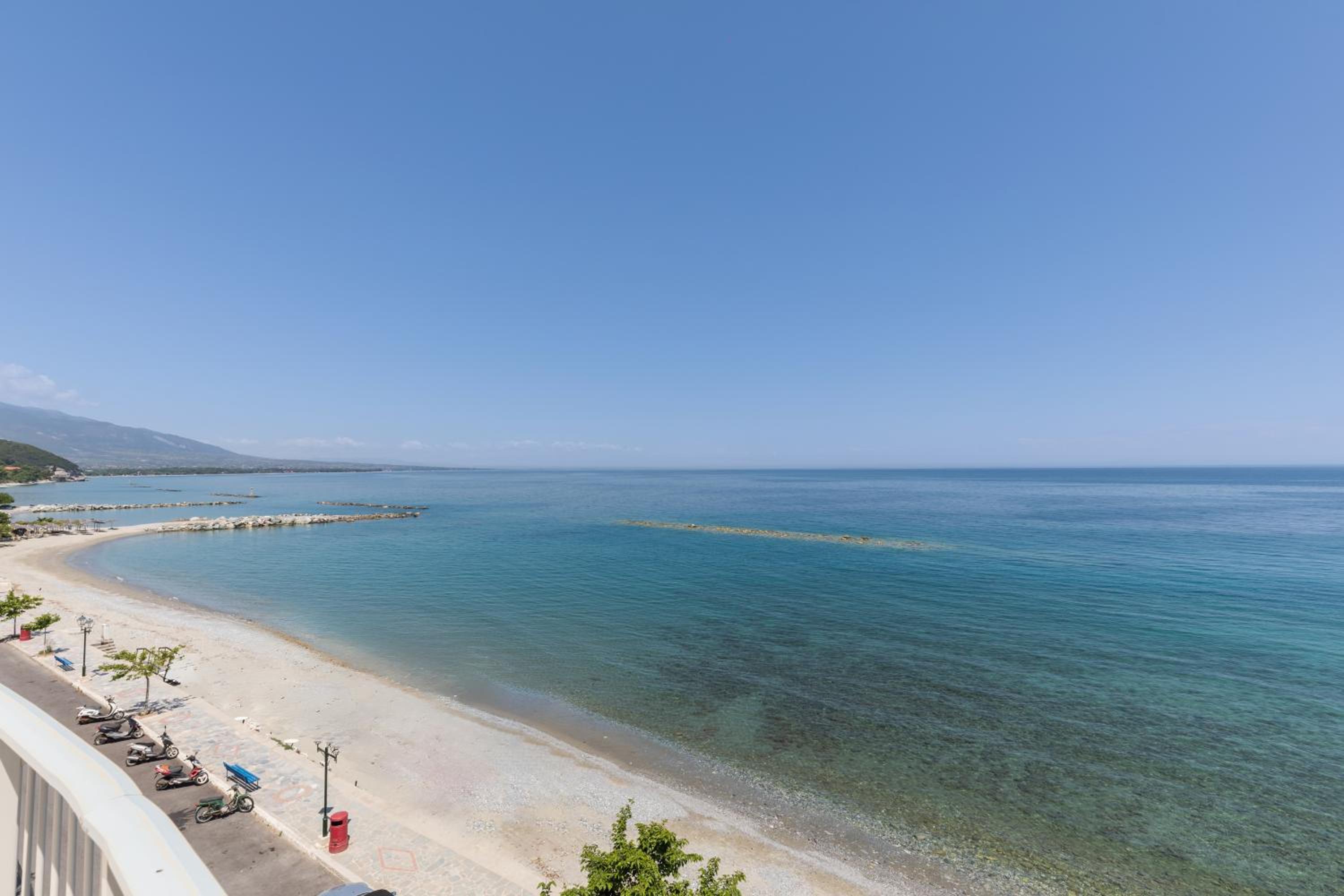 Indulge in the breathtaking views of the Thermaikos Gulf from your private balcony at Zefyros Sea View Hotel. The air-conditioned rooms are elegantly designed with modern amenities, offering a comfortable stay for guests.